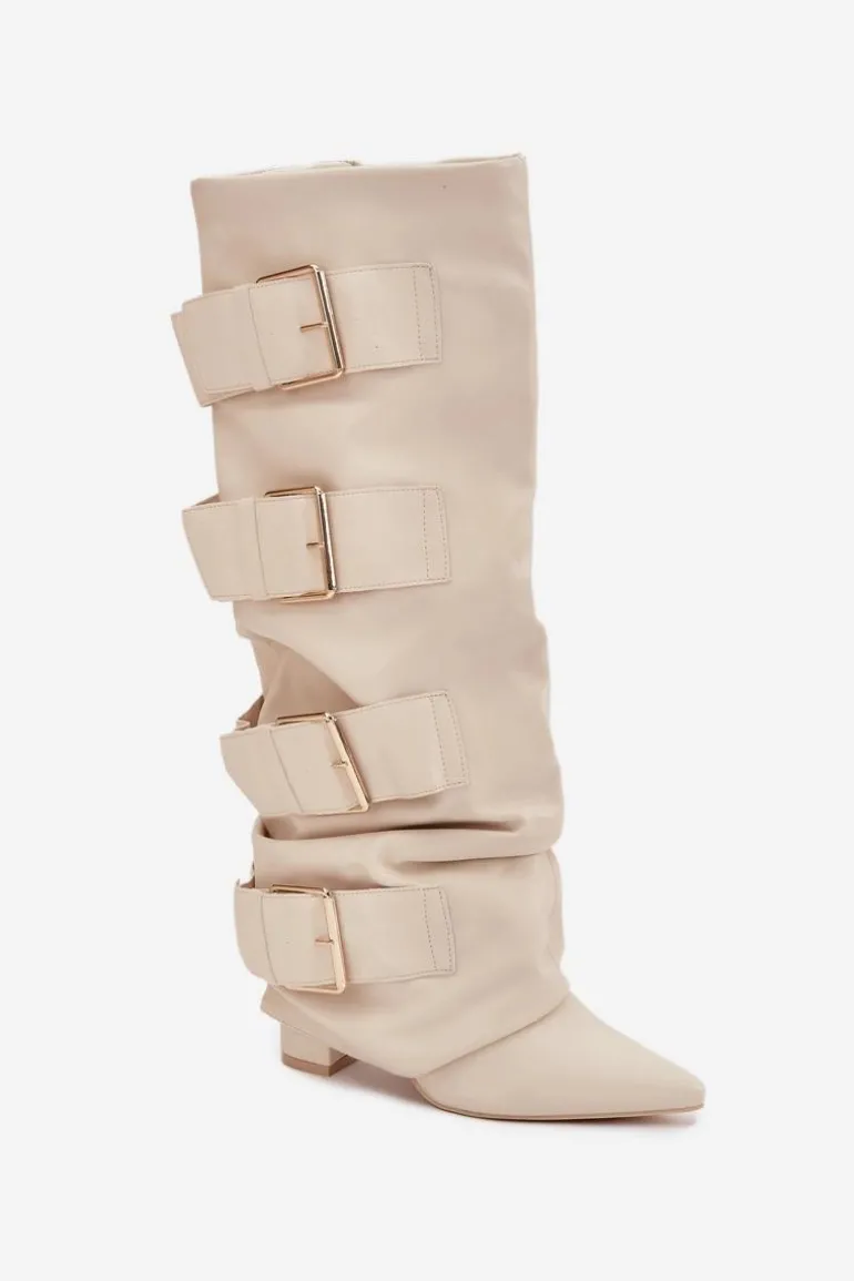 Stylowe kozaki damskie z eko skóry to połączenie elegancji i nowoczesnego wyglądu. Osadzone na obcasie typu słupek, ze szpiczastymi noskami, podkreślają kobiecą sylwetkę. Wywinięta cholewka, ozdobiona złotymi klamrami, przyciąga wzrok i dodaje charakteru, a zamek ułatwia szybkie zakładanie i zdejmowanie. Doskonale komponują się z sukienkami i spódnicami, wprowadzając modny, wyrafinowany akcent do każdej stylizacji. Przy wyborze rozmiaru prosimy sugerować się tabelą rozmiarów.