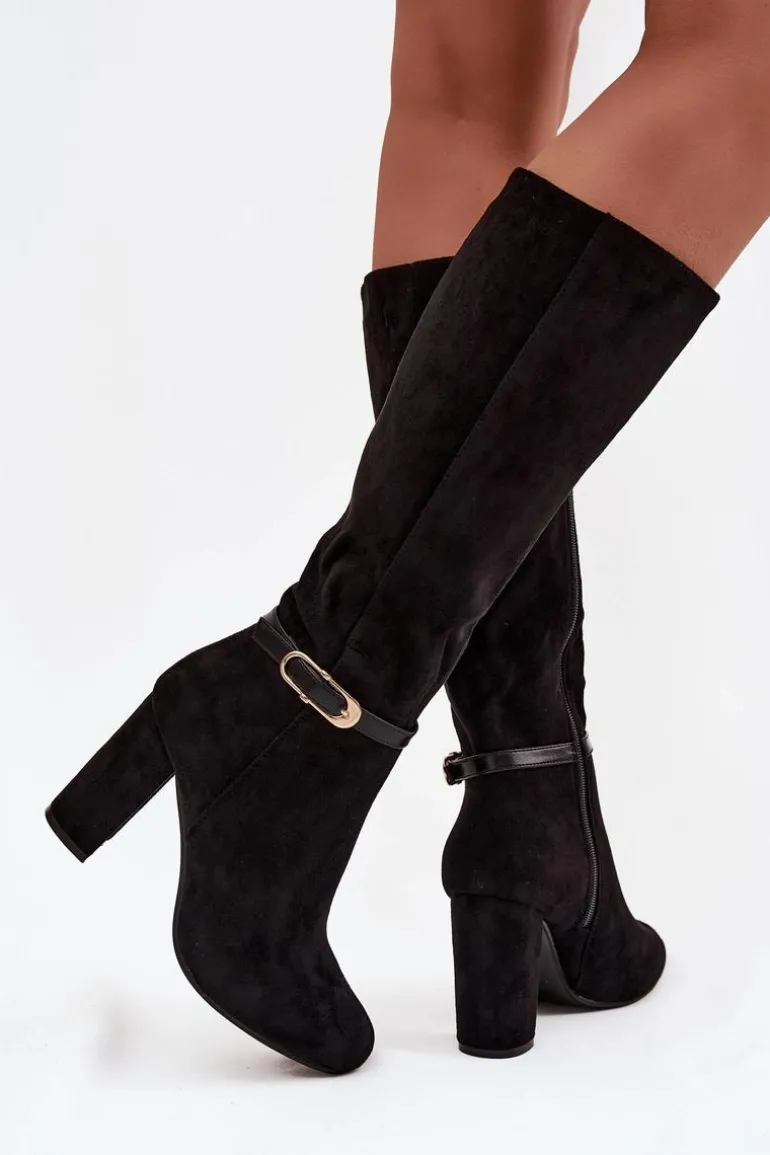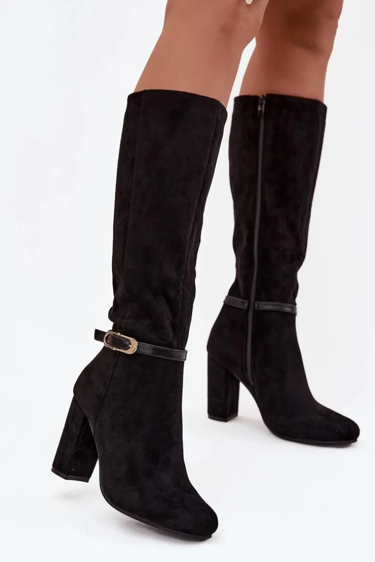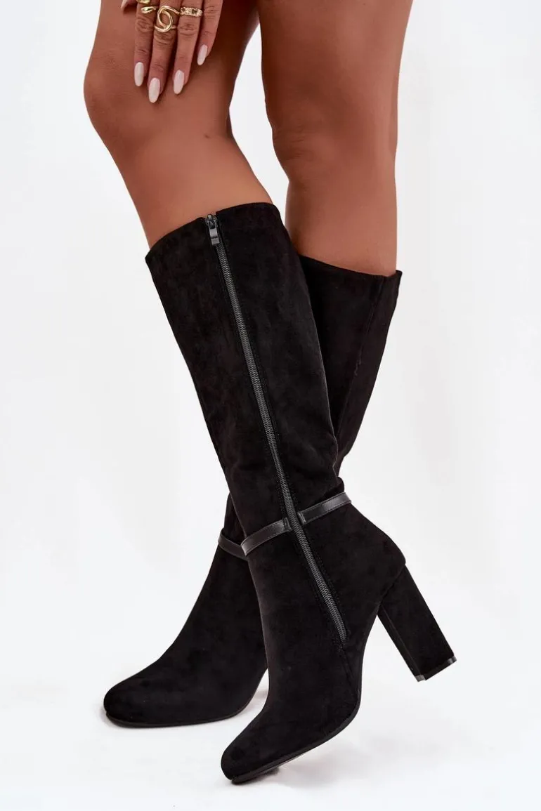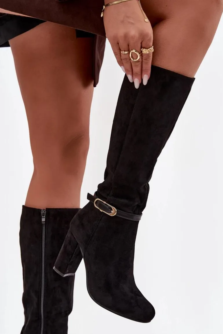 Kozaki damskie wykonane z eko zamszu to elegancka propozycja, która świetnie sprawdzi się w sezonie jesienno-zimowym. Klasyczny fason został urozmaicony subtelnym paseczkiem ze złotą klamrą umieszczonym na cholewce, co nadaje całości szyku i kobiecego charakteru. Model osadzony został na stabilnym obcasie typu słupek, który wysmukla sylwetkę, a jednocześnie zapewnia wygodę podczas noszenia. Zaokrąglone noski podkreślają ponadczasowy styl butów, a wnętrze ocieplone miękkim kocem obuwniczym gwarantuje komfort i ciepło w chłodniejsze dni. To kozaki, które doskonale dopełnią eleganckie stylizacje, ale równie dobrze sprawdzą się w codziennym wydaniu. Przy wyborze rozmiaru prosimy sugerować się tabelą rozmiarów.