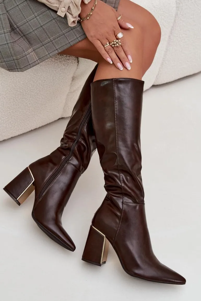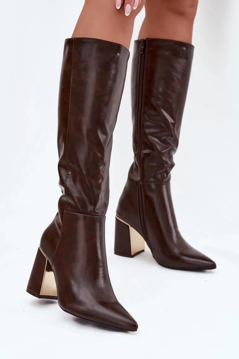 Kozaki na słupku ze złotym akcentem to elegancka propozycja dla kobiet. Model ze szpiczastymi noskami i cholewką sięgającą przed kolano podkreśla kobiecą sylwetkę, a zamek zapewnia łatwe zakładanie i idealne dopasowanie do nogi. Świetnie sprawdzą się w stylizacjach z sukienkami i spódnicami. Przy wyborze rozmiaru prosimy sugerować się tabelą rozmiarów.