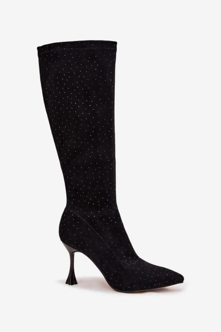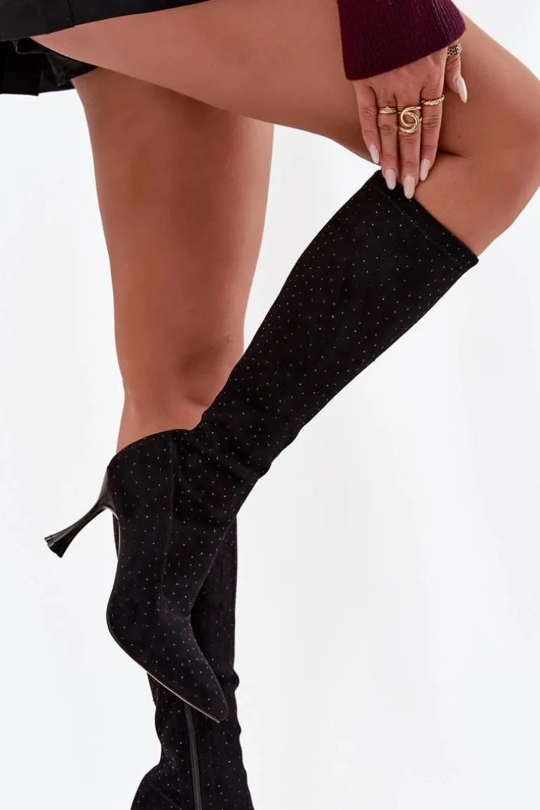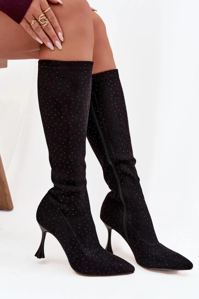 Kozaki damskie wykonane z miękkiego eko zamszu to propozycja dla kobiet, które poszukują elegancji z nutą glamour. Model osadzony na smukłym obcasie typu szpilka pięknie wysmukla nogi i podkreśla sylwetkę. Uwagę przyciąga efektowne zdobienie na całej cholewce, które nadaje wyjątkowego, wieczorowego charakteru. Zamek z boku ułatwia zakładanie. Szpiczaste noski. To idealne kozaki na wieczorne wyjścia, imprezy czy eleganckie okazje, gdy chcesz wyglądać stylowo i kobieco. Przy wyborze rozmiaru prosimy sugerować się tabelą rozmiarów.