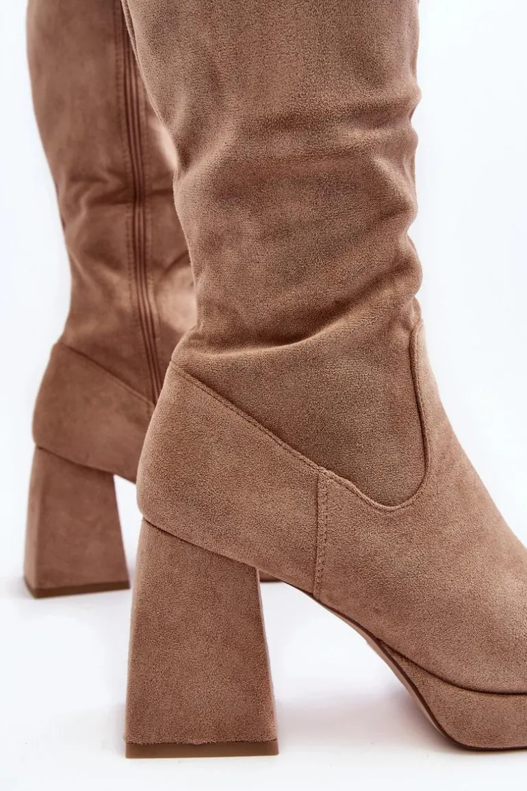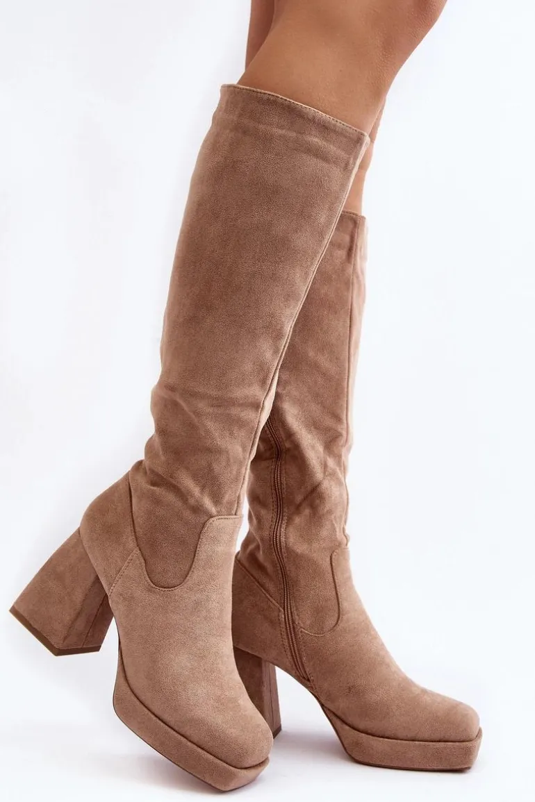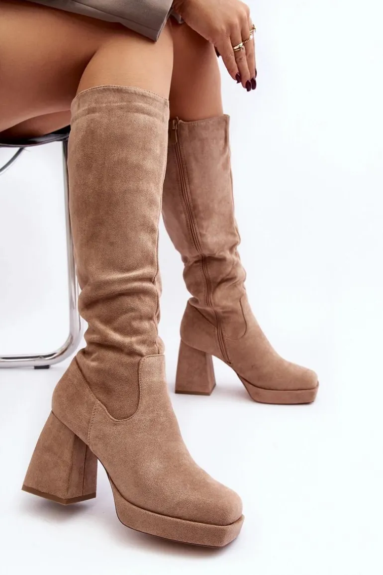 Damskie kozaki z cholewką do kolana. Osadzone na masywnym platformie i obcasie w postaci słupka. Model ten zapinany jest suwakiem z boku. W środku ocieplone kocem obuwniczym. Noski w kwadrat. Idealne do sukienek czy spódnic! Przy wyborze rozmiaru prosimy sugerować się tabelą rozmiarów.