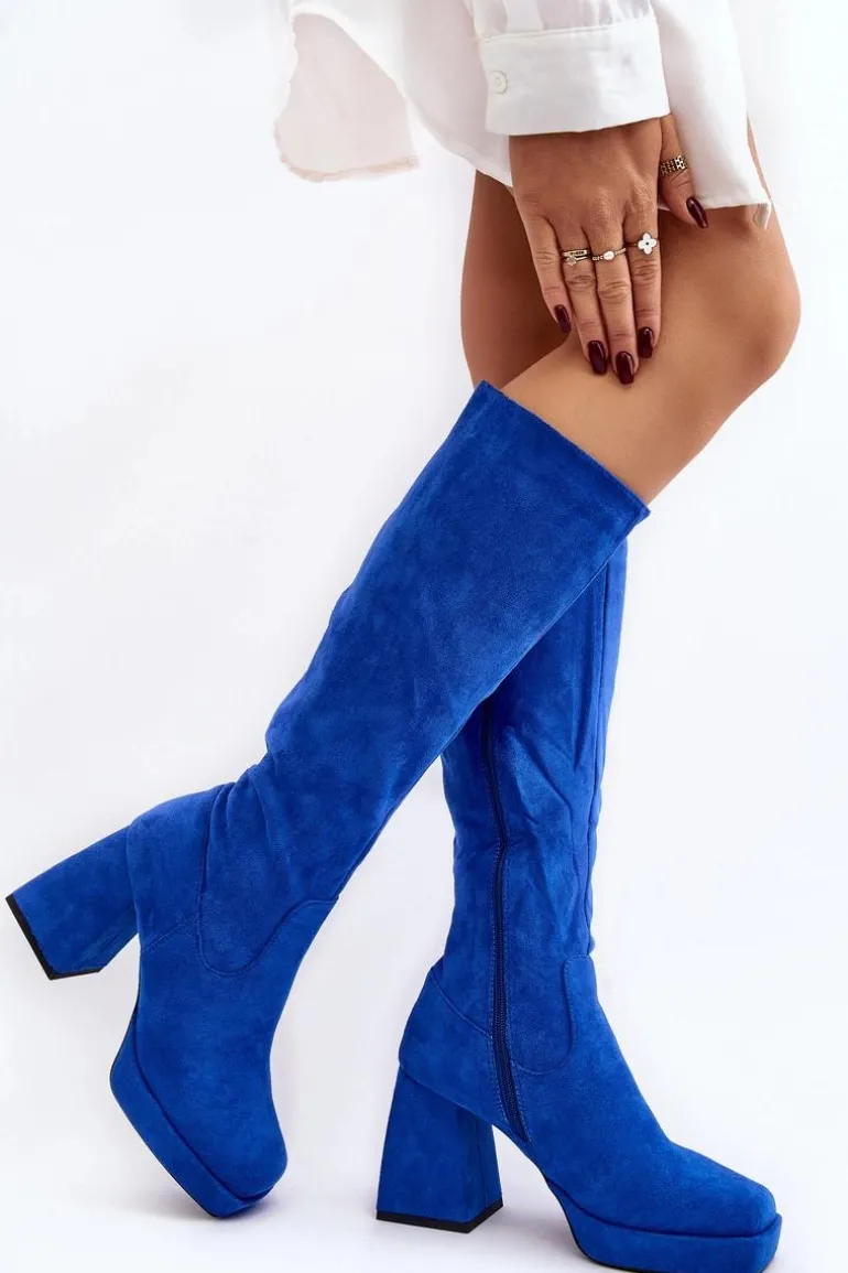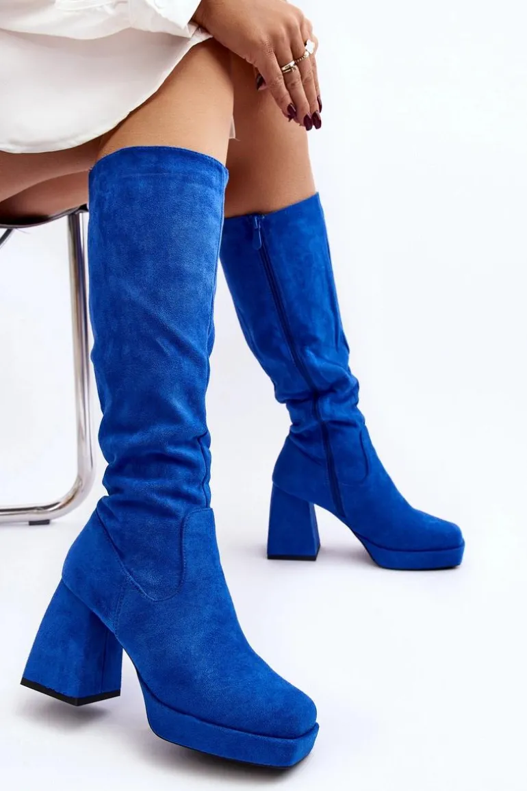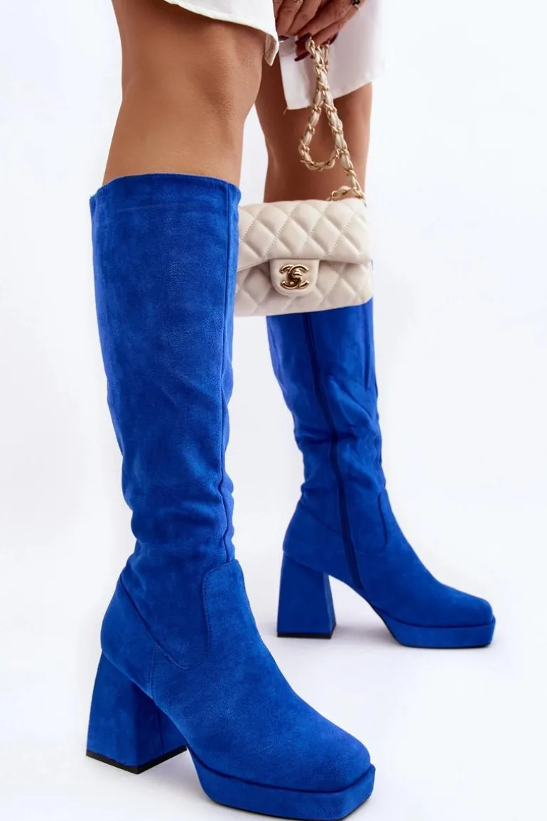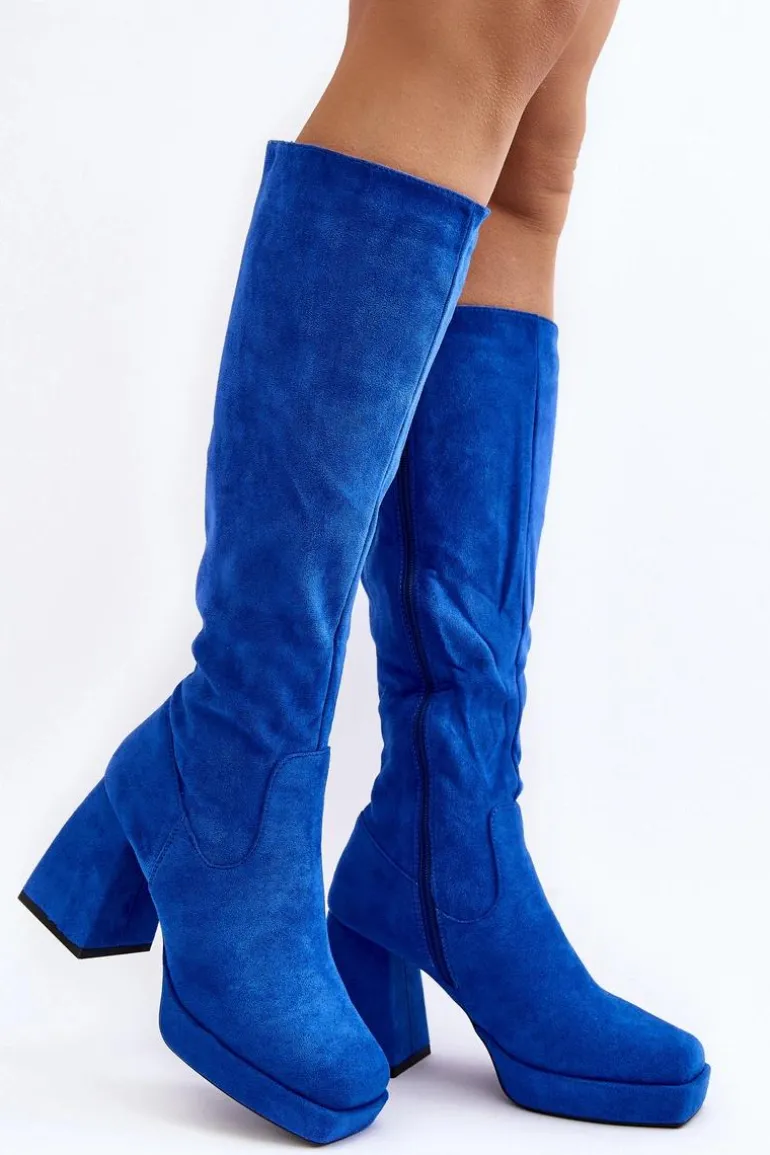 Damskie kozaki z cholewką do kolana. Osadzone na masywnym platformie i obcasie w postaci słupka. Model ten zapinany jest suwakiem z boku. W środku ocieplone kocem obuwniczym. Noski w kwadrat. Idealne do sukienek czy spódnic! Przy wyborze rozmiaru prosimy sugerować się tabelą rozmiarów.