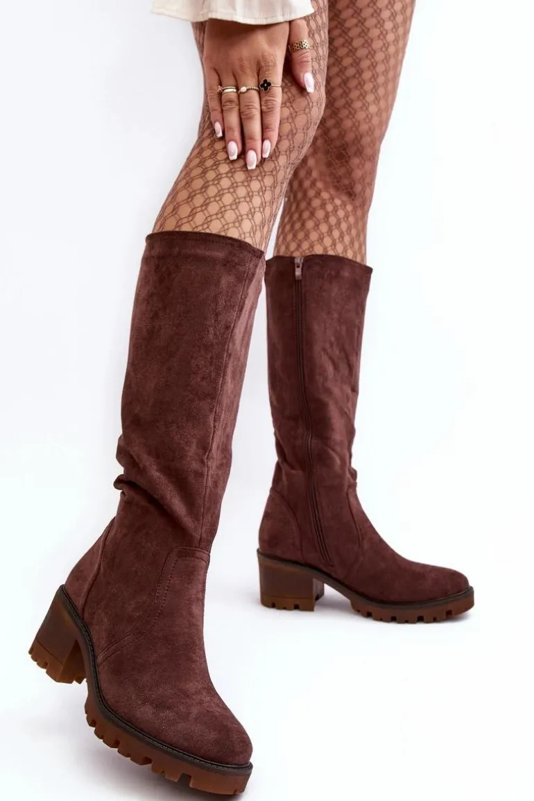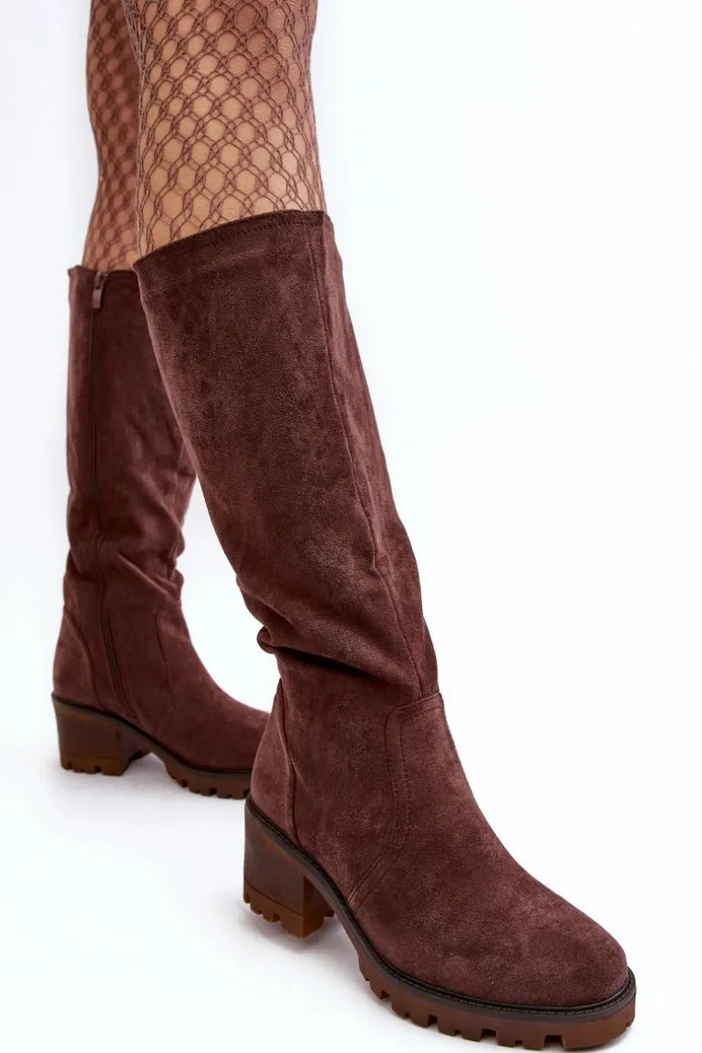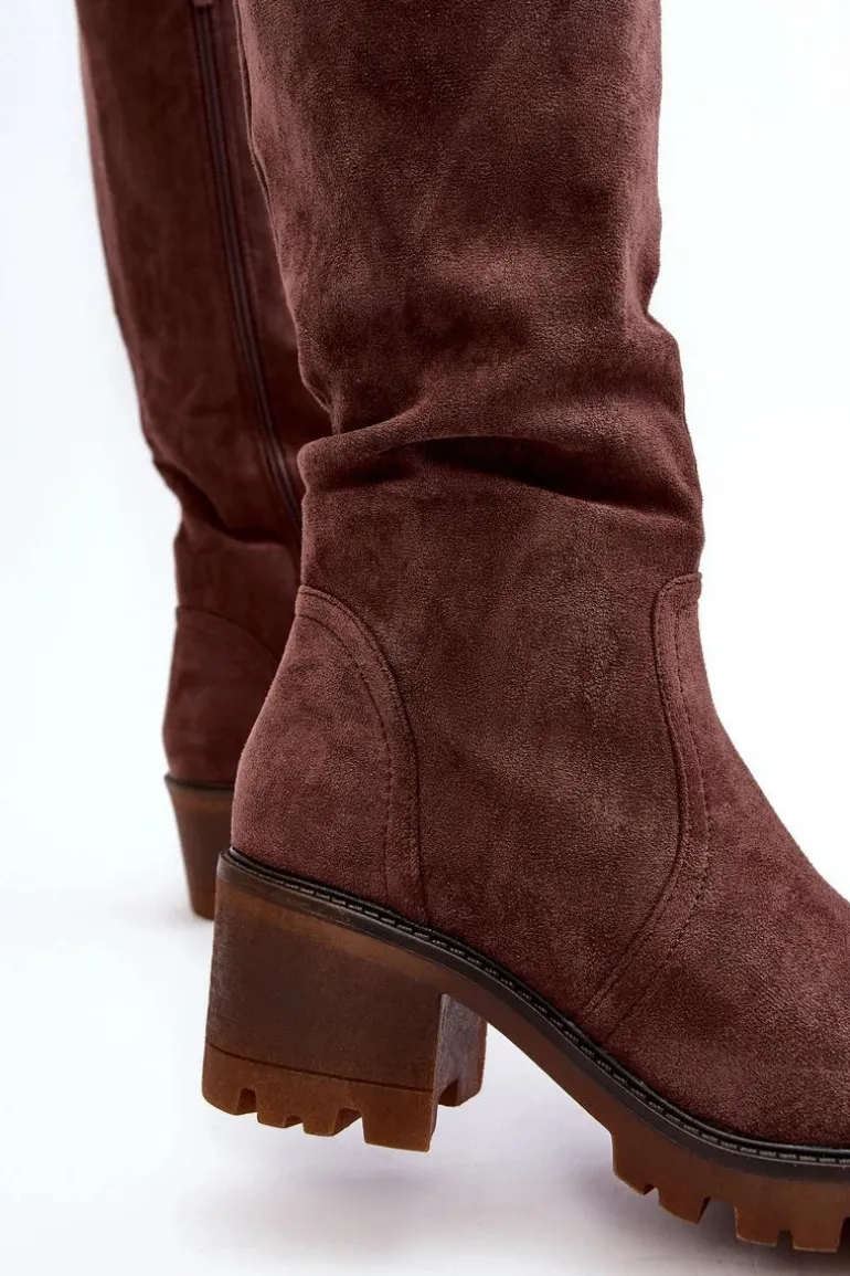 Kozaki damskie z cholewką przed kolano. Wykonane z eko zamszu. Zapinane na suwak. Osadzone na niskim, masywnym obcasie. Zapiętek usztywniany. Noski zaokrąglone Wykorzystasz je w wielu stylizacjach! Koniecznie muszą być Twoje! Przy wyborze rozmiaru prosimy sugerować się tabelą rozmiarów.