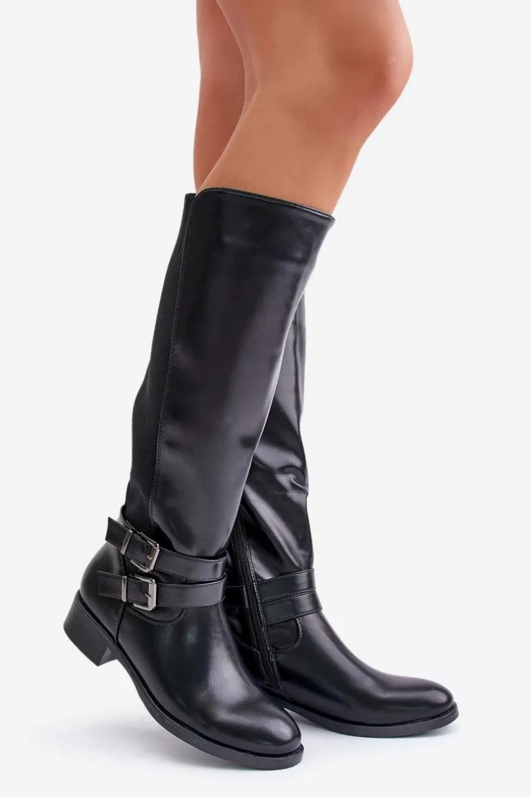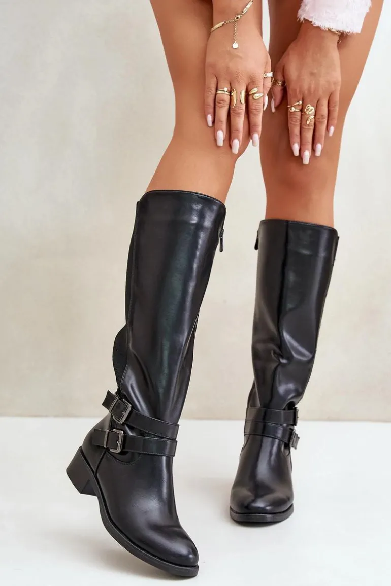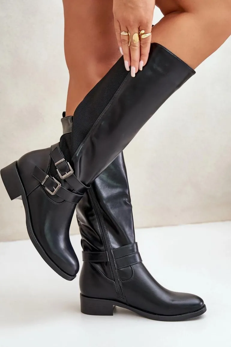 Damskie kozaki o klasycznym kroju, wykonane z eko skóry. Osadzone na płaskim obcasie, co zapewnia wygodę noszenia na co dzień. Noski zaokrąglone, a cholewka sięga przed kolano, dodając elegancji i wydłużając sylwetkę. Zapinane na zamek, ułatwiający zakładanie. Dodatkowym atutem są ozdobne paski ze złotymi klamrami, które nadają wyjątkowego charakteru. Przy wyborze rozmiaru prosimy sugerować się tabelą rozmiarów.