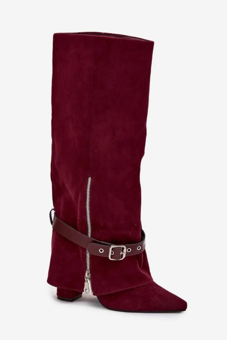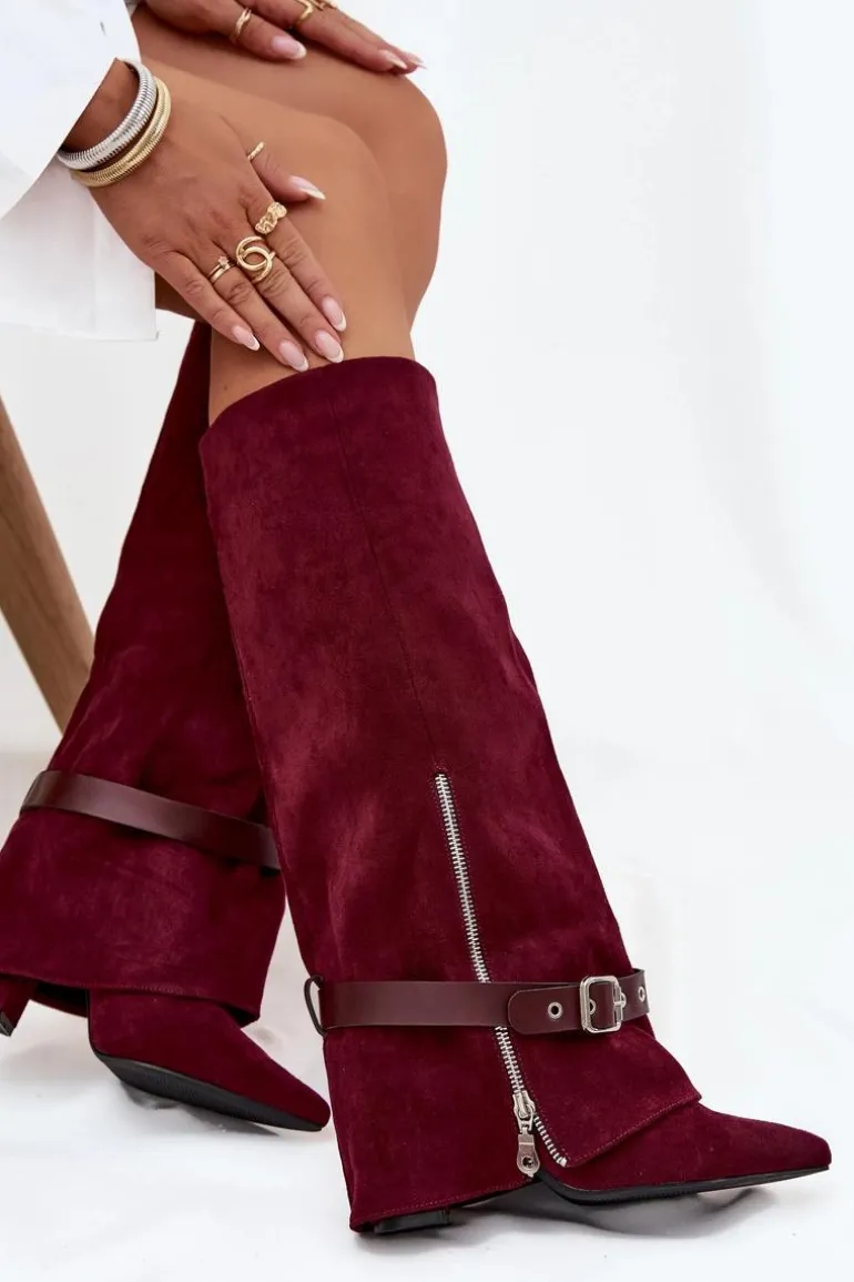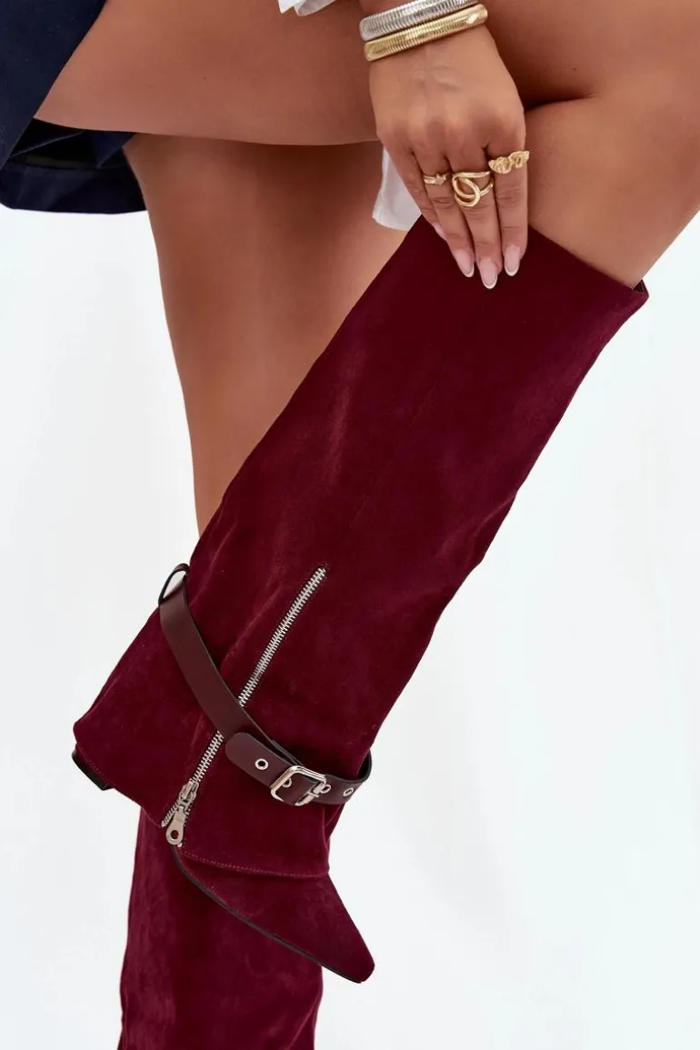 Wsuwane kozaki damskie przed kolano to elegancka i stylowa propozycja, która łączy klasykę z nowoczesnym akcentem. Model ze szpiczastymi noskami i obcasem typu słupek subtelnie wysmukla sylwetkę, a cholewka nachodząca na obcas nadaje całości wyjątkowego charakteru. Dodatkowy pasek z ozdobną klamrą można ściągnąć lub dowolnie ustawić, zmieniając styl butów i dopasowując je do różnych stylizacji. Idealne do sukienek, spódnic, jak i eleganckich zestawów casualowych, wprowadzają modny, kobiecy akcent do każdej garderoby. Przy wyborze rozmiaru prosimy sugerować się tabelą rozmiarów.