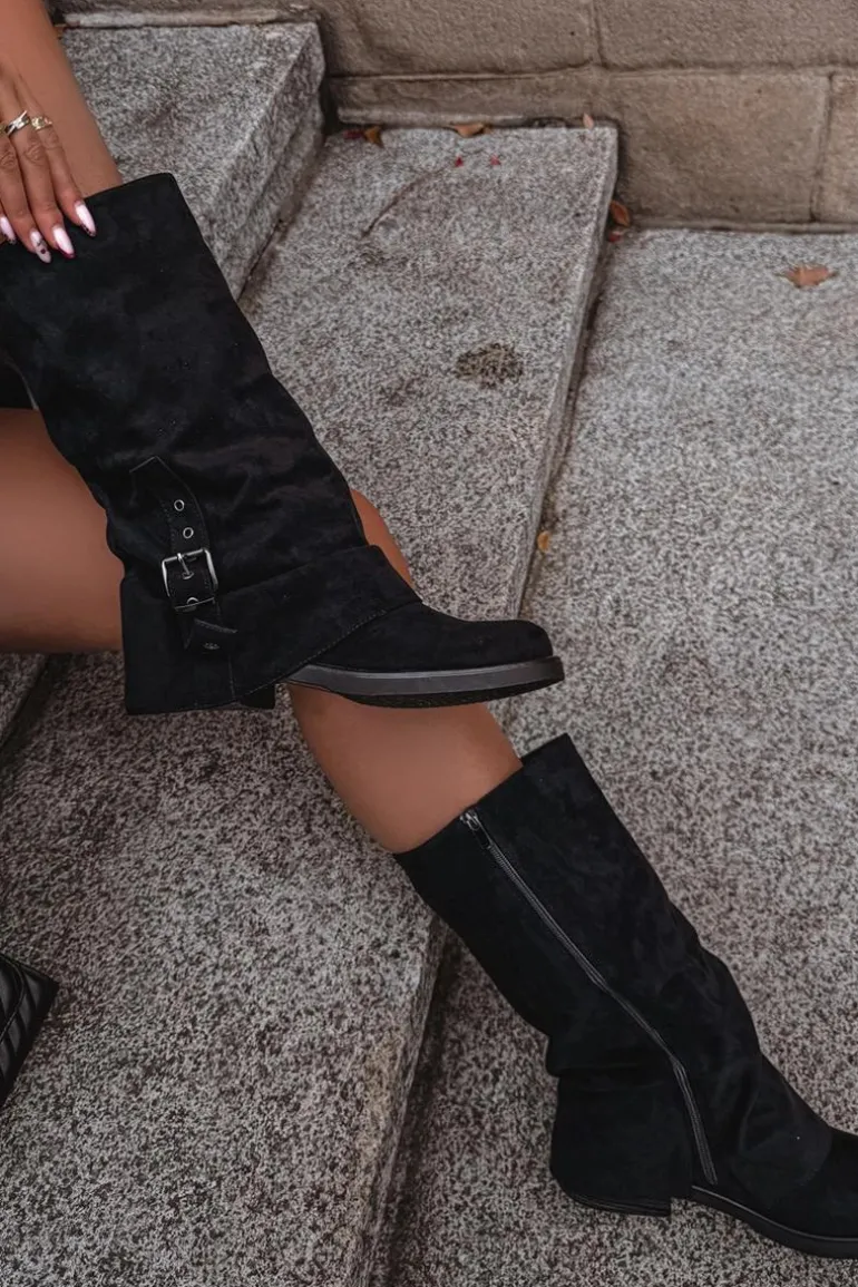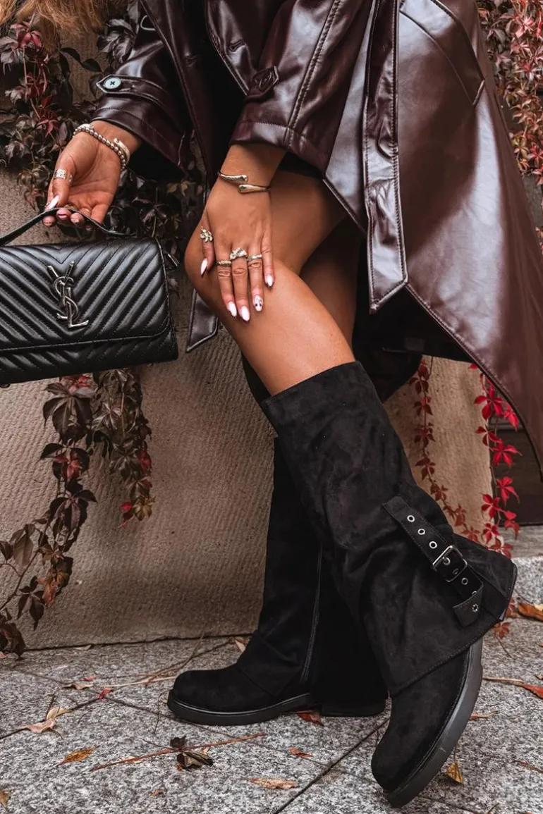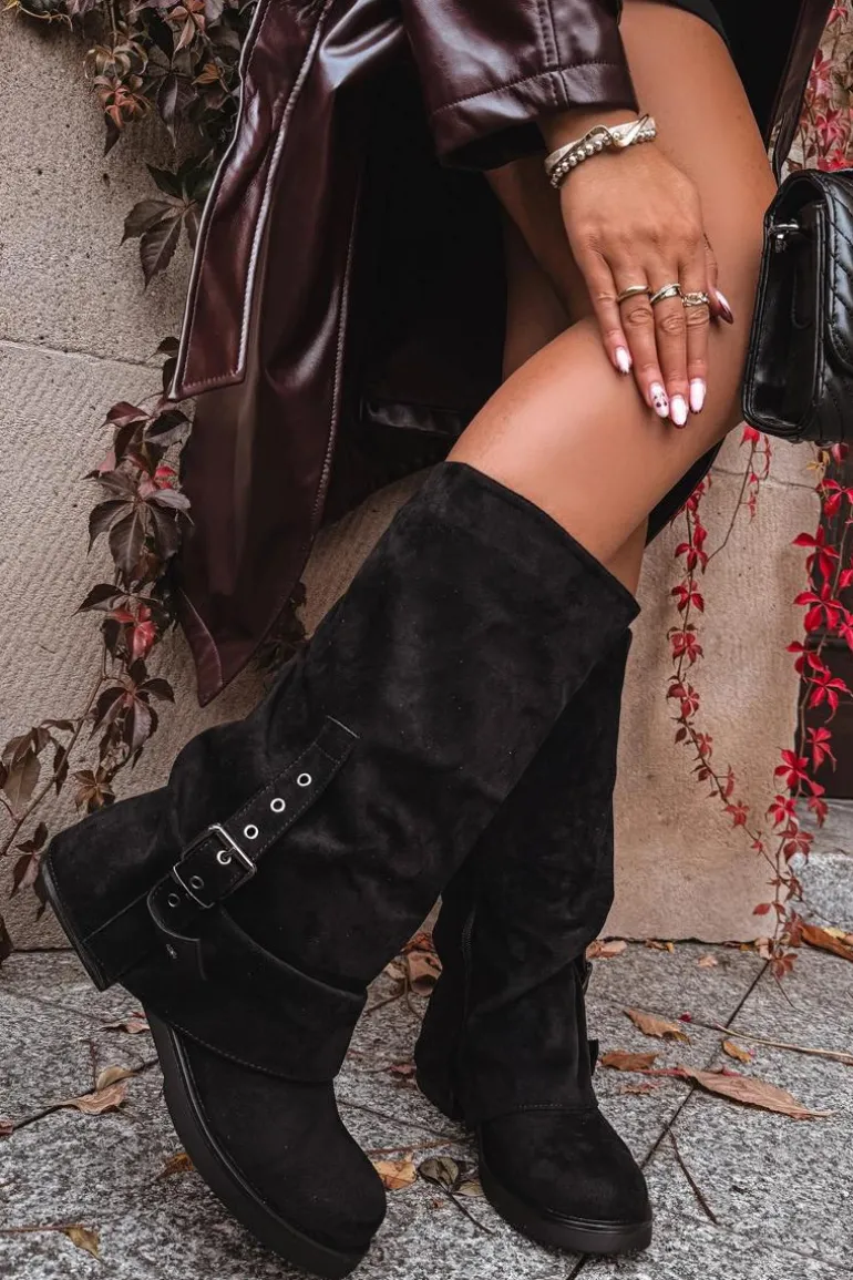 Stylowe kozaki damskie z eko zamszu to doskonałe połączenie wygody i modnego wyglądu. Wykonane z miękkiego, przyjemnego w dotyku materiału, prezentują się wyjątkowo elegancko i sprawdzą się zarówno w codziennych, jak i bardziej stylowych zestawach. Model osadzony jest na płaskim obcasie, dzięki czemu zapewnia komfort podczas chodzenia. Charakterystyczna marszczona cholewka nadaje im lekkości i nowoczesnego wyglądu, a ozdobny pasek z klamrą u dołu stanowi subtelny, stylowy akcent. Zaokrąglone noski dodają całości delikatności, a zamek błyskawiczny z boku ułatwia zakładanie i zdejmowanie butów. To idealna propozycja dla kobiet ceniących modny wygląd bez rezygnacji z wygody.Kozaki świetnie komponują się z dopasowanymi spodniami, spódnicami midi oraz dzianinowymi sukienkami – tworząc stylowe zestawy. Przy wyborze rozmiaru prosimy sugerować się tabelą rozmiarów.