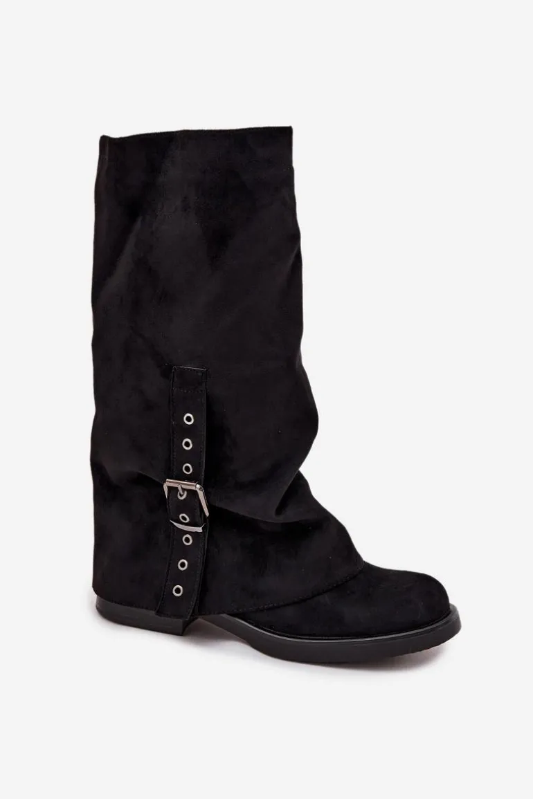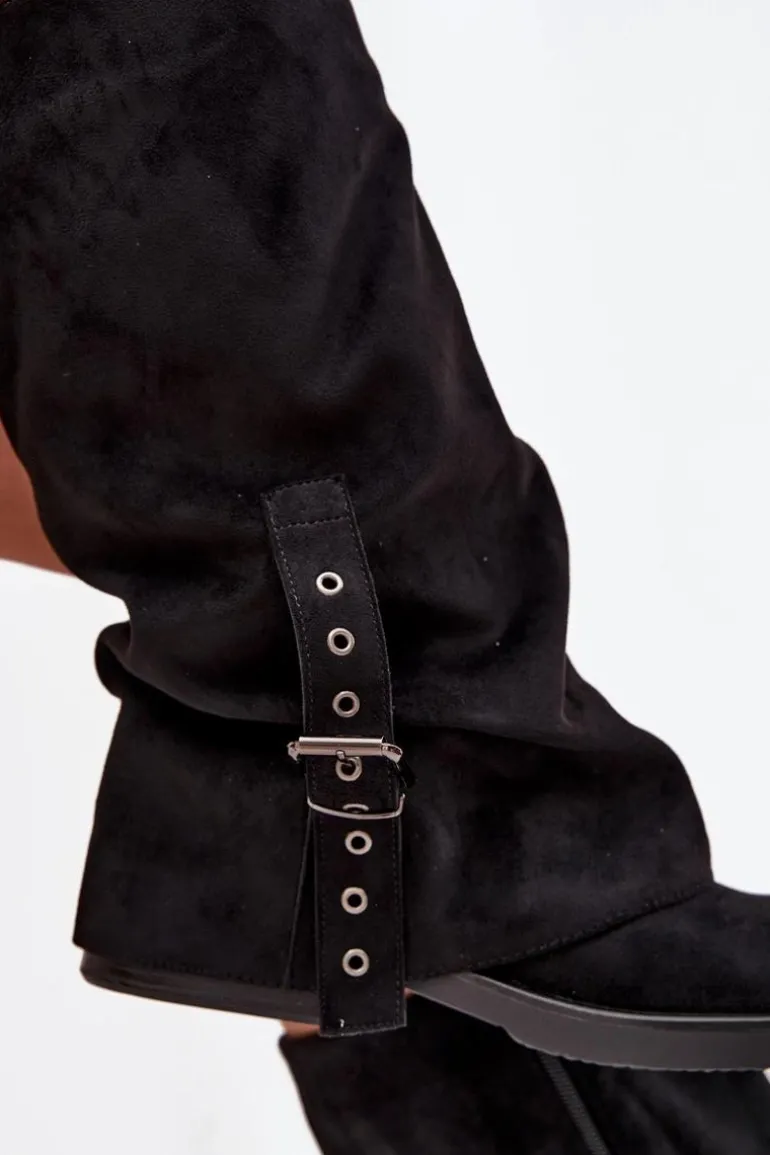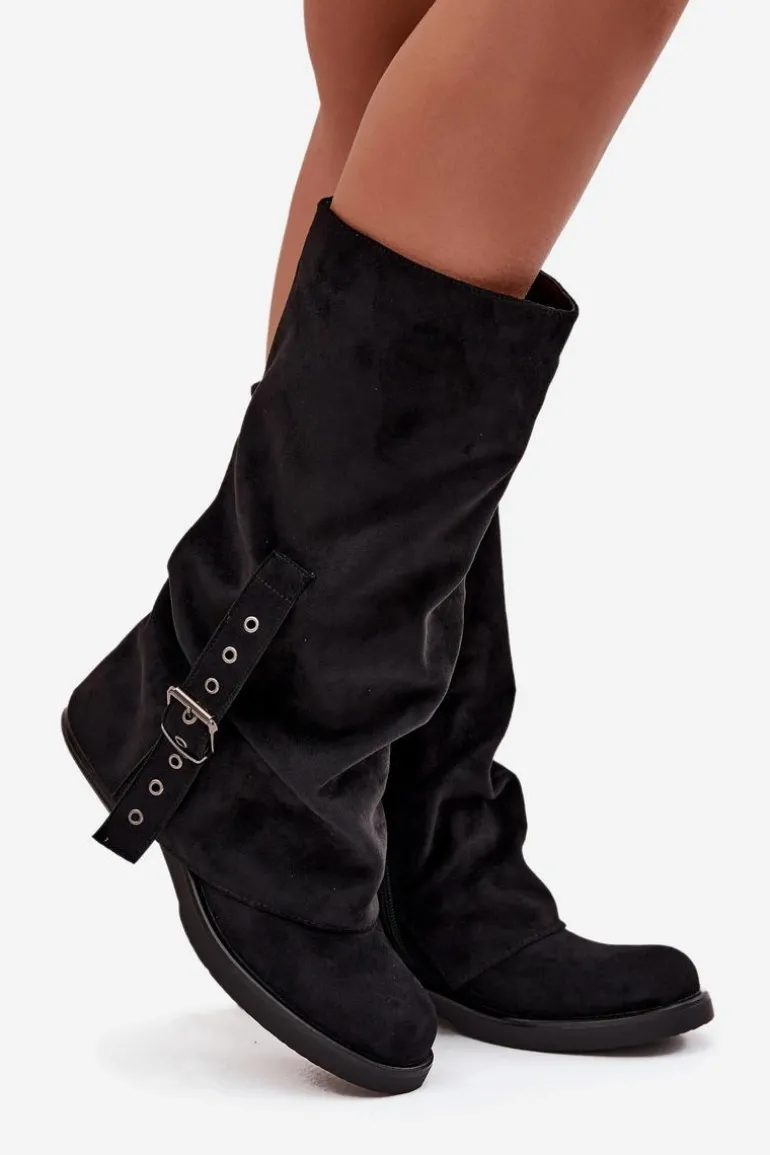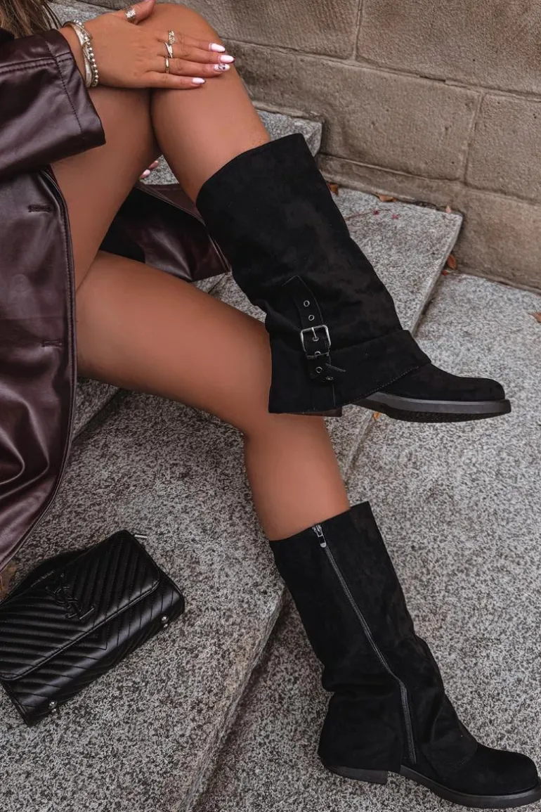 Stylowe kozaki damskie z eko zamszu to doskonałe połączenie wygody i modnego wyglądu. Wykonane z miękkiego, przyjemnego w dotyku materiału, prezentują się wyjątkowo elegancko i sprawdzą się zarówno w codziennych, jak i bardziej stylowych zestawach. Model osadzony jest na płaskim obcasie, dzięki czemu zapewnia komfort podczas chodzenia. Charakterystyczna marszczona cholewka nadaje im lekkości i nowoczesnego wyglądu, a ozdobny pasek z klamrą u dołu stanowi subtelny, stylowy akcent. Zaokrąglone noski dodają całości delikatności, a zamek błyskawiczny z boku ułatwia zakładanie i zdejmowanie butów. To idealna propozycja dla kobiet ceniących modny wygląd bez rezygnacji z wygody.Kozaki świetnie komponują się z dopasowanymi spodniami, spódnicami midi oraz dzianinowymi sukienkami – tworząc stylowe zestawy. Przy wyborze rozmiaru prosimy sugerować się tabelą rozmiarów.