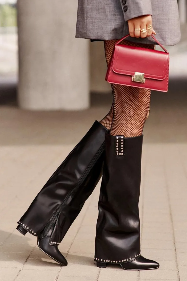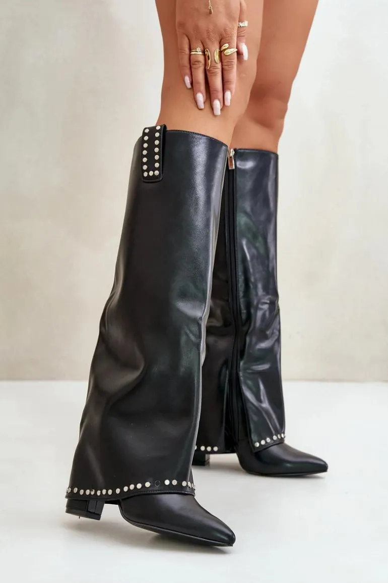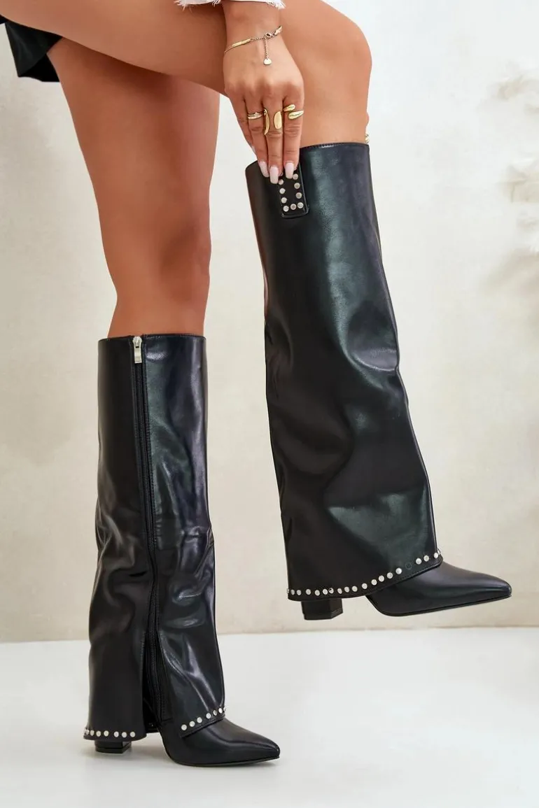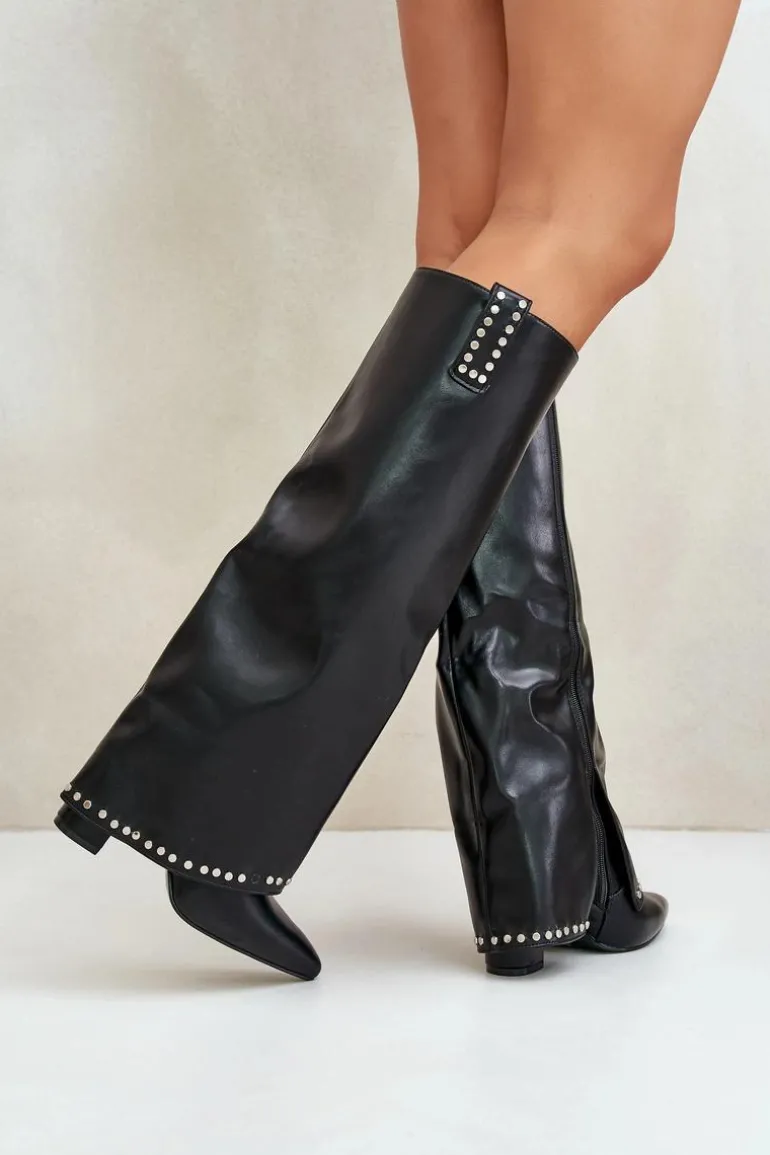 Damskie kozaki z luźną cholewką wykonane z eko skóry. Osadzone na stabilnym słupkowym obcasie, z noskami w szpic, które dodają wyrafinowanego charakteru. Wnętrze ocieplone kocem obuwniczym zapewnia ciepło w chłodniejsze dni. Wywinięta cholewka, która płynnie przechodzi na obcas, stanowi wyjątkowy element tego modelu. Zapinane na suwak, świetnie komponują się z sukienkami i spódnicami, dodając szyku każdej stylizacji. Przy wyborze rozmiaru prosimy sugerować się tabelą rozmiarów.