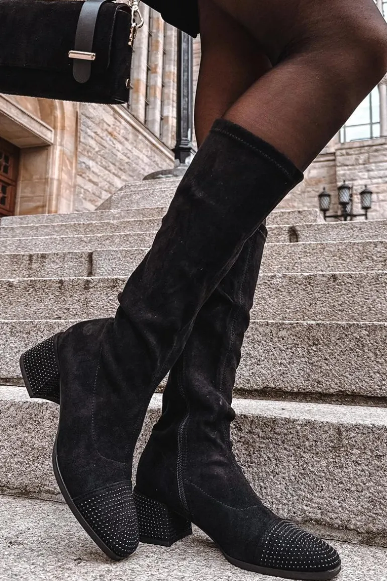 Kozaki damskie wykonane z eko zamszu to propozycja, która łączy klasykę z nutą nowoczesnego blasku. Model osadzony został na stabilnym obcasie w formie klocka, ozdobionym połyskującymi cyrkoniami, które dodają całości wyjątkowego, kobiecego charakteru. Delikatne zdobienia umieszczone również z przodu buta. Zapinane na zamek, są wygodne w użytkowaniu i doskonale dopasowują się do nogi. Wnętrze ocieplone jest wyłącznie na wysokości stopy miękkim kocem obuwniczym, co zapewnia komfort i ciepło w chłodniejsze dni, bez nadmiernego przegrzewania. Subtelne przeszycia na cholewce dodają elegancji i optycznie wysmuklają nogę. To stylowe kozaki doskonale sprawdzą się w bardziej wyjściowych stylizacjach, wnosząc odrobinę blasku do każdej jesienno-zimowej garderoby. Przy wyborze rozmiaru prosimy sugerować się tabelą rozmiarów.