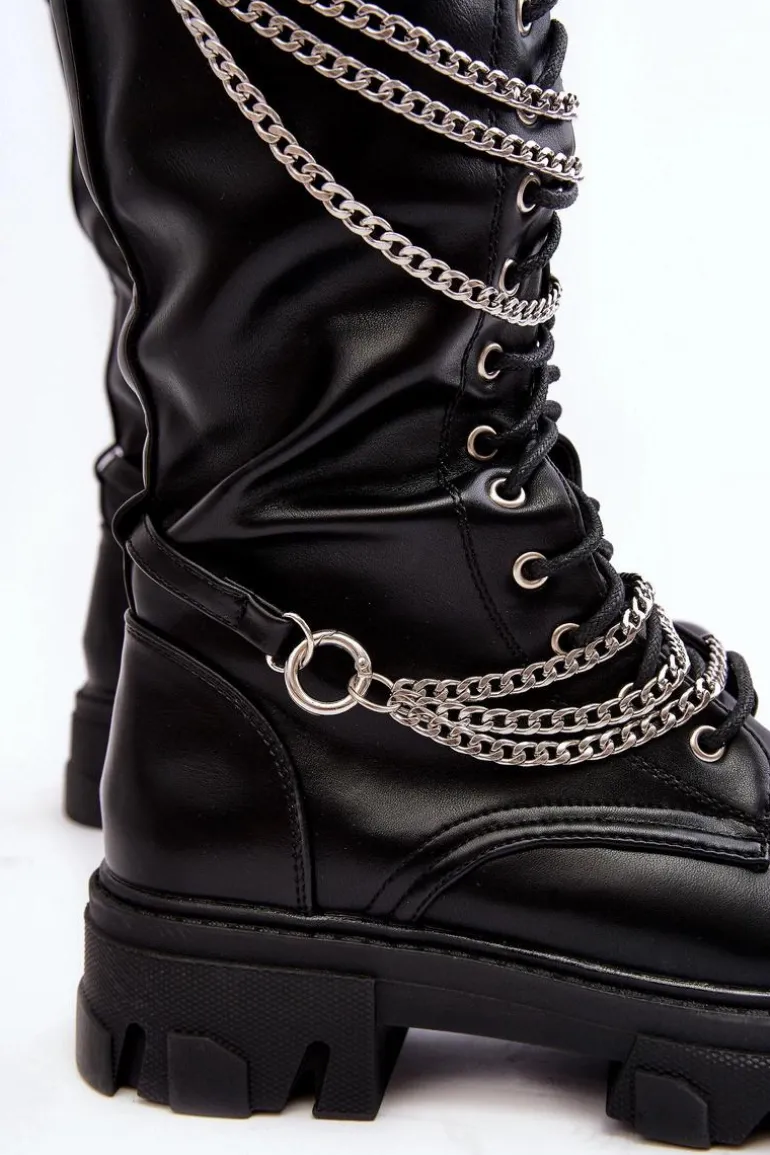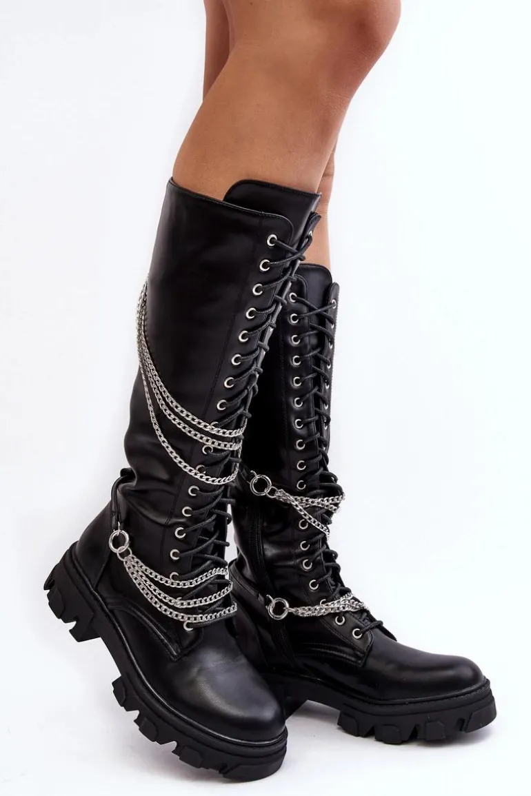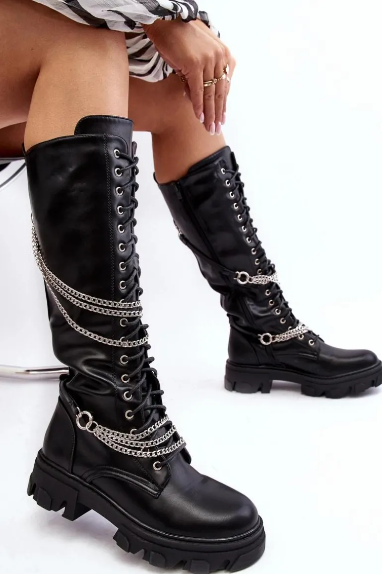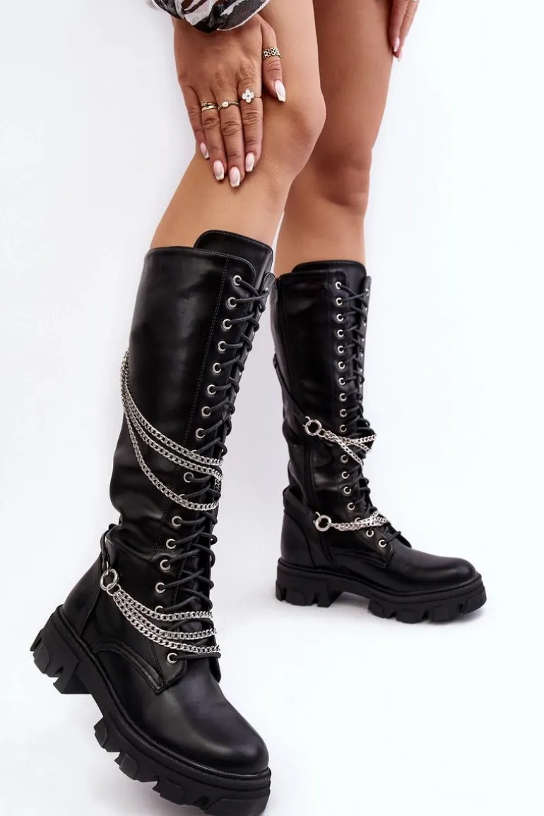 Kozaki damskie ze sznurowaniem oraz suwakiem na całości cholewki. Wykonane z eko skóry. Cholewka ozdobiona paskami z łańcuchami. Kozaki zostały wykonane z eko skóry. Model ten osadzony jest na płaskim obcasie i platformie. Zapiętek jest usztywniany. Wygodna, eko skórzana wkładka zapewni komfort podczas użytkowania. Przy wyborze rozmiaru prosimy kierować tabelą rozmiarów.