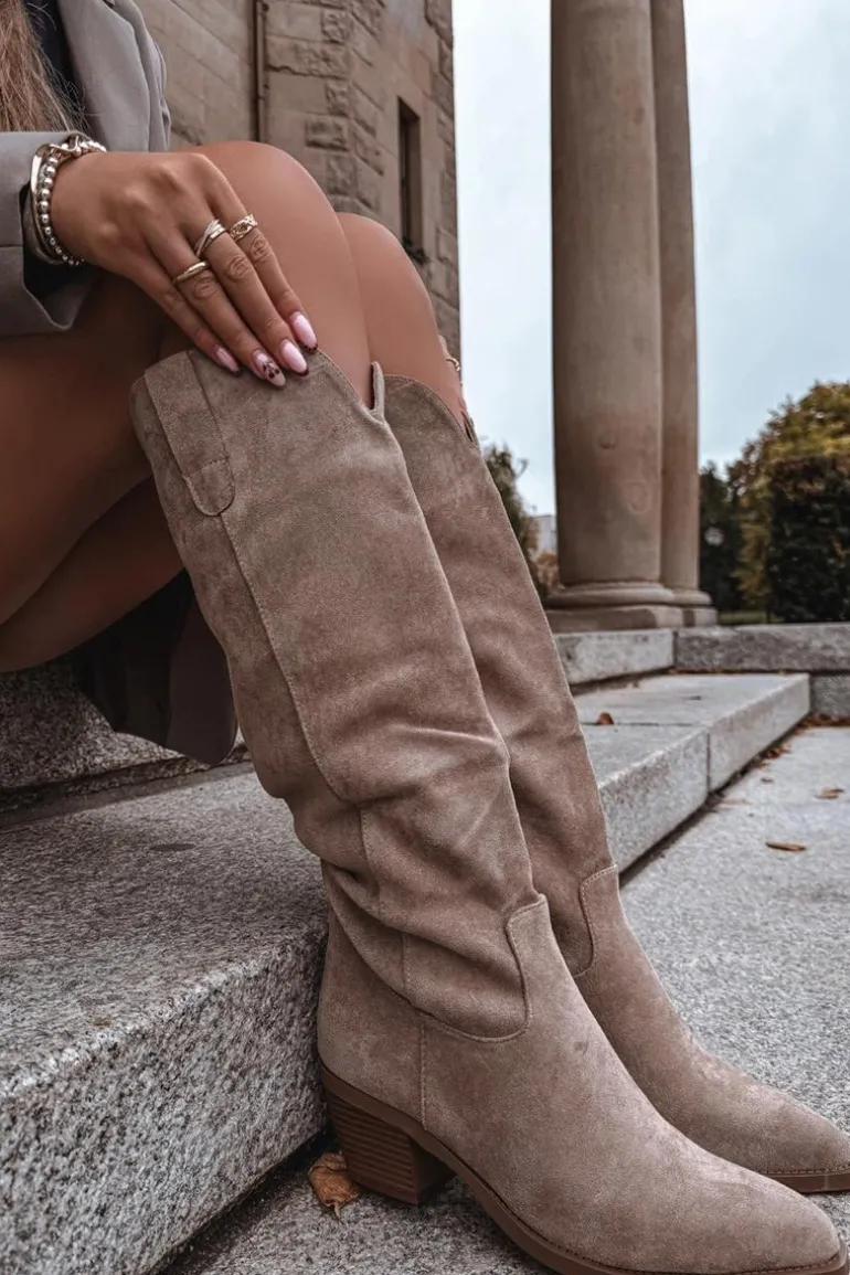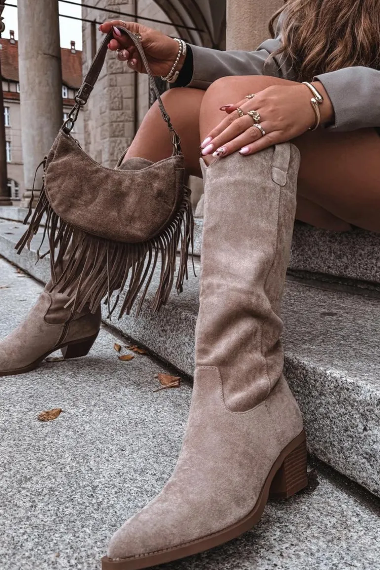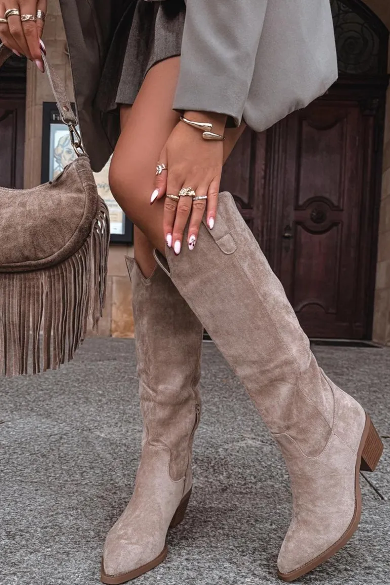 Kozaki damskie w stylu kowbojek, wykonane z eko zamszu. Osadzone na charakterystycznym, ściętym obcasie, dodają sylwetce lekkości i podkreślają kobiecy styl. Migdałowe noski nadają całości subtelności, a wsuwany fason z dodatkowym zapięciem na zamek zapewnia wygodę zakładania i idealne dopasowanie do nogi. To model, który doskonale wpisuje się w aktualne trendy – świetnie prezentuje się zarówno z sukienkami i spódnicami, jak i z dopasowanymi spodniami typu skinny. Stylowe i uniwersalne, staną się efektownym uzupełnieniem jesienno-zimowych stylizacji. Przy wyborze rozmiaru prosimy sugerować się poniższą tabelą rozmiarów.