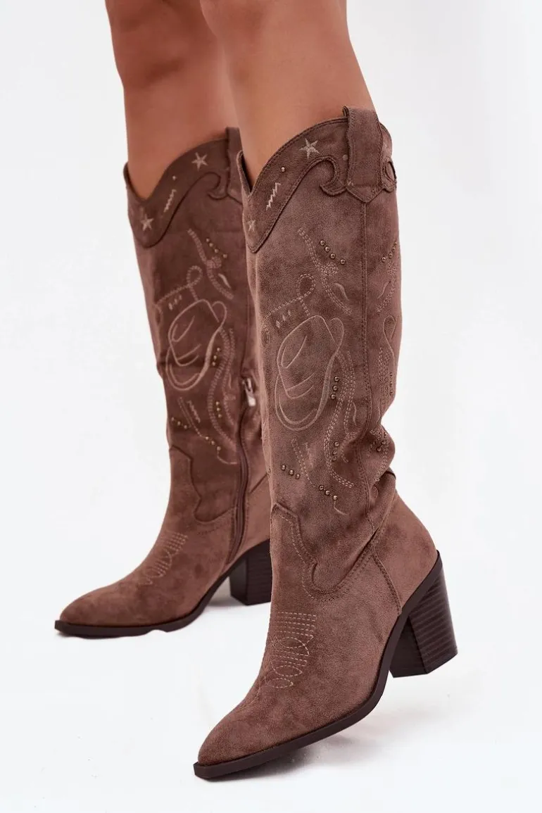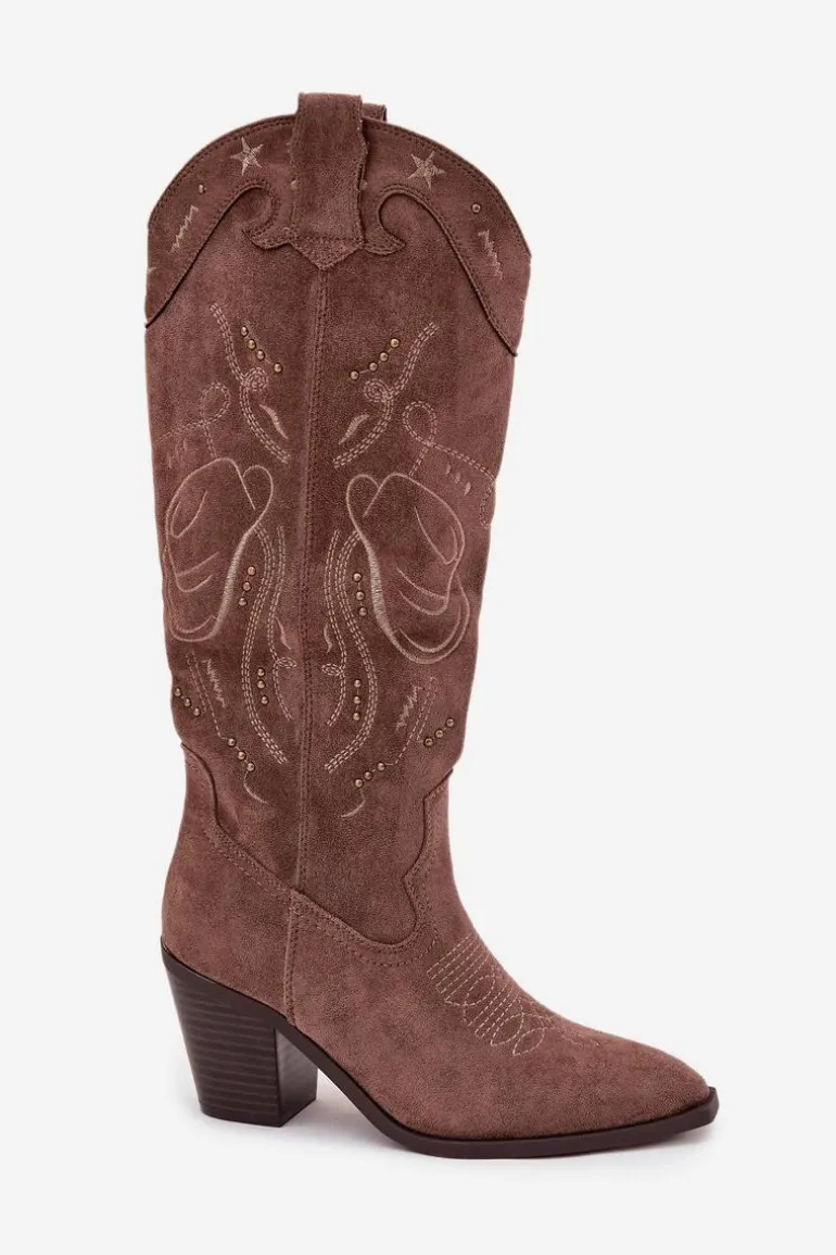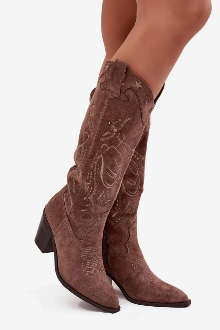 Kozaki damskie w stylu kowbojek, wykonane z eko zamszu to propozycja, która łączy klasykę z modnym, wyrazistym charakterem. Osadzone na stabilnym, ściętym obcasie typu słupek, dodają sylwetce smukłości, a jednocześnie gwarantują wygodę podczas chodzenia. Model wyróżnia się ozdobnymi przeszyciami oraz subtelnymi, złotymi elementami. Migdałowe noski podkreślają kobiecy styl, a praktyczny suwak umieszczony w dolnej części cholewki ułatwia zakładanie. To kozaki idealne do jesienno-zimowych stylizacji – doskonale komponują się zarówno z dopasowanymi spodniami, jak i sukienkami w stylu boho. Przy wyborze rozmiaru prosimy sugerować się tabelą rozmiarów.