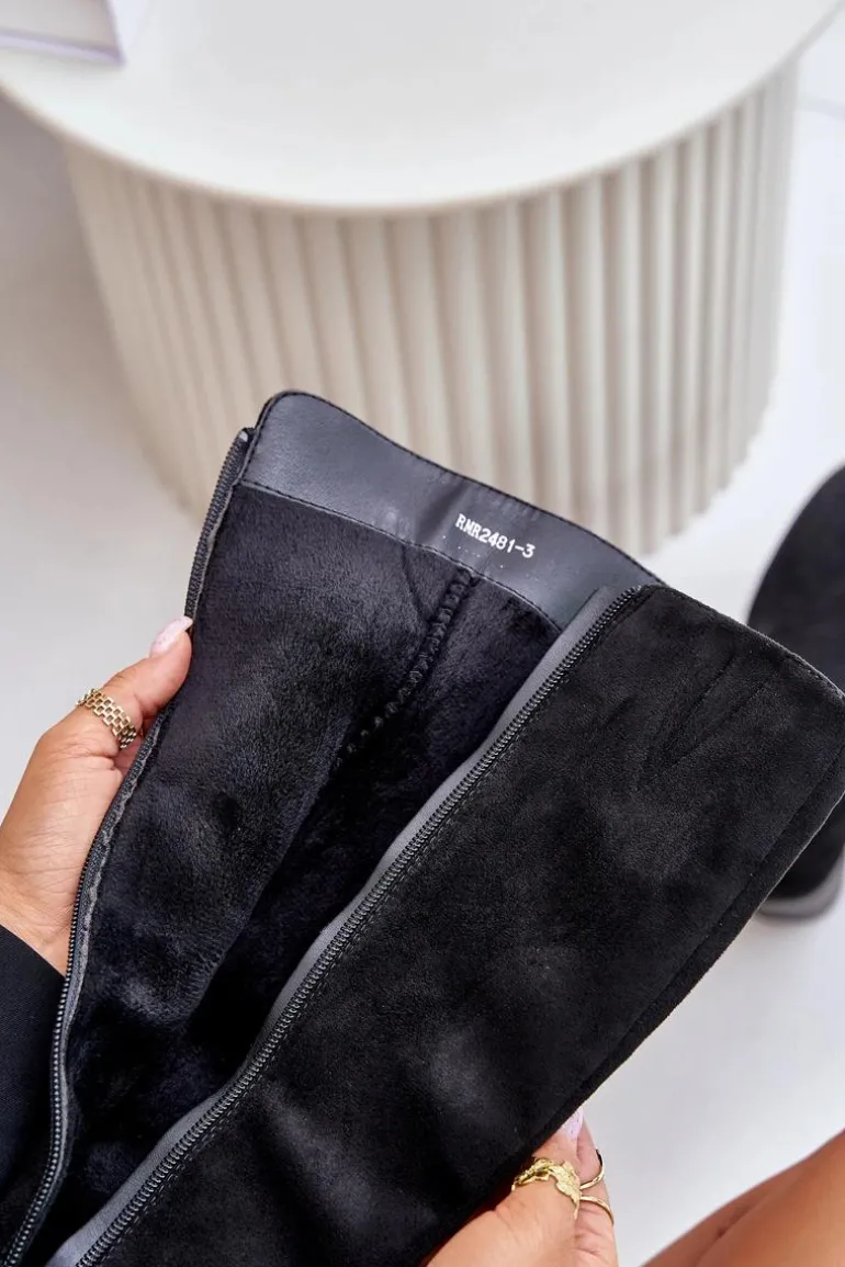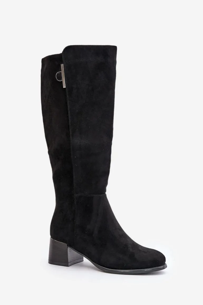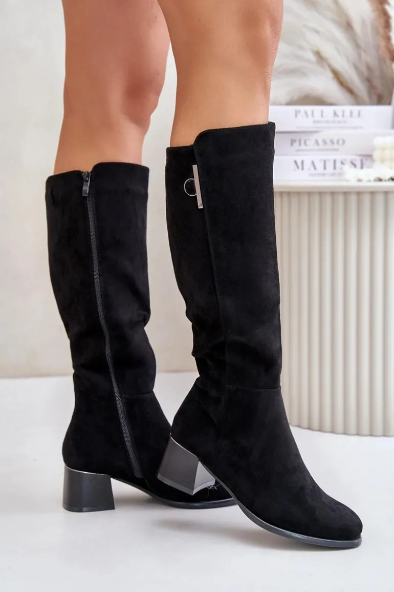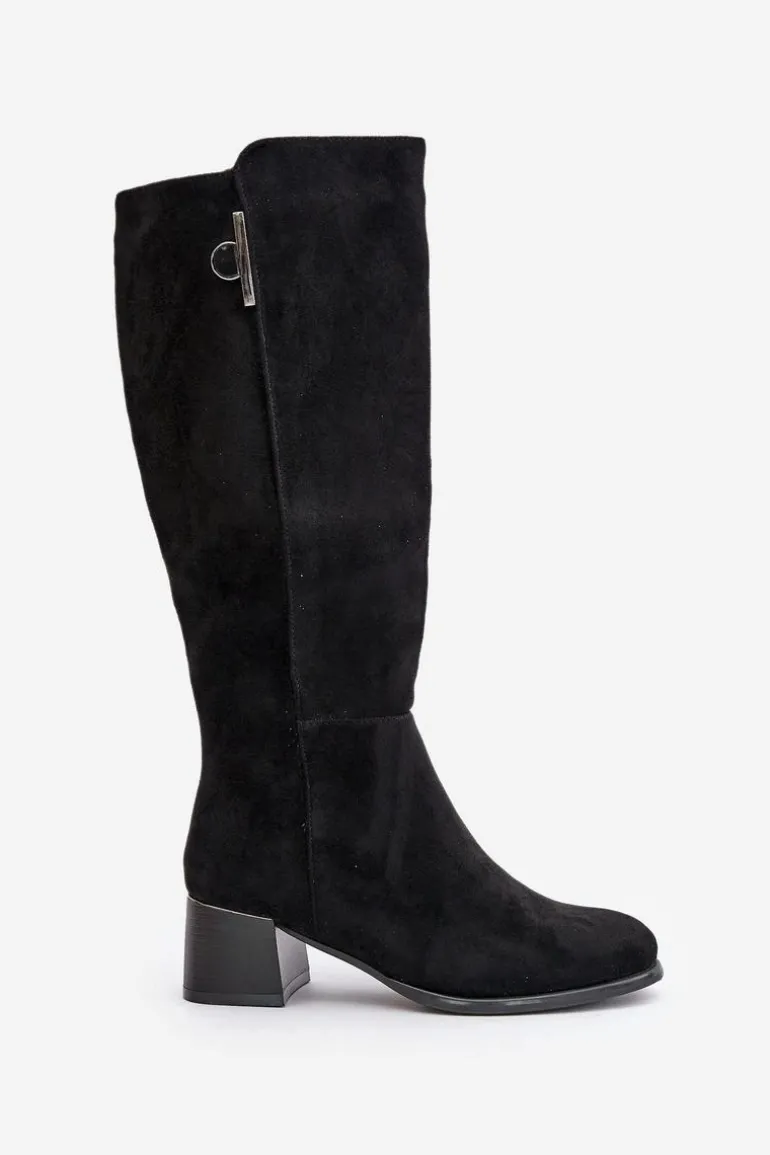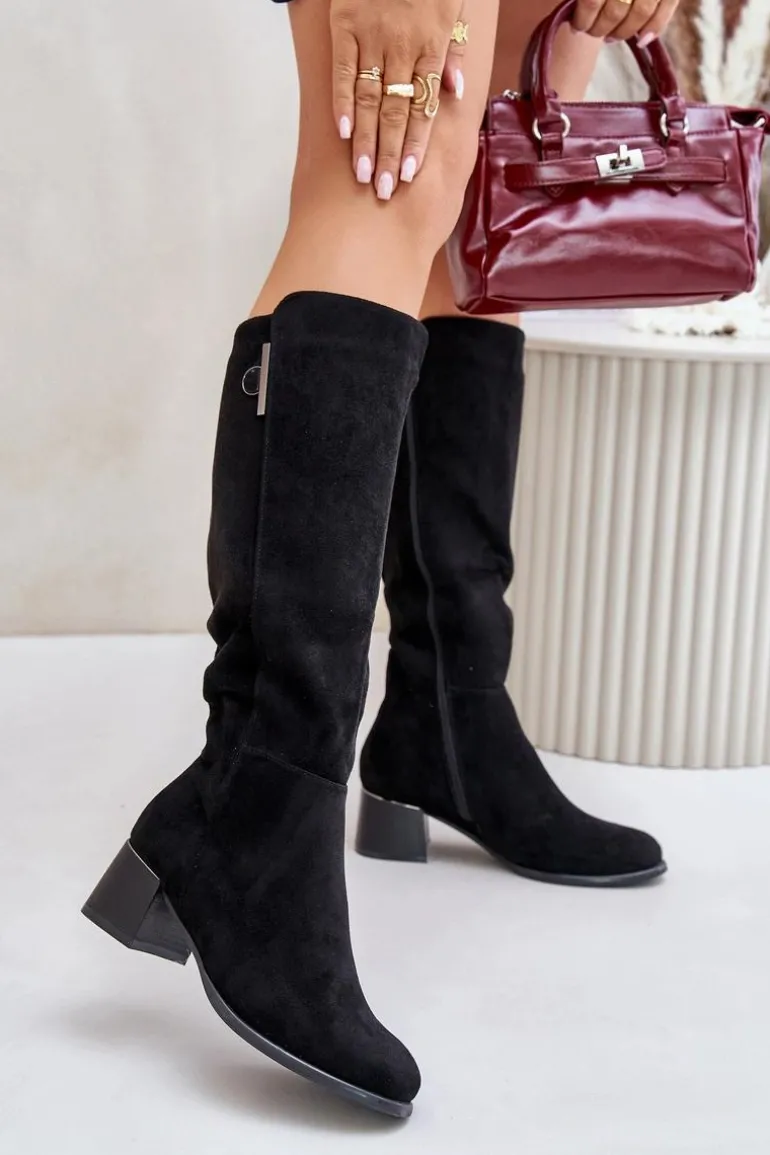 Botki marki Jezzi wykonane z eko zamszu to elegancki wybór na chłodniejsze dni. Model osadzony na obcasie typu klocek, który zapewnia stabilność i komfort noszenia. Cholewka sięga przed kolano, dodając stylowego wyglądu i optycznie wydłużając nogi. Zapięcie na zamek ułatwia zakładanie, a ocieplenie kocem obuwniczym gwarantuje ciepło. Model ten idealnie sprawdzi się do stylizacji z sukienkami i spódnicami. Przy wyborze rozmiaru prosimy sugerować się tabelą rozmiarów.