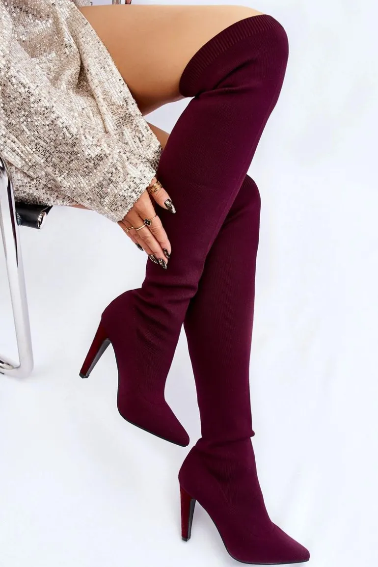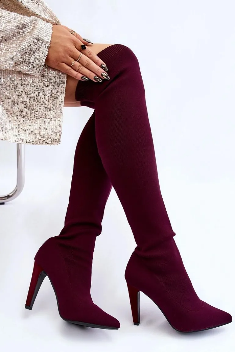 Wysokie kozaki za kolano są wykonane z elastycznego materiału tekstylnego, dzięki temu cholewka dopasuje się do tęgości nogi. U góry cholewki znajduje się ściągacz. Nosek w szpic. Obcas pokryty jest eko zamszem. Wkładka jest wykonana z eko skóry. Kozaki te świetnie będą się prezentować wraz z sukienkami czy spódniczkami. Przy wyborze rozmiaru prosimy sugerować się tabelą rozmiarów.
