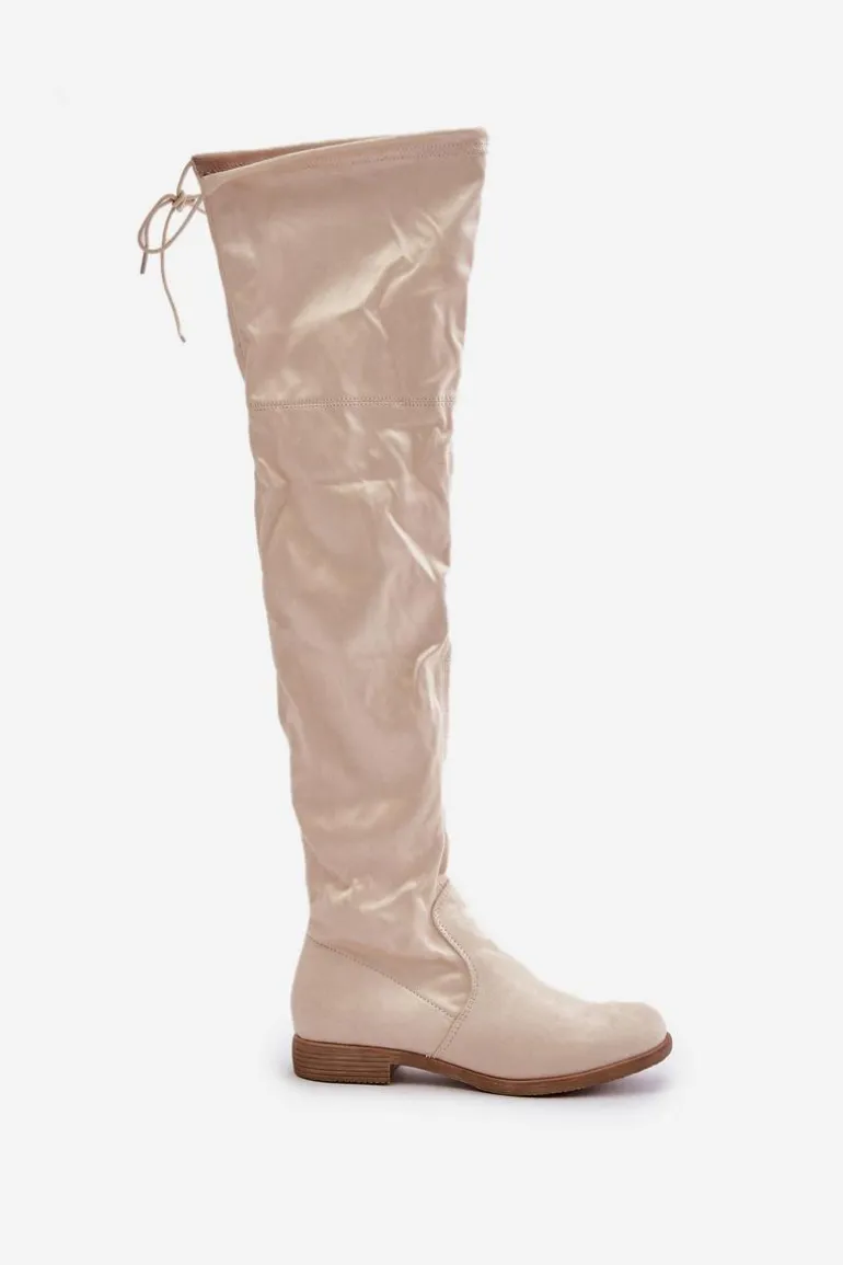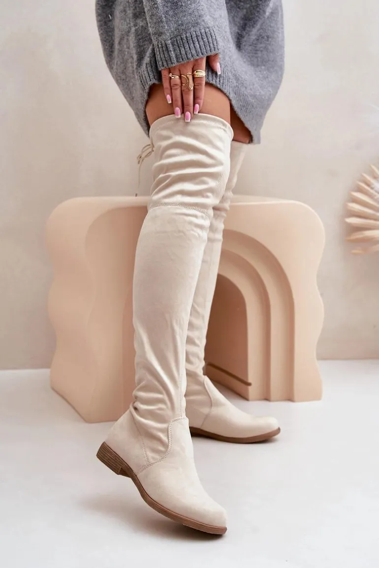 Damskie kozaki z cholewką sięgającą za kolano, wykonane z ekologicznego zamszu. Osadzone na płaskim, stabilnym obcasie z zaokrąglonymi noskami i usztywnionym zapiętkiem. Model wsuwany z regulowaną górą cholewki. Doskonale komponują się z sukienkami i spódnicami. Przy wyborze rozmiaru prosimy kierować tabelą rozmiarów.