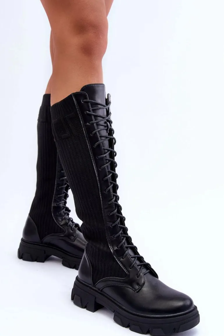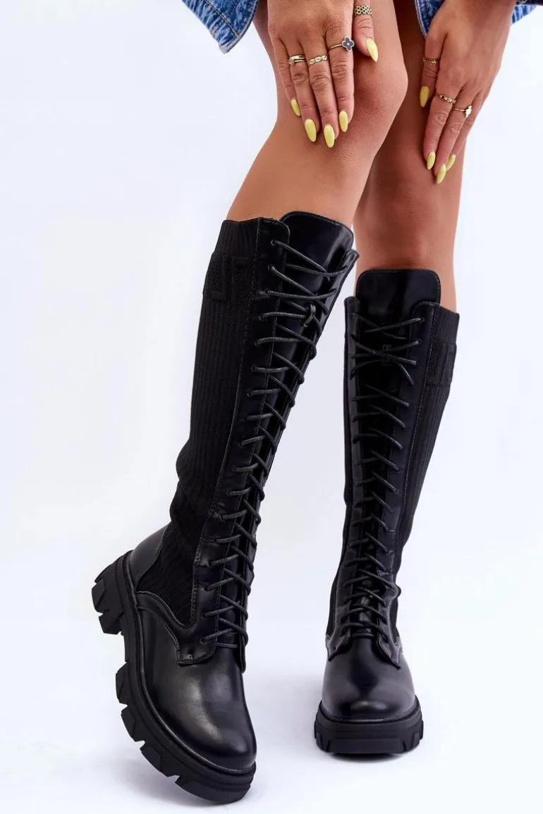 Modne damskie kozaki zostały wykonane z połączenia eko skóry oraz elastycznej tkaniny. Cholewka do kolana. Model osadzony na płaskim obcasie i platformie. Buty te posiadają usztywniany zapiętek. Model wsuwany z dodatkowym wiązaniem. Te klasyczne kozaki świetnie będą pasować do jesiennych stylizacji. Modny fason, który powinnaś mieć! Przy wyborze rozmiaru prosimy kierować tabelą rozmiarów.