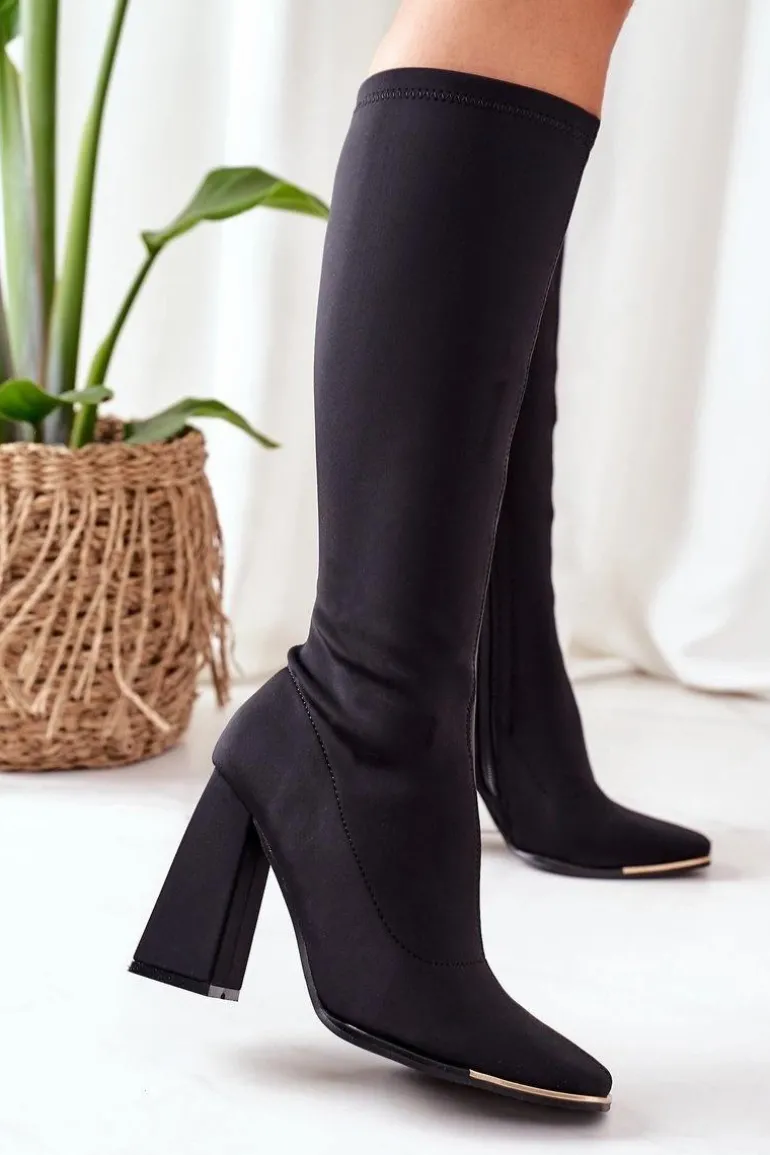 Piękne kozaki na słupku wykonane z elastycznej tkaniny. Wyjątkowy obcas oraz kwadratowy nosek urozmaicą każdą stylizację! Przy wyborze rozmiaru prosimy sugerować się tabelą rozmiarów.