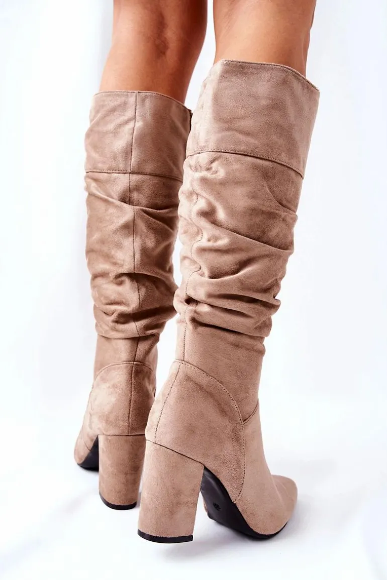 Piękne kozaki na słupku wykonane z zamszowej skóry ekologicznej. Buty osadzone na niewysokim słupku. Zapinanie z boku cholewki ułatwi zakładanie. Cholewka lekko marszczona, co sprawia, że buty wyglądają zjawiskowo. Idealnie będą pasować do wielu stylizacji!Przy wyborze rozmiaru prosimy sugerować się tabelą rozmiarów.