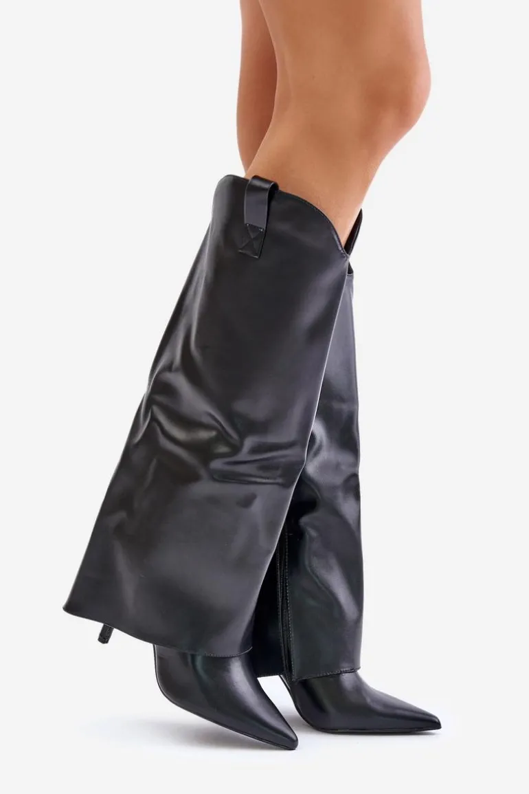 Kozaki wykonane z eko skóry, wyróżniają się wywiniętą cholewką, która efektownie zachodzi na obcas. Model posiada noski w szpic, dodające mu szyku, a zamek po boku ułatwia zakładanie i zdejmowanie butów. Osadzone na smukłej szpilce, sięgają do kolana, podkreślając kobiecą sylwetkę. Idealne do eleganckich, jesienno-zimowych stylizacji! Przy wyborze rozmiaru prosimy sugerować się tabelą rozmiarów.