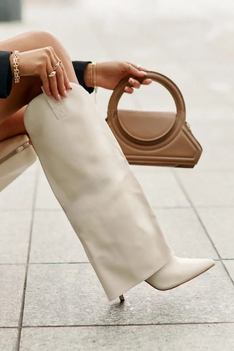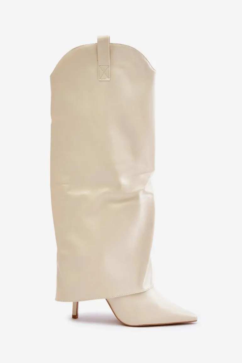 Kozaki wykonane z eko skóry, wyróżniają się wywiniętą cholewką, która efektownie zachodzi na obcas. Model posiada noski w szpic, dodające mu szyku, a zamek po boku ułatwia zakładanie i zdejmowanie butów. Osadzone na smukłej szpilce, sięgają do kolana, podkreślając kobiecą sylwetkę. Idealne do eleganckich, jesienno-zimowych stylizacji! Przy wyborze rozmiaru prosimy sugerować się tabelą rozmiarów.