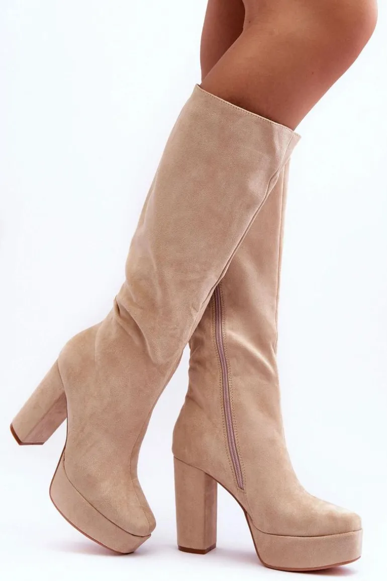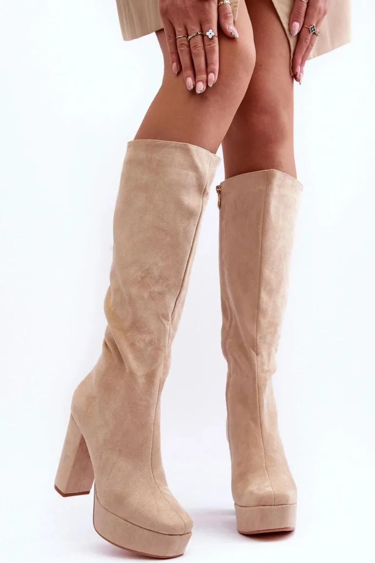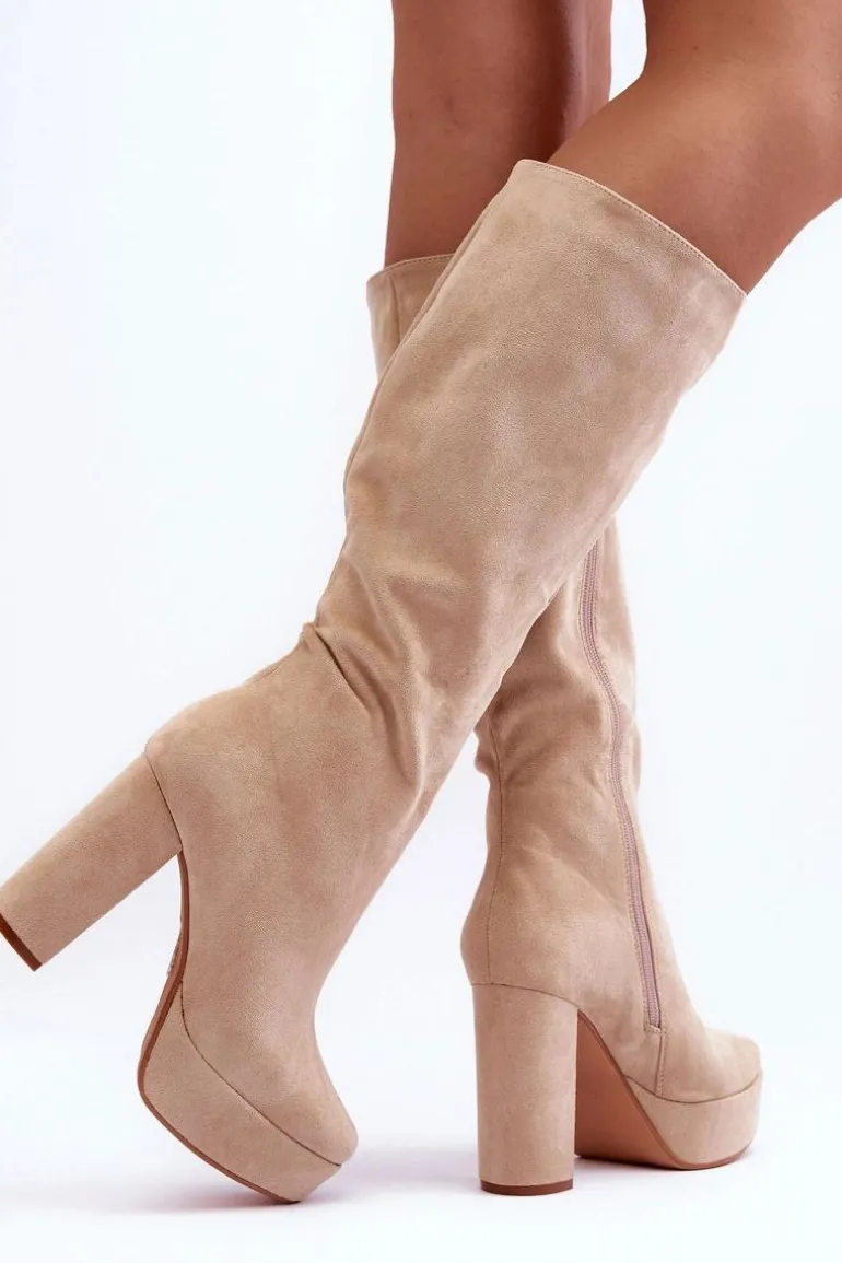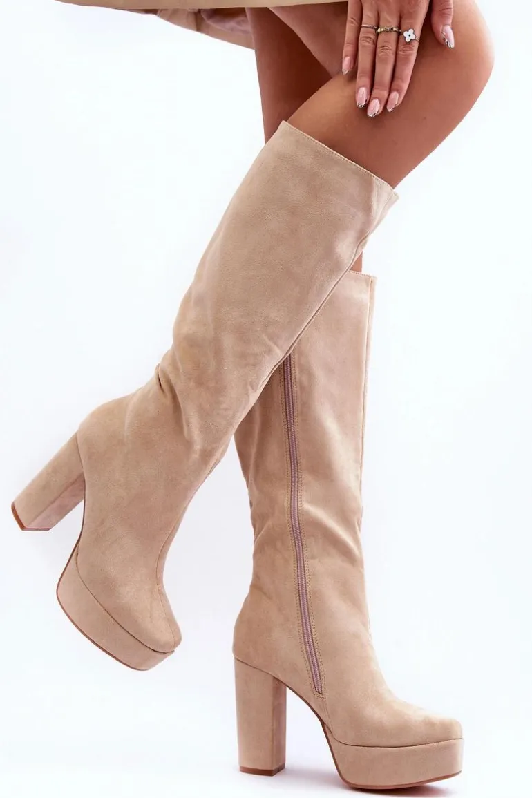 Modne kozaki damskie zostały wykonane z eko zamszu. Osadzone na grubej platformie oraz obcasie w postaci masywnego słupka. Model zapinany na suwak. Cholewka przed kolano, noski kwadratowe. Świetny fason, który wyróżni Cię z tłumu. Nie posiadają ocieplenia. Koniecznie powinnaś je mieć! Przy wyborze rozmiaru prosimy sugerować się tabelą rozmiarów.