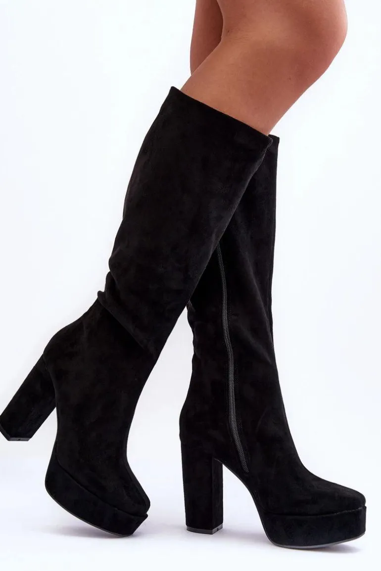 Modne kozaki damskie zostały wykonane z eko zamszu. Osadzone na grubej platformie oraz obcasie w postaci masywnego słupka. Model zapinany na suwak. Cholewka przed kolano, noski kwadratowe. Świetny fason, który wyróżni Cię z tłumu. Nie posiadają ocieplenia. Koniecznie powinnaś je mieć! Przy wyborze rozmiaru prosimy sugerować się tabelą rozmiarów.