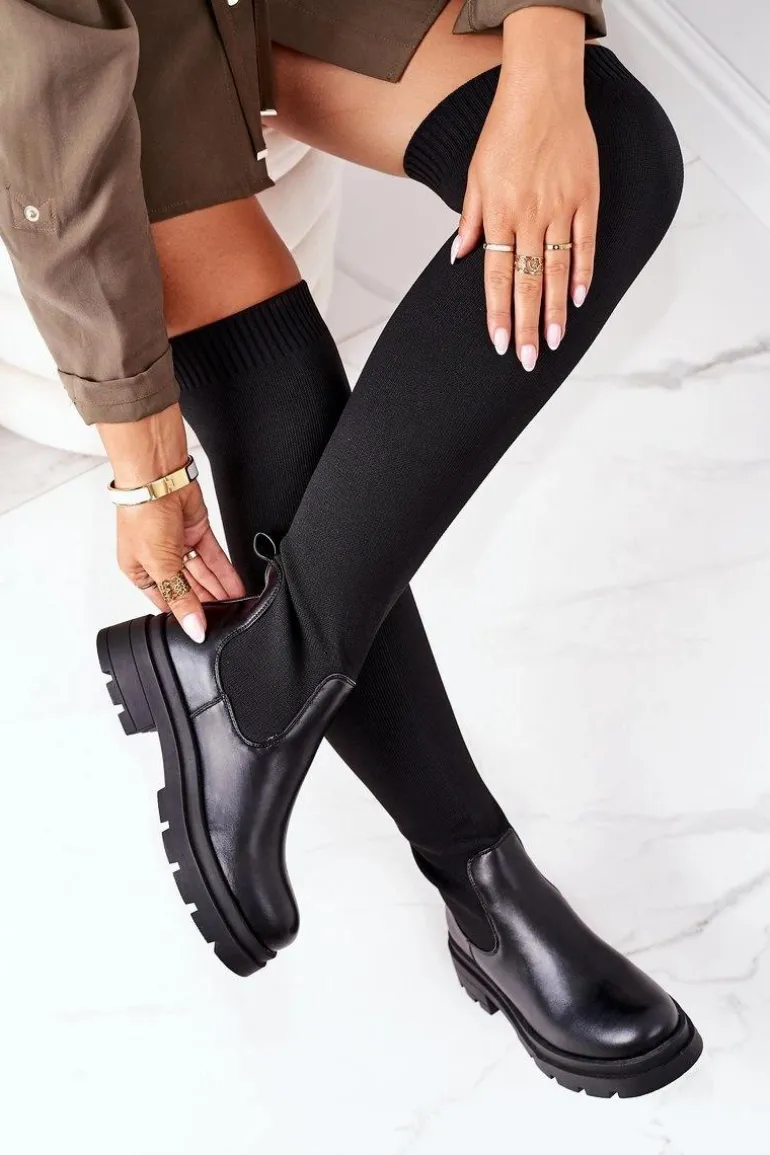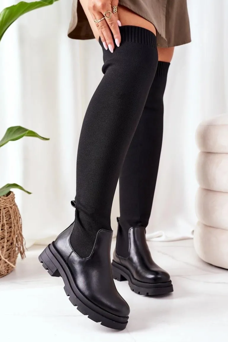 Kozaki za kolano wykonane z elastycznej tkaniny. Wnętrze ocieplone jest kocem obuwniczym.