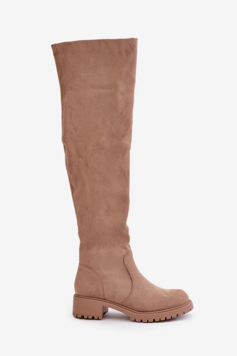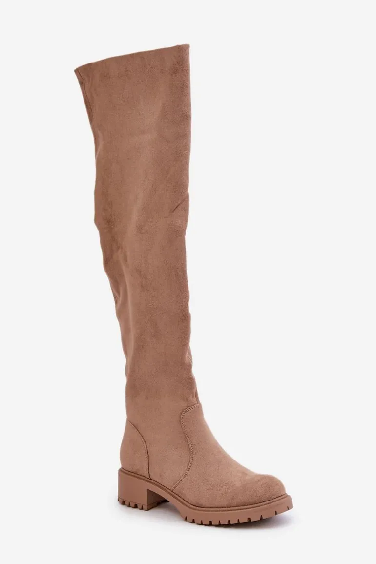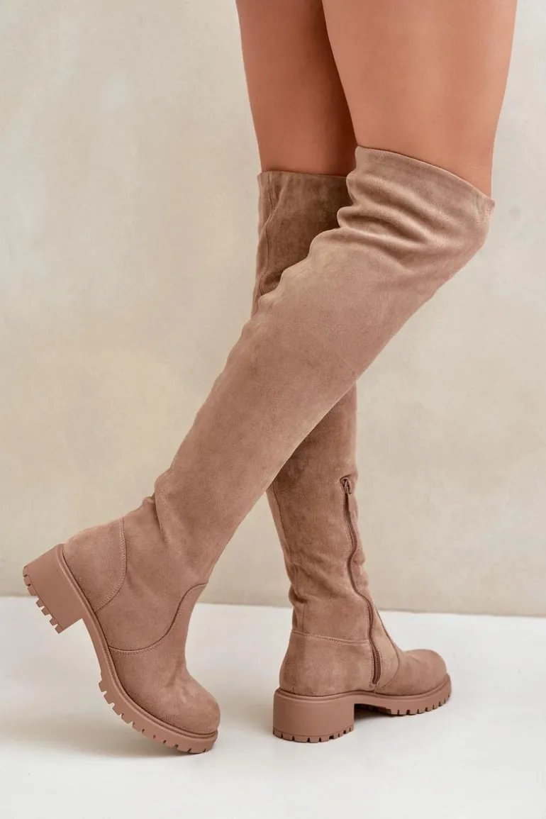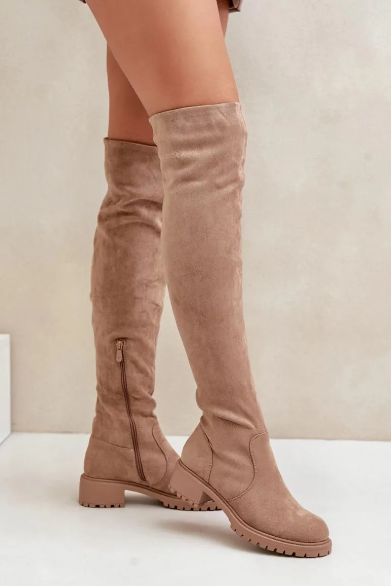 Damskie kozaki z cholewką sięgającą za kolano. Wykonane z ekologicznego zamszu. Osadzone na niskim obcasie. Model wsuwany z dodatkowym zapięciem na suwak. Noski są zaokrąglone. Wnętrze częściowo ocieplane kocem obuwniczym. Idealnie pasują do krótkich spódniczek lub sukienek. Kozaki te koniecznie powinny znaleźć się w Twojej zimowej kolekcji obuwia! Przy wyborze rozmiaru prosimy sugerować się tabelą rozmiarów.