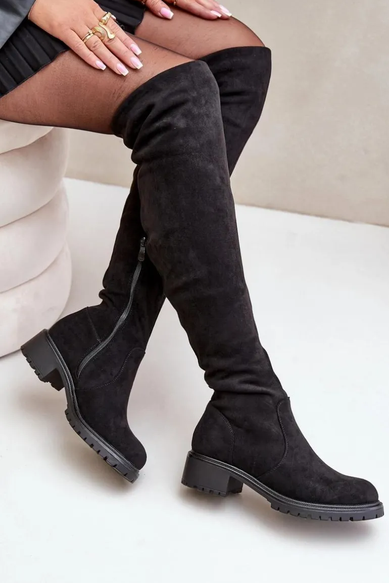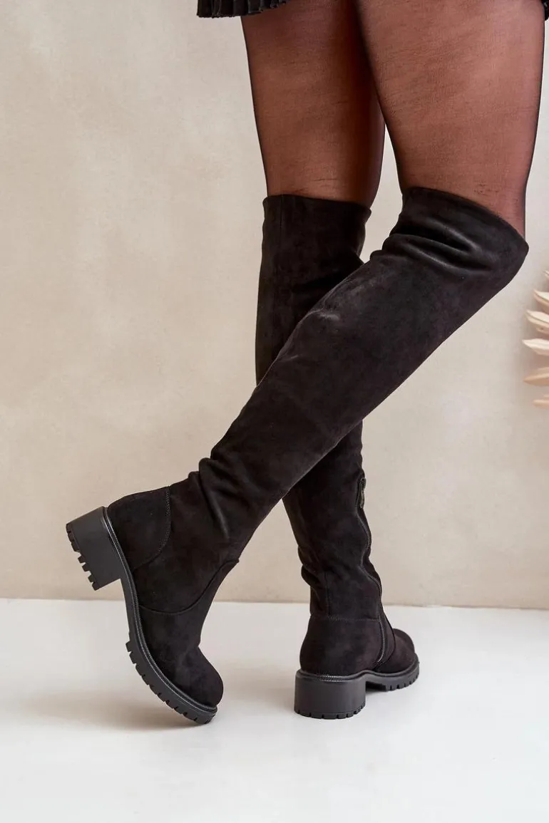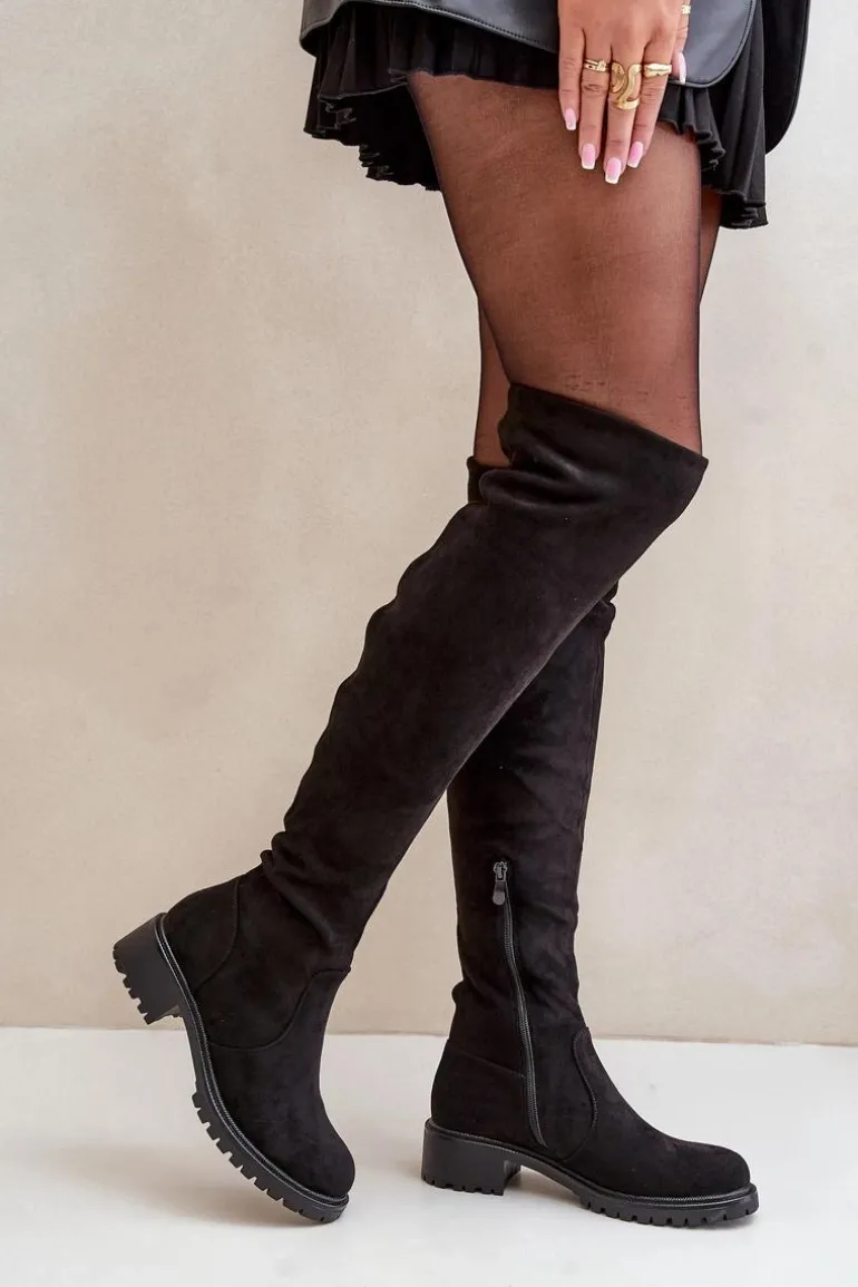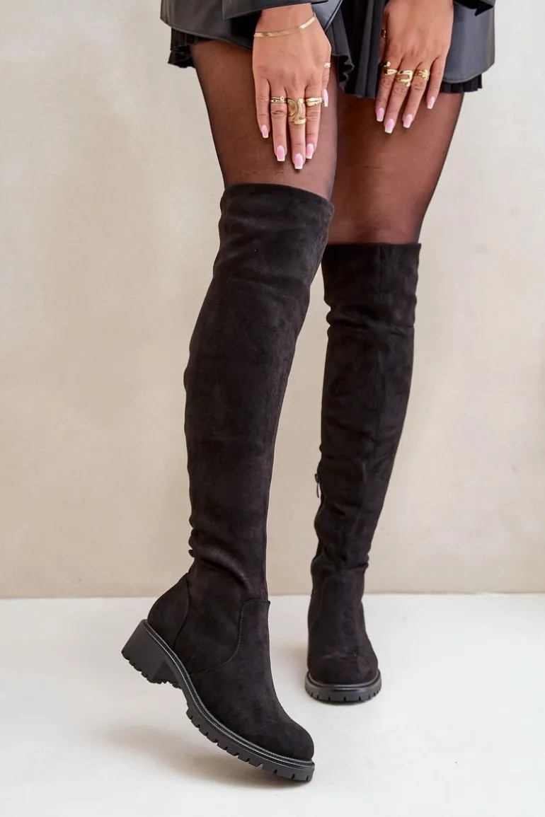 Damskie kozaki z cholewką sięgającą za kolano. Wykonane z ekologicznego zamszu. Osadzone na niskim obcasie. Model wsuwany z dodatkowym zapięciem na suwak. Noski są zaokrąglone. Wnętrze częściowo ocieplane kocem obuwniczym. Idealnie pasują do krótkich spódniczek lub sukienek. Kozaki te koniecznie powinny znaleźć się w Twojej zimowej kolekcji obuwia! Przy wyborze rozmiaru prosimy sugerować się tabelą rozmiarów.