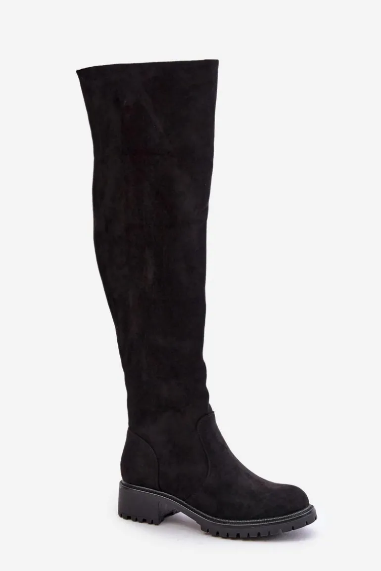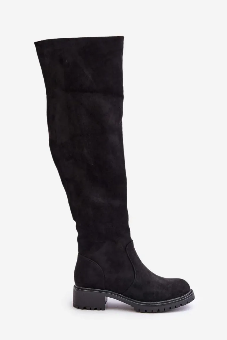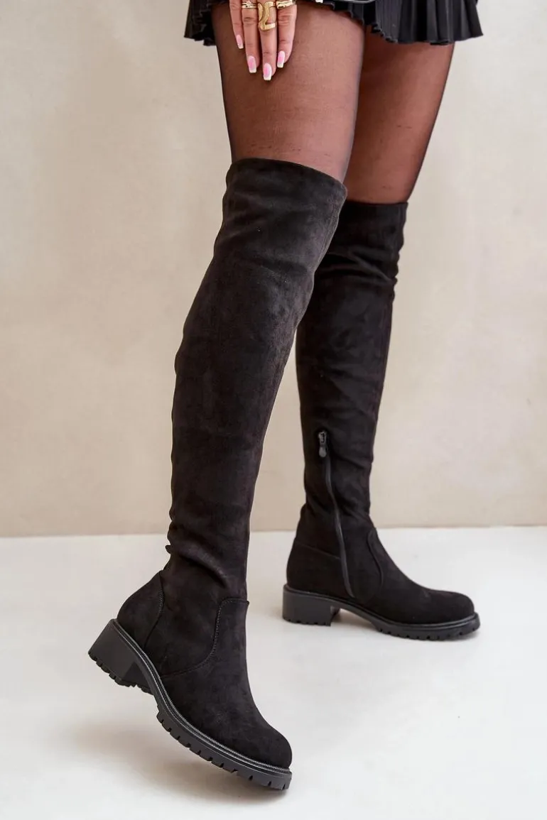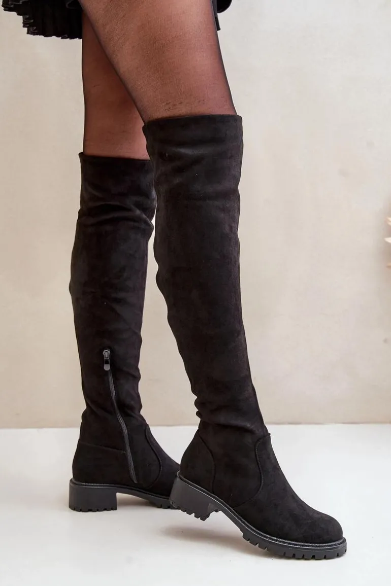 Damskie kozaki z cholewką sięgającą za kolano. Wykonane z ekologicznego zamszu. Osadzone na niskim obcasie. Model wsuwany z dodatkowym zapięciem na suwak. Noski są zaokrąglone. Wnętrze częściowo ocieplane kocem obuwniczym. Idealnie pasują do krótkich spódniczek lub sukienek. Kozaki te koniecznie powinny znaleźć się w Twojej zimowej kolekcji obuwia! Przy wyborze rozmiaru prosimy sugerować się tabelą rozmiarów.