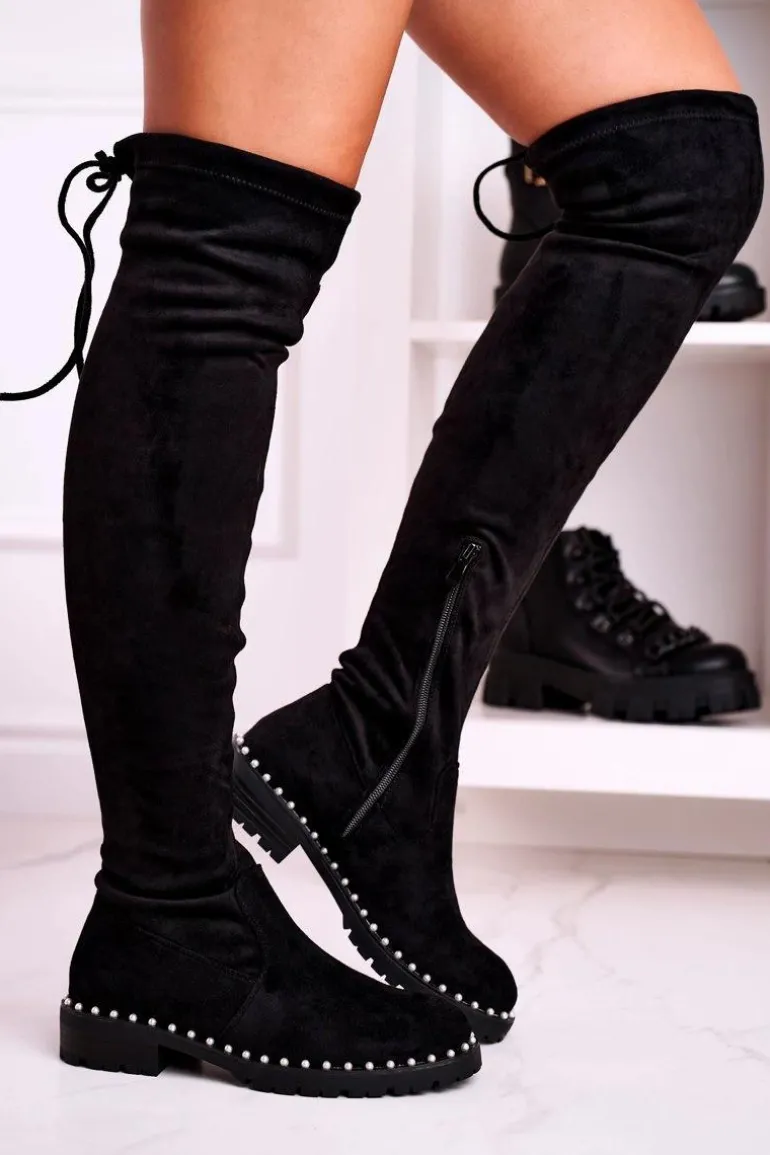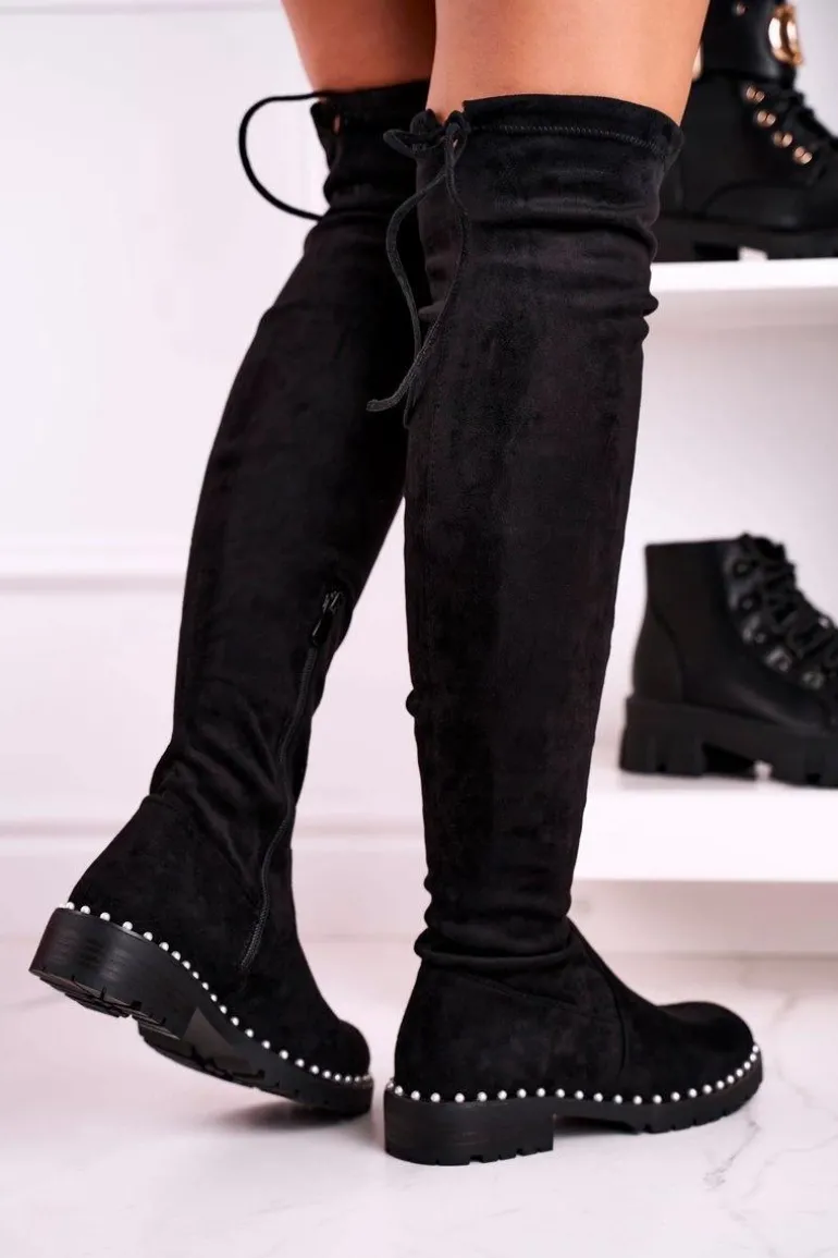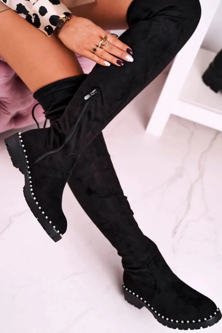 Kozaki Za Kolano Z Perełkami Zamszowe Czarne Isabel