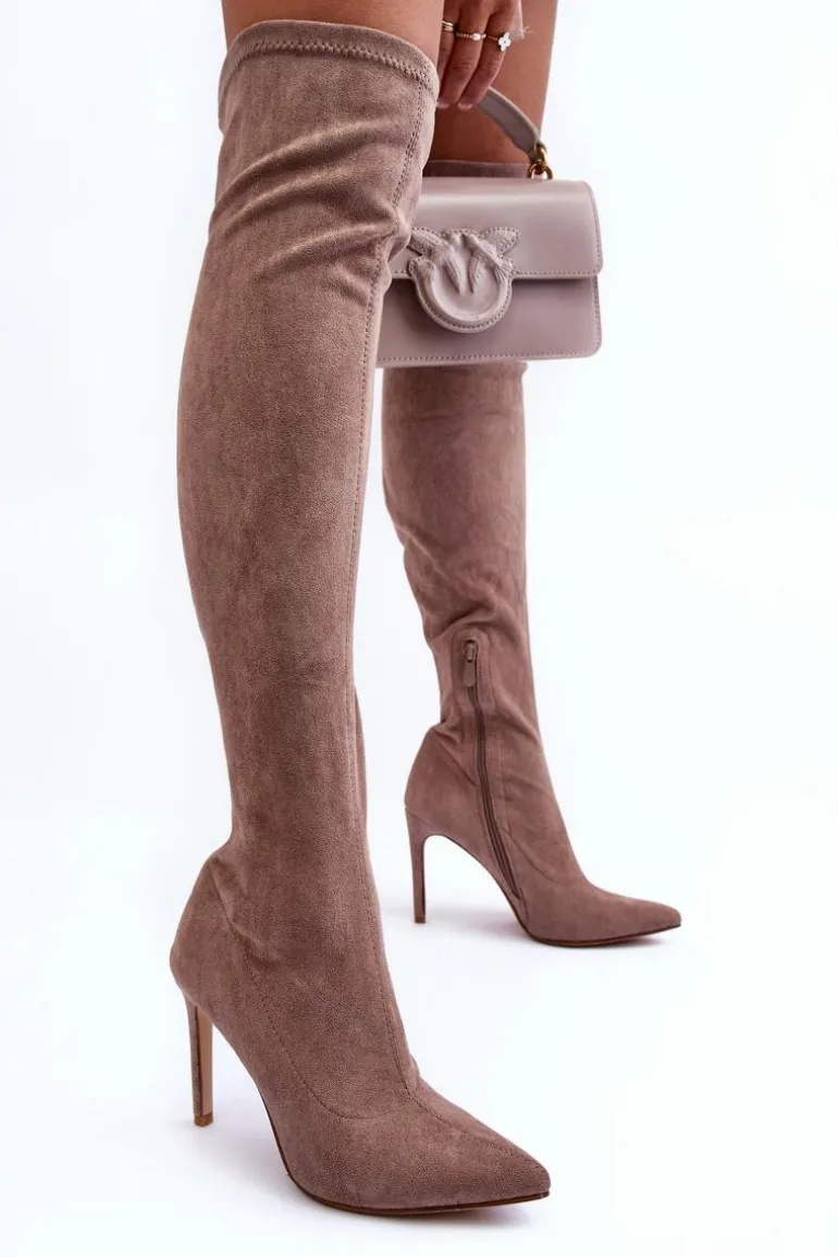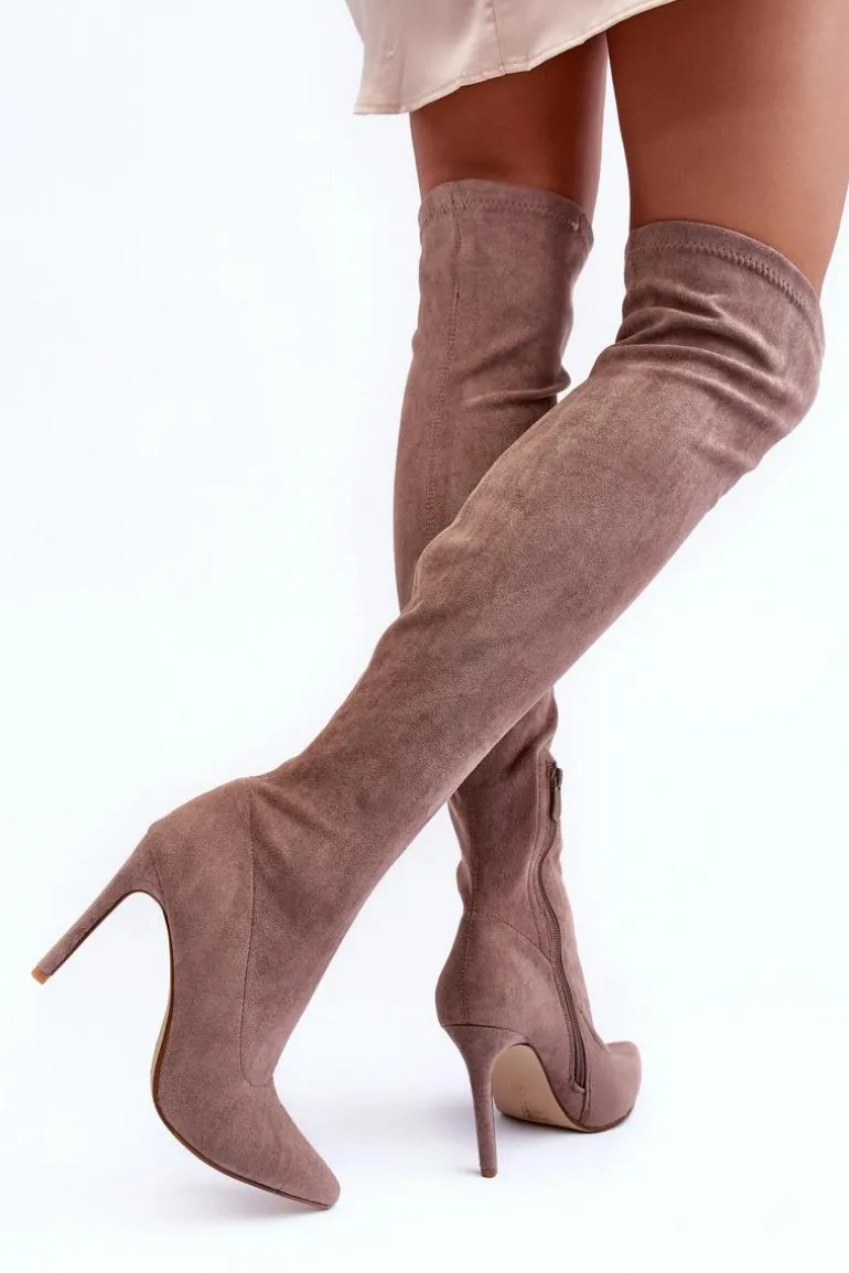 Modne kozaki za kolano zostały wykonane z eko zamszu. Zapinane na suwak w dolnej części cholewki. Obcas w postaci szpilki. Wnętrze ocieplone na wysokości stopy. Zapiętek usztywniony, noski w szpic. Koniecznie musisz mieć ten model w swojej garderobie! Przy wyborze rozmiaru prosimy kierować tabelą rozmiarów.