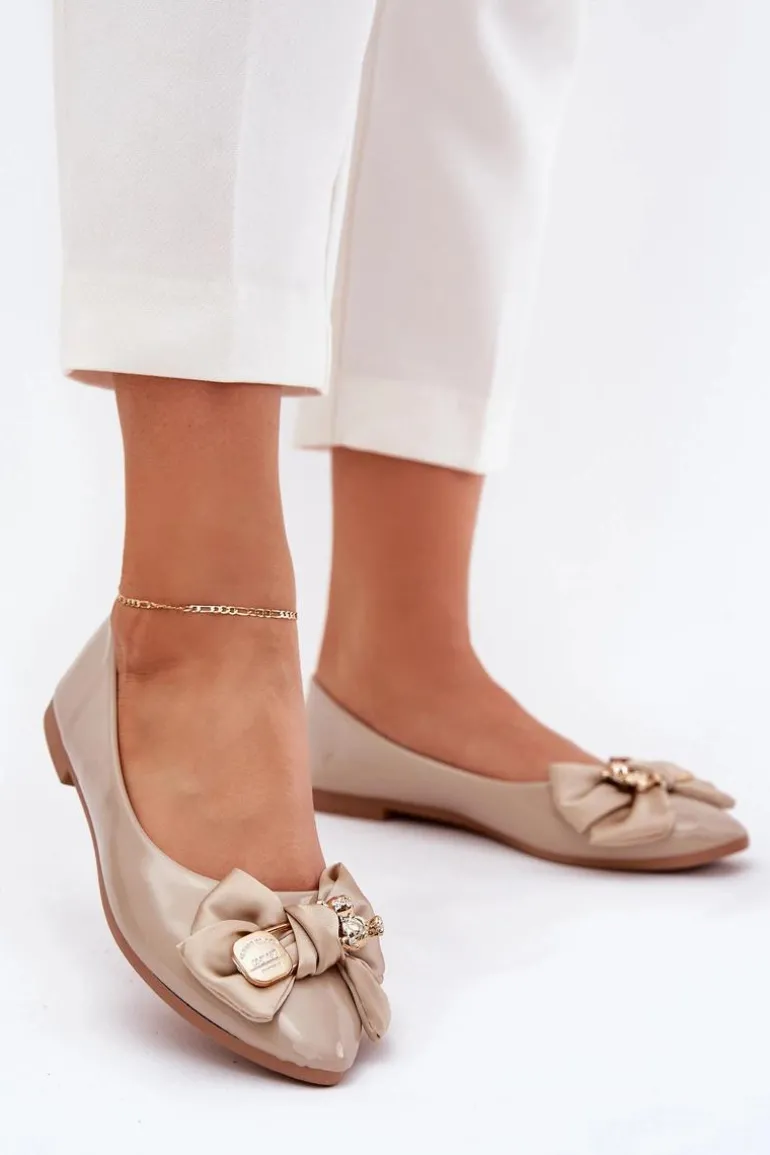 Baleriny damskie wykonane z eko skóry, łączące stylowy wygląd z komfortem. Model wyróżnia się migdałowymi noskami oraz uroczą kokardką ozdobioną złotą broszką, która dodaje im wyjątkowego uroku. Idealne do codziennych stylizacji, zapewniają wygodę i modny wygląd na każdą okazję. Przy wyborze rozmiaru prosimy sugerować się tabelą rozmiarów.