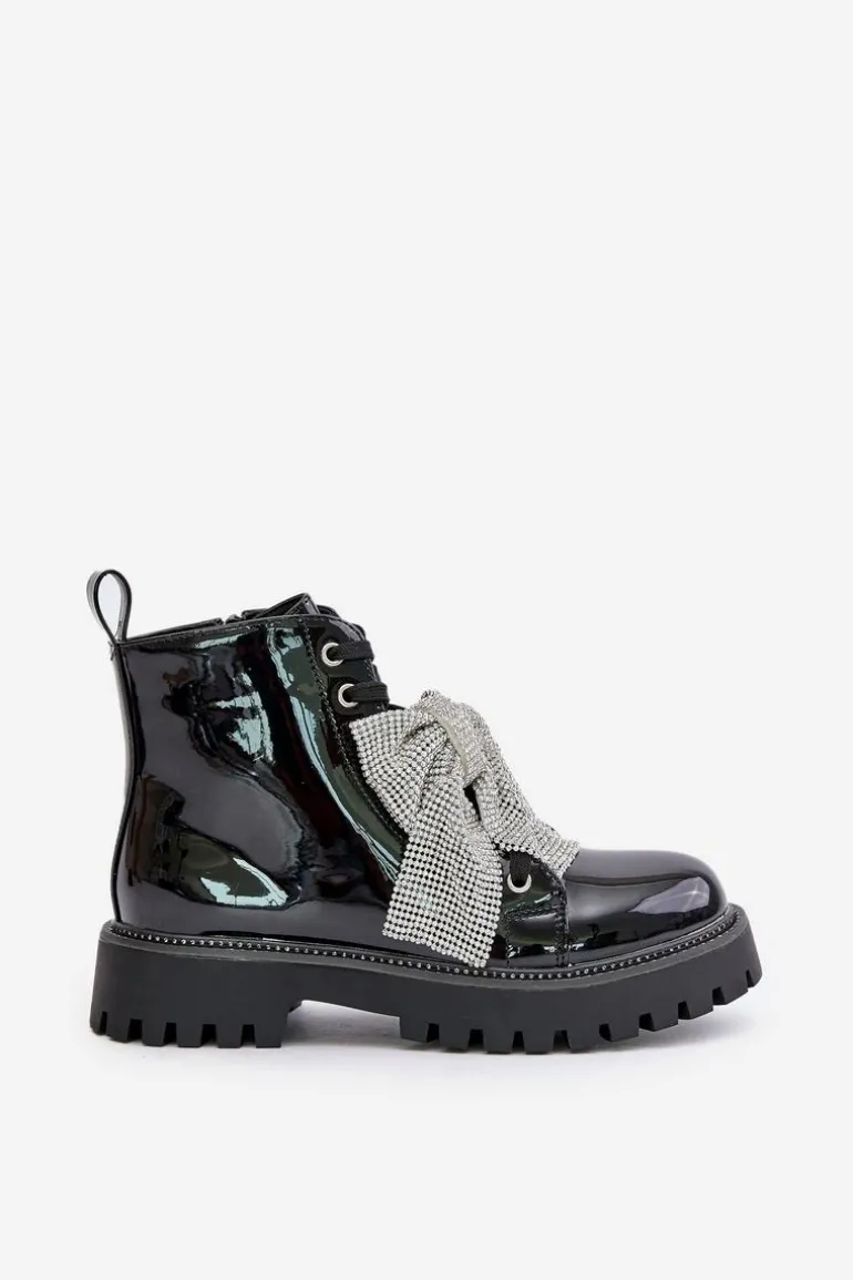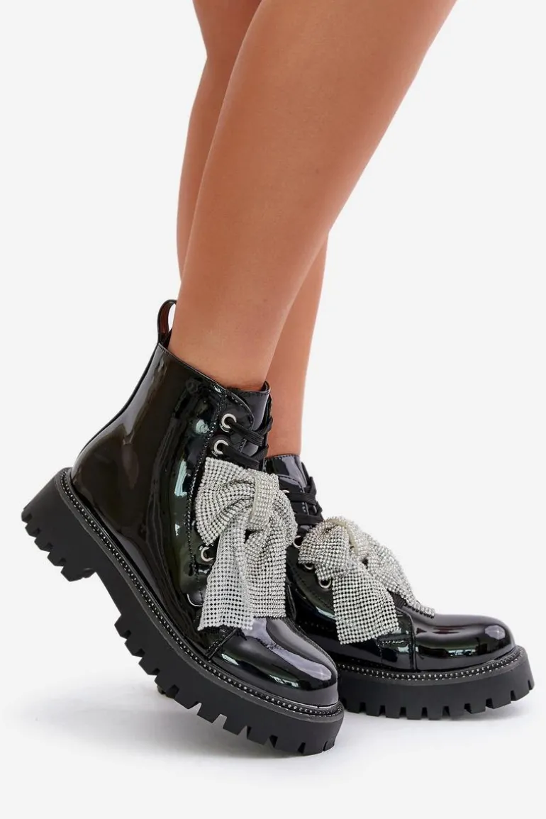 Botki na płaskim obcasie łączą w sobie wygodę i styl, idealnie wpisując się w codzienne i wyjątkowe stylizacje. Zaokrąglone noski nadają im klasyczny wygląd. Zapięcie na zamek ułatwia szybkie zakładanie, a dodatkowe sznurowanie pozwala na idealne dopasowanie do stopy. Główną zaletą tego modelu jest kokarda z cyrkoniami umieszczona z przodu, która dodaje eleganckiego i kobiecego akcentu, przyciągając wzrok i podkreślając wyjątkowość tego obuwia. Przy wyborze rozmiaru prosimy sugerować się tabelą rozmiarów.