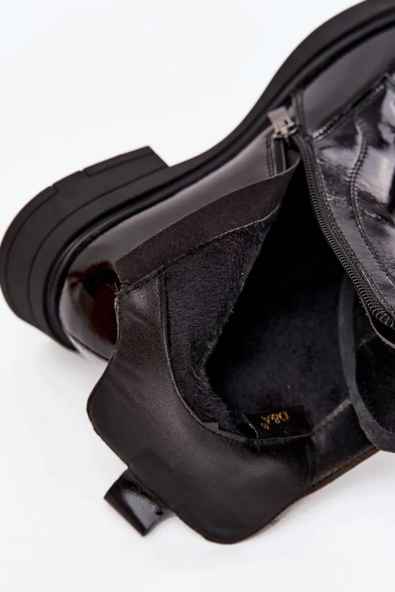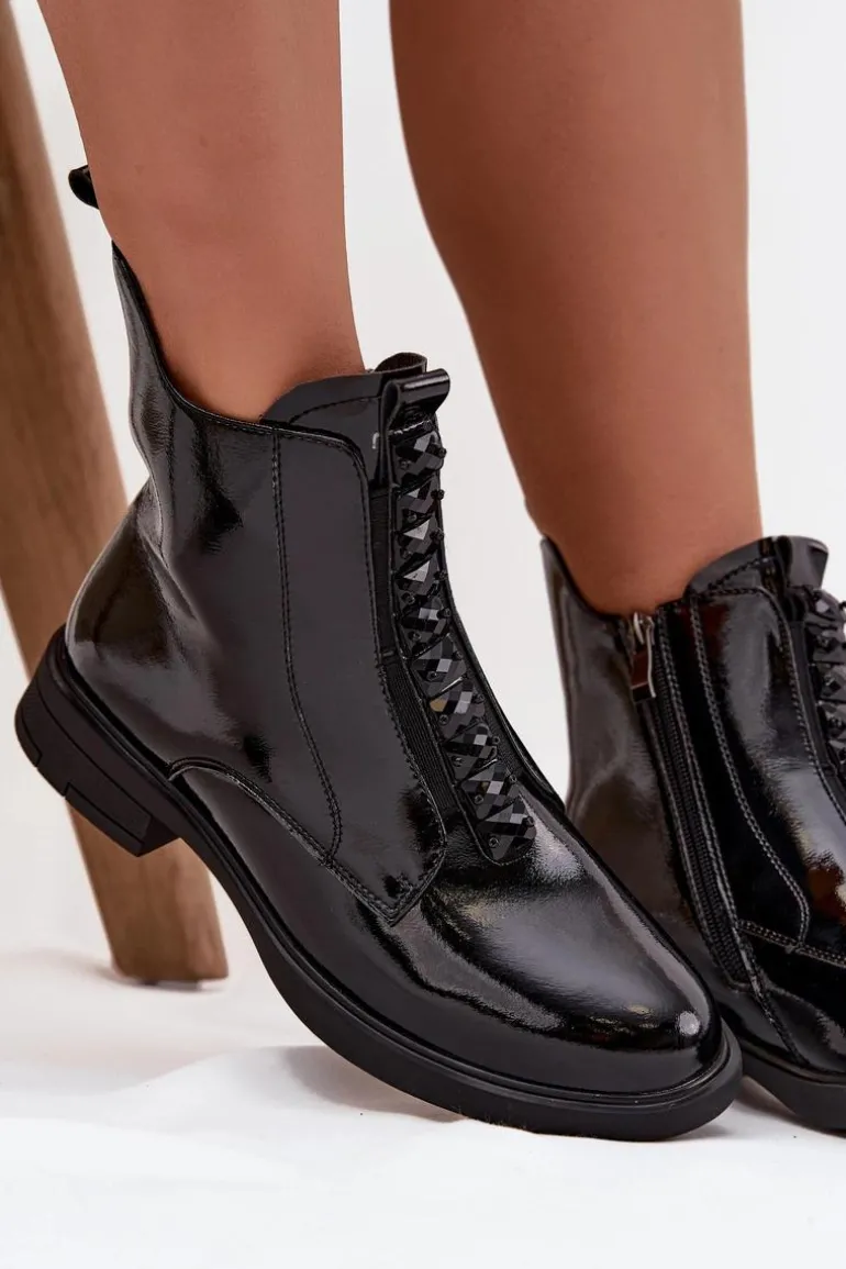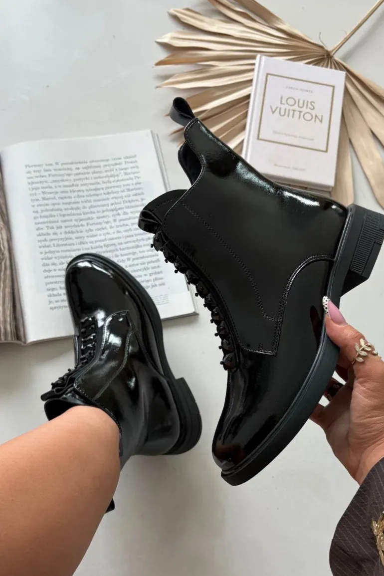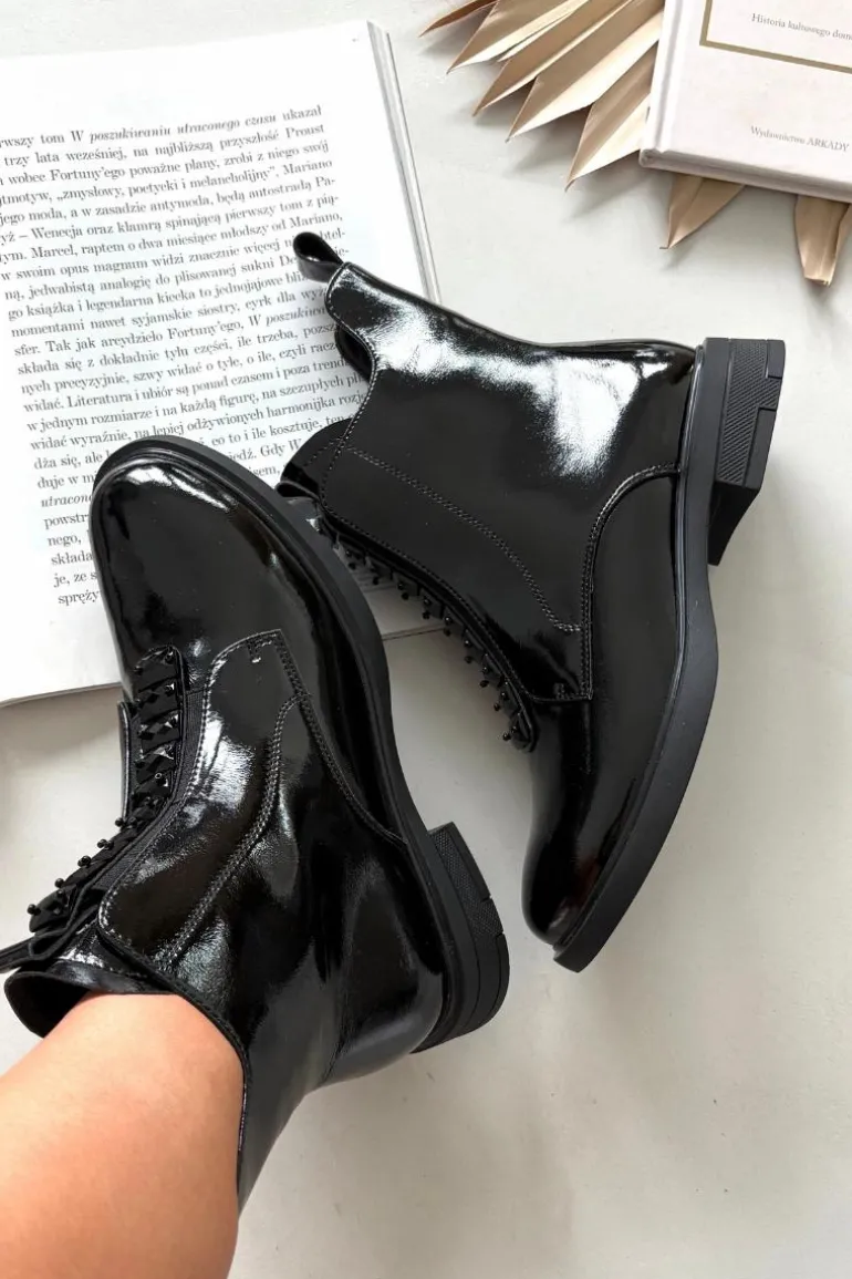 Botki damskie wykonane z naturalnej, lakierowanej skóry to propozycja dla kobiet ceniących elegancję i nowoczesny styl. Lśniąca powierzchnia materiału nadaje im wyjątkowego charakteru, sprawiając, że buty staną się wyrazistym akcentem każdej stylizacji. Model zapinany jest na zamek, który ułatwia zakładanie i zdejmowanie. Zaokrąglone noski podkreślają klasyczną linię buta, a ozdobne detale umieszczone z przodu dodają całości subtelnej oryginalności. Botki te świetnie sprawdzą się zarówno na co dzień, jak i podczas wyjątkowych okazji, doskonale uzupełniając zarówno casualowe, jak i eleganckie zestawy. Przy wyborze rozmiaru prosimy sugerować się tabelą rozmiarów.