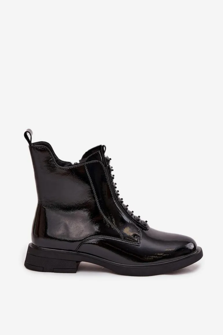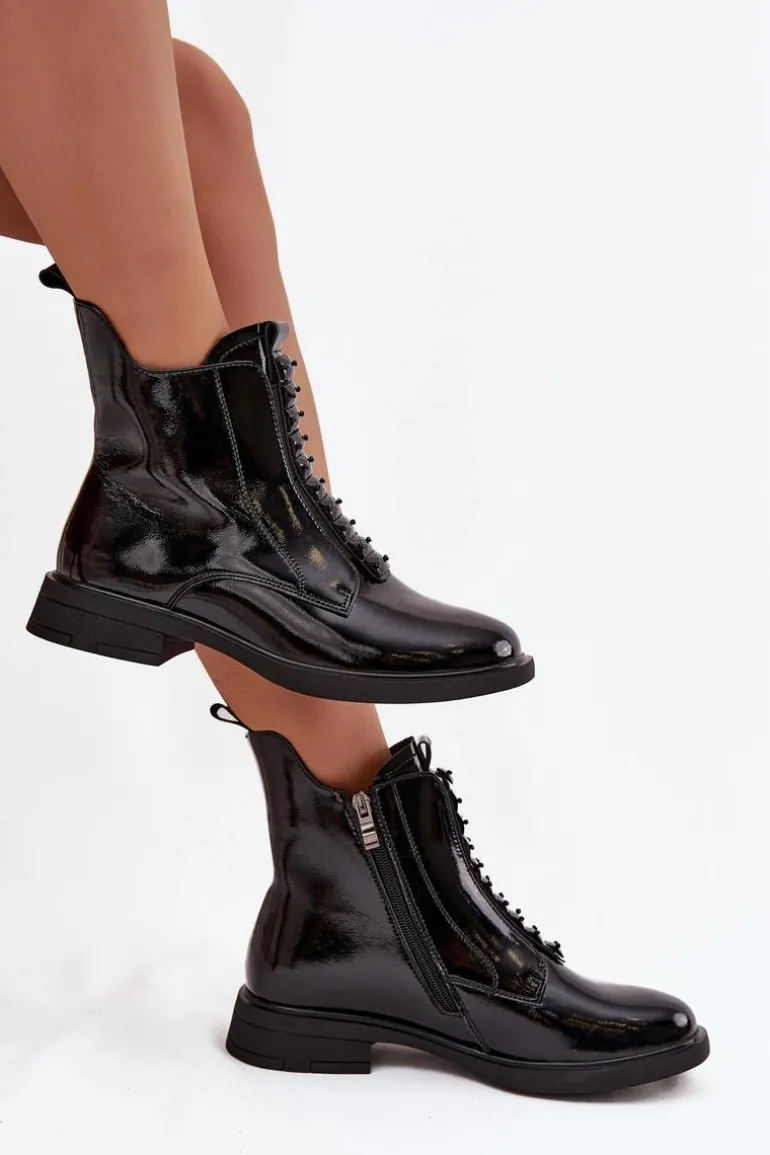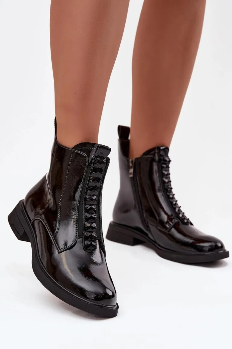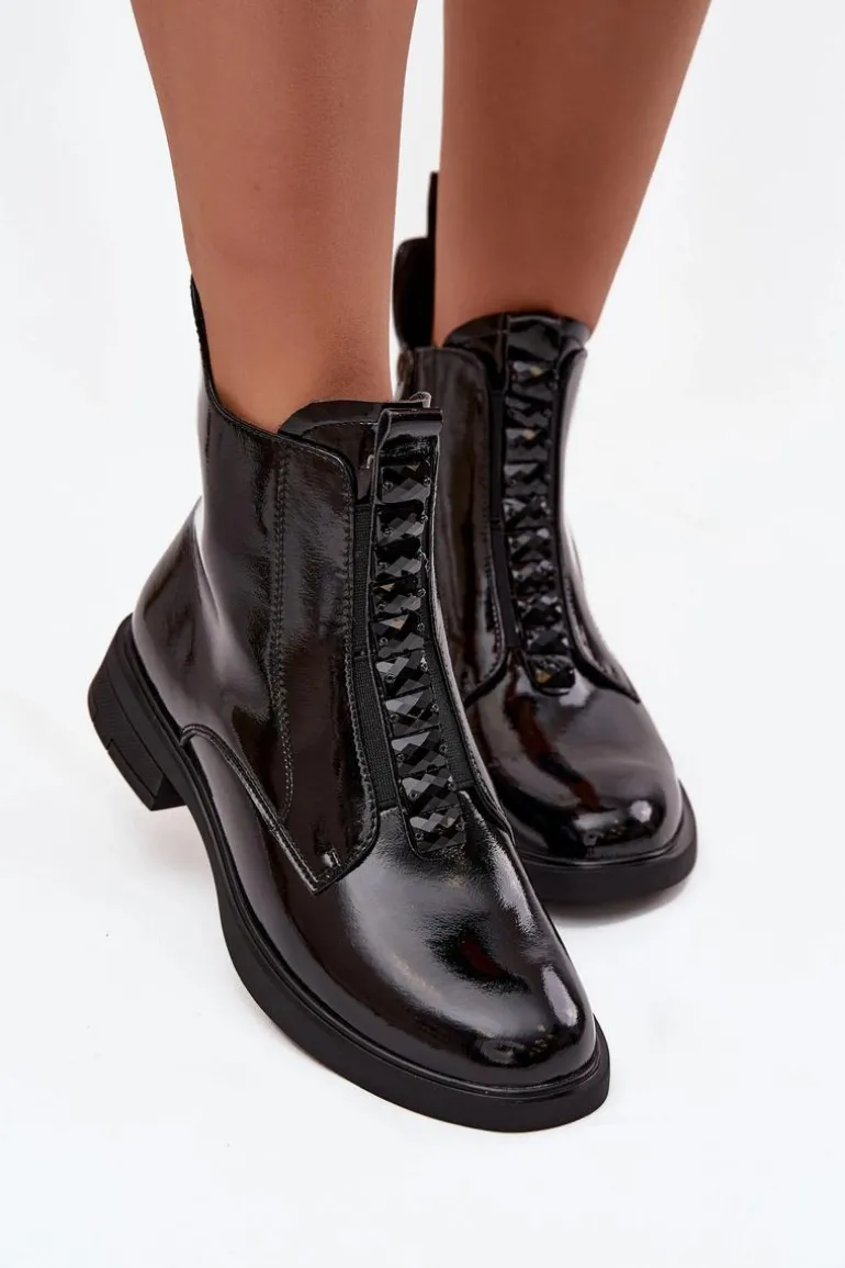 Botki damskie wykonane z naturalnej, lakierowanej skóry to propozycja dla kobiet ceniących elegancję i nowoczesny styl. Lśniąca powierzchnia materiału nadaje im wyjątkowego charakteru, sprawiając, że buty staną się wyrazistym akcentem każdej stylizacji. Model zapinany jest na zamek, który ułatwia zakładanie i zdejmowanie. Zaokrąglone noski podkreślają klasyczną linię buta, a ozdobne detale umieszczone z przodu dodają całości subtelnej oryginalności. Botki te świetnie sprawdzą się zarówno na co dzień, jak i podczas wyjątkowych okazji, doskonale uzupełniając zarówno casualowe, jak i eleganckie zestawy. Przy wyborze rozmiaru prosimy sugerować się tabelą rozmiarów.