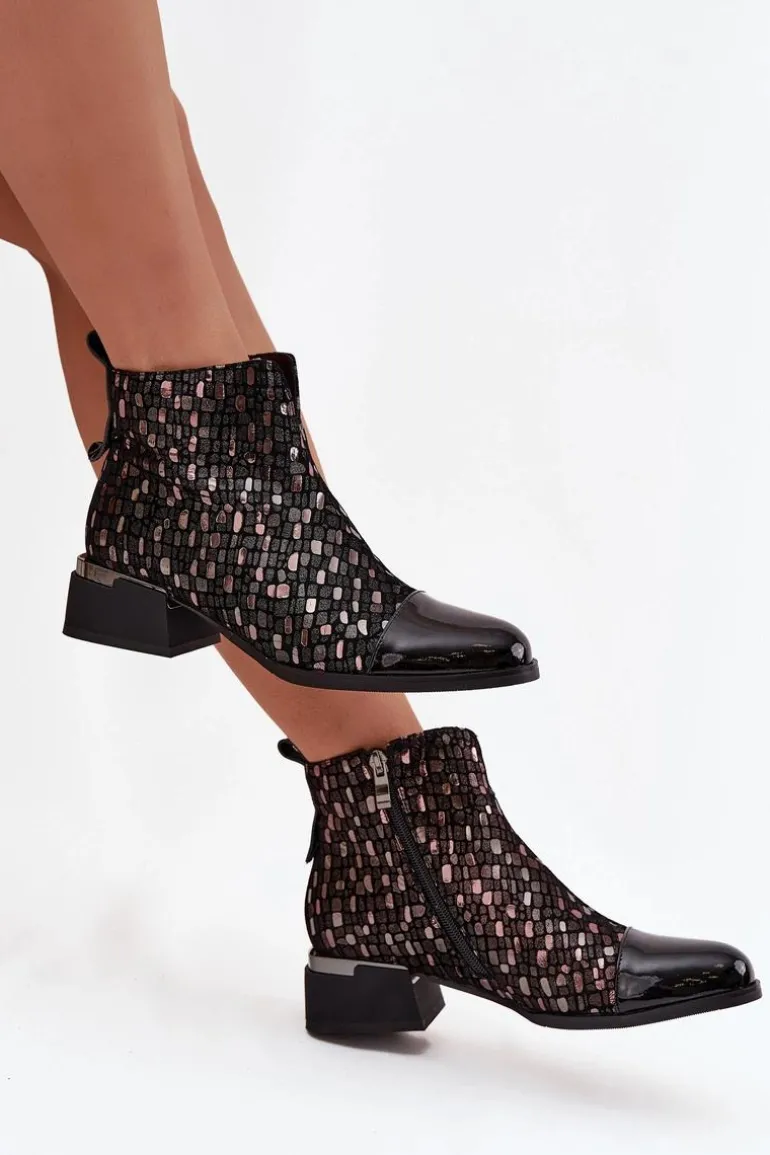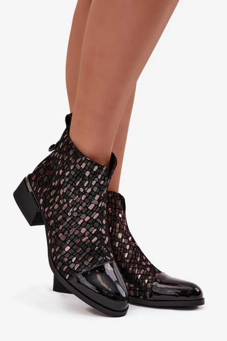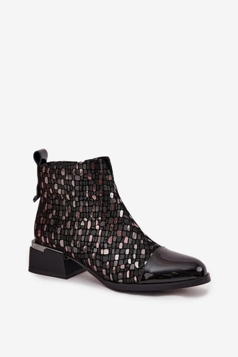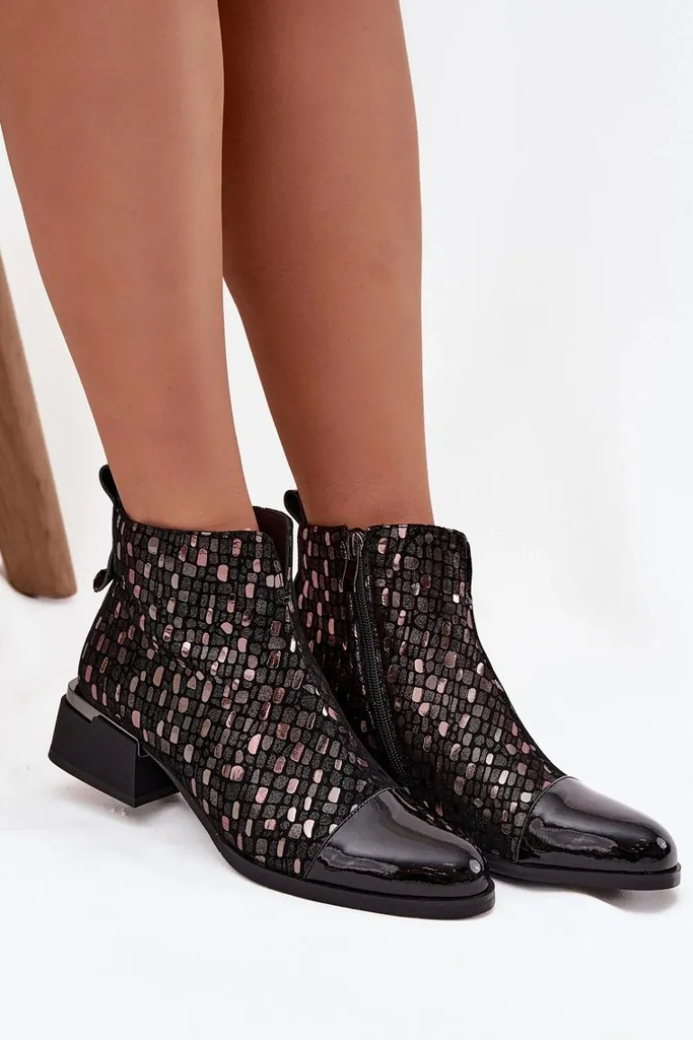 Eleganckie botki damskie wykonane z połączenia lakierowanej skóry naturalnej i zamszu to wyjątkowa propozycja dla kobiet, które cenią sobie oryginalny styl i wysoką jakość. Zestawienie dwóch rodzajów materiałów nadaje wyrazistego charakteru, a błyszczący wzór na cholewce przyciąga uwagę i podkreśla ich elegancję. Model został osadzony na stabilnym obcasie w formie klocka, który delikatnie unosi sylwetkę, zapewniając przy tym wygodę noszenia przez cały dzień. Wnętrze ocieplone kocem obuwniczym gwarantuje komfort termiczny w chłodniejsze dni, dzięki czemu botki świetnie sprawdzą się w sezonie jesienno-zimowym. To obuwie, które znakomicie dopełni zarówno codzienne stylizacje z jeansami, jak i bardziej wyrafinowane zestawy ze spódnicą czy sukienką, dodając im elegancji. Przy wyborze rozmiaru prosimy sugerować się tabelą rozmiarów.