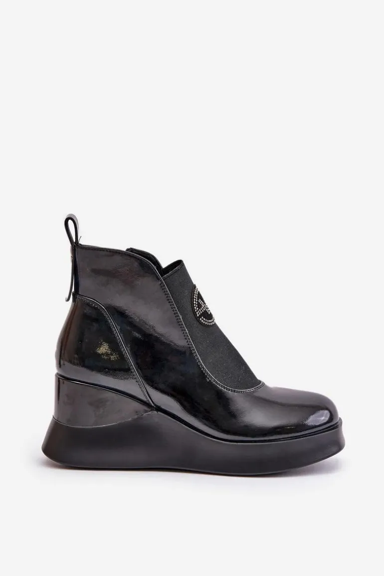 Botki damskie wykonane z naturalnej skóry. Osadzone na koturnie i platformie. Zapinane na suwak z boku. Na cholewce elastyczna wstawka oraz małe zdobienie. Noski zaokrąglone. Środek ocieplony kocem obuwniczym. Model ten to idealny wybór dla kobiet, które poszukują modnych, a zarazem wygodnych butów na co dzień! Przy wyborze rozmiaru prosimy sugerować się tabelą rozmiarów.