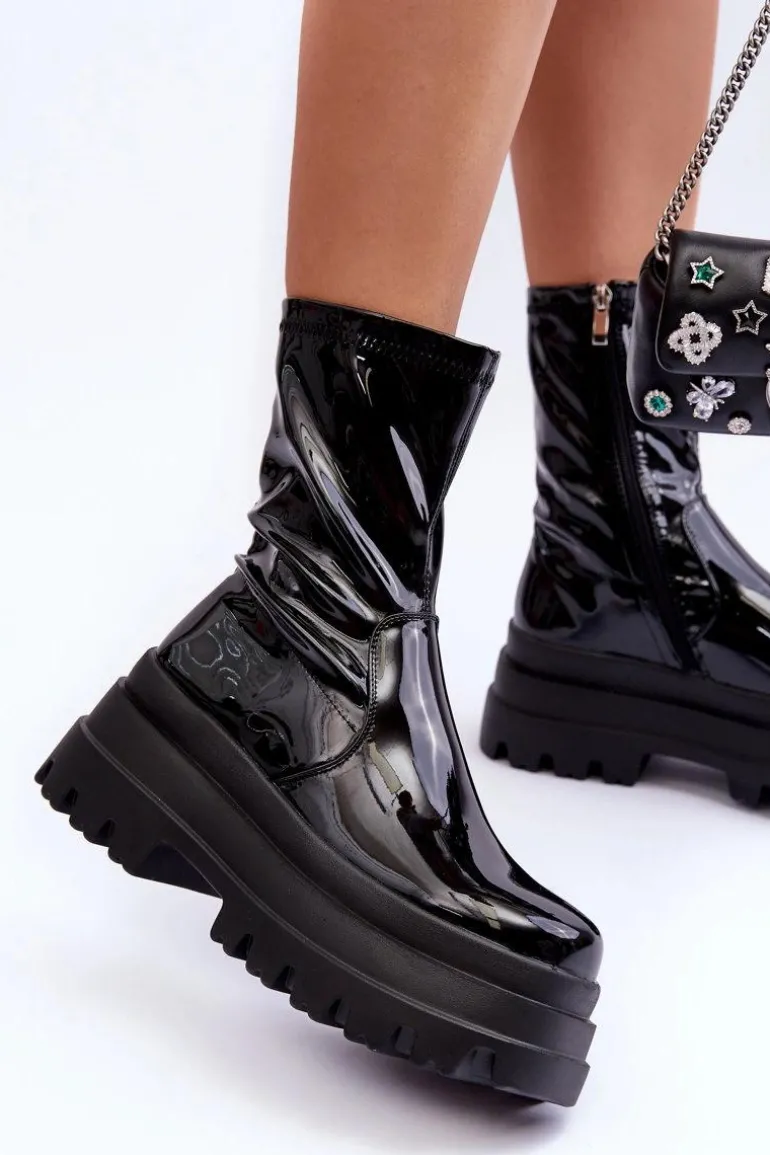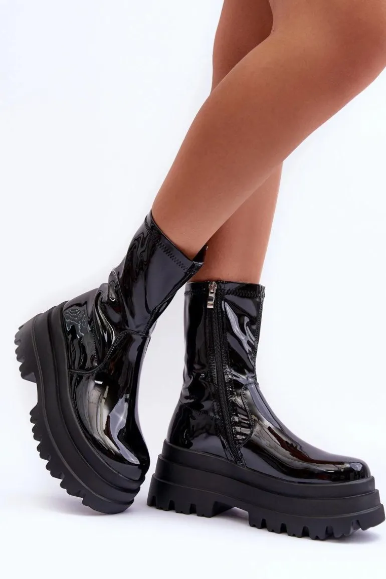 Botki damskie z lakierowanej eko skóry to doskonała propozycja na chłodniejsze dni. Osadzone na masywnej platformie, zapewniają stabilność i dodatkową wysokość. Zapinane na zamek, ułatwiają zakładanie, a zaokrąglone noski dodają im subtelnego charakteru. Wnętrze ocieplone kocem obuwniczym tylko na wysokości stopy gwarantuje ciepło, a jednocześnie pozwala na swobodę ruchu. Koniecznie powinnaś je mieć w swojej jesienno-zimowej szafie! Przy wyborze rozmiaru prosimy sugerować się tabelą rozmiarów.