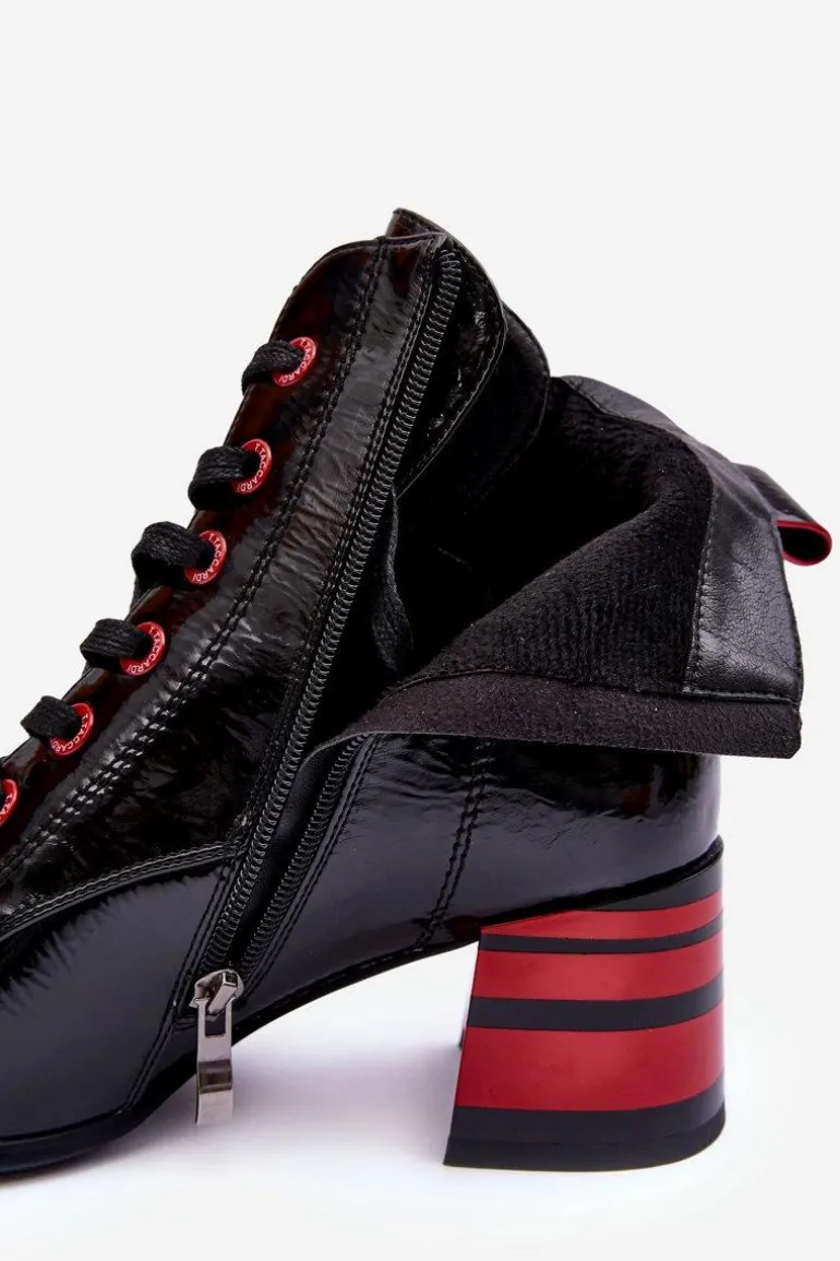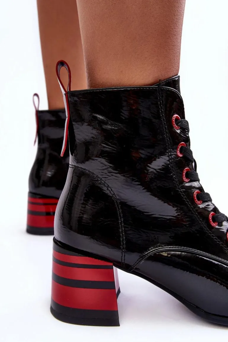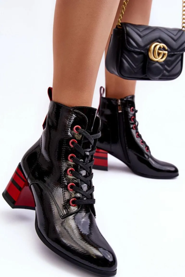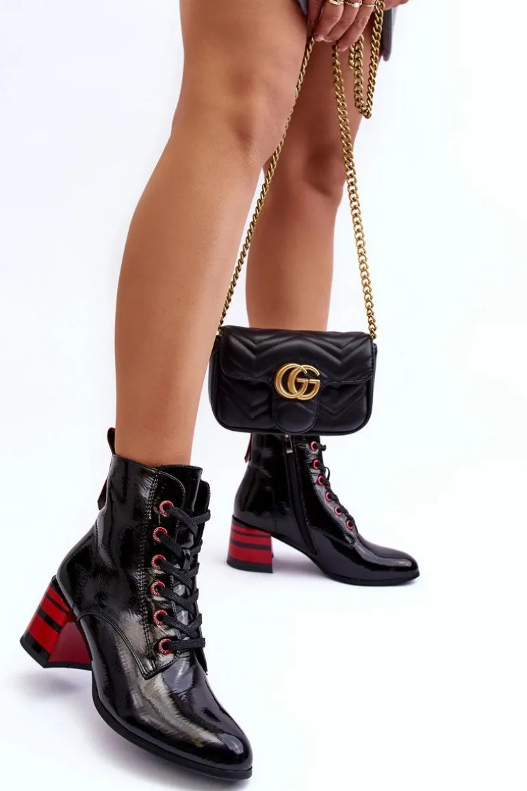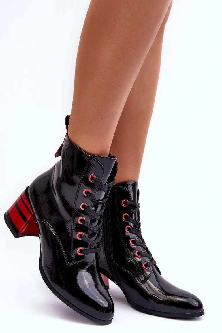 Botki damskie wykonane z eko skóry. Zapinane na suwak z boku cholewki oraz dodatkowo posiadają sznurowanie. Obcas ozdobiony paskami. Noski w migdał. Miękka wkładka zapewni komfort podczas użytkowania. Środek ocieplony kocem obuwniczym. Dodatkowo zapiętek jest usztywniony. Przy wyborze rozmiaru prosimy sugerować się tabelą rozmiarów.