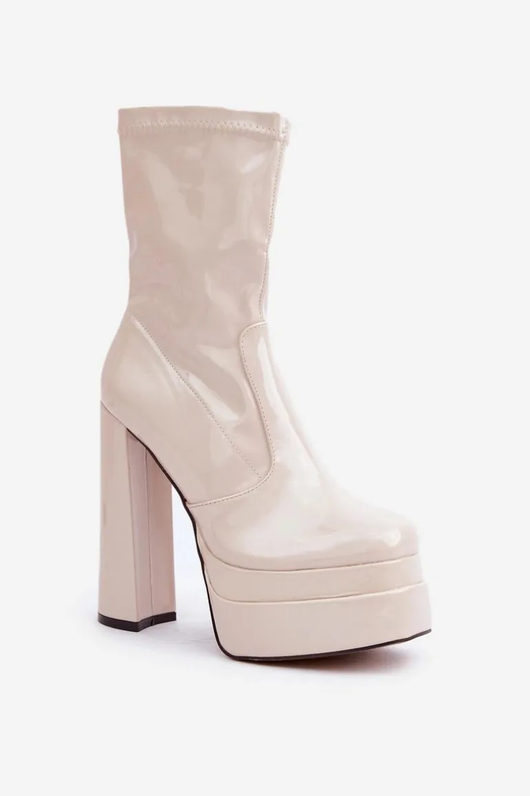 Stylowe botki damskie lakierowane, osadzone na wysokim obcasie typu słupek oraz platformie, które zapewniają wygodę i stabilność. Model z zaokrąglonymi noskami, zapinany na zamek dla łatwego zakładania. Ocieplane na wysokości stopy, doskonałe na chłodniejsze dni. Model ten świetnie uzupełni różnorodne stylizacje. Przy wyborze rozmiaru prosimy sugerować się tabelą rozmiarów.