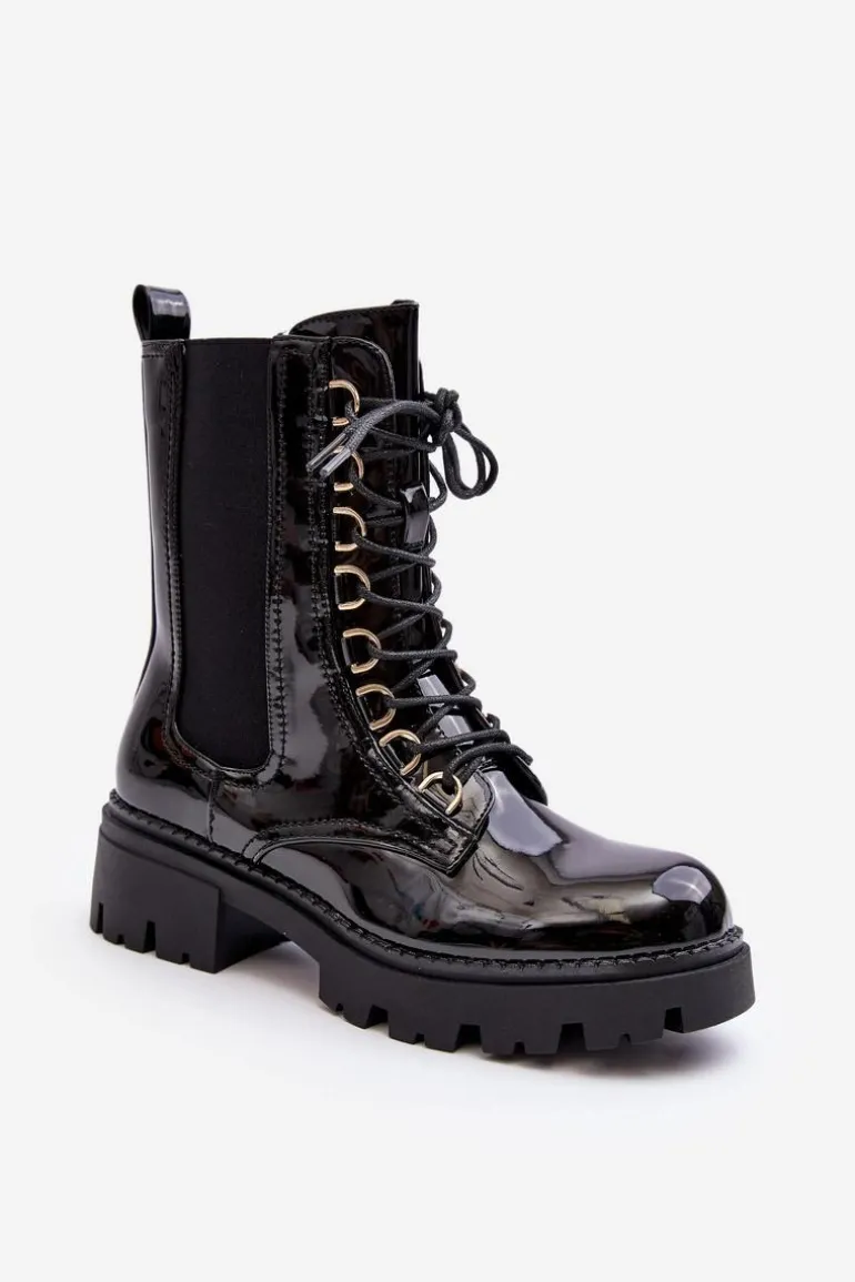 Damskie botki wykonane z eko skóry. Osadzone na płaskim obcasie. Na cholewce elastyczne wstawki. Noski zaokrąglone. Model ten zapinany jest na suwak z boku oraz dodatkowo posiada sznurowanie. Wnętrze ocieplone kocem obuwniczym. Świetny model do jesiennych i zimowych stylizacji! Przy wyborze rozmiaru prosimy sugerować się tabelą rozmiarów.