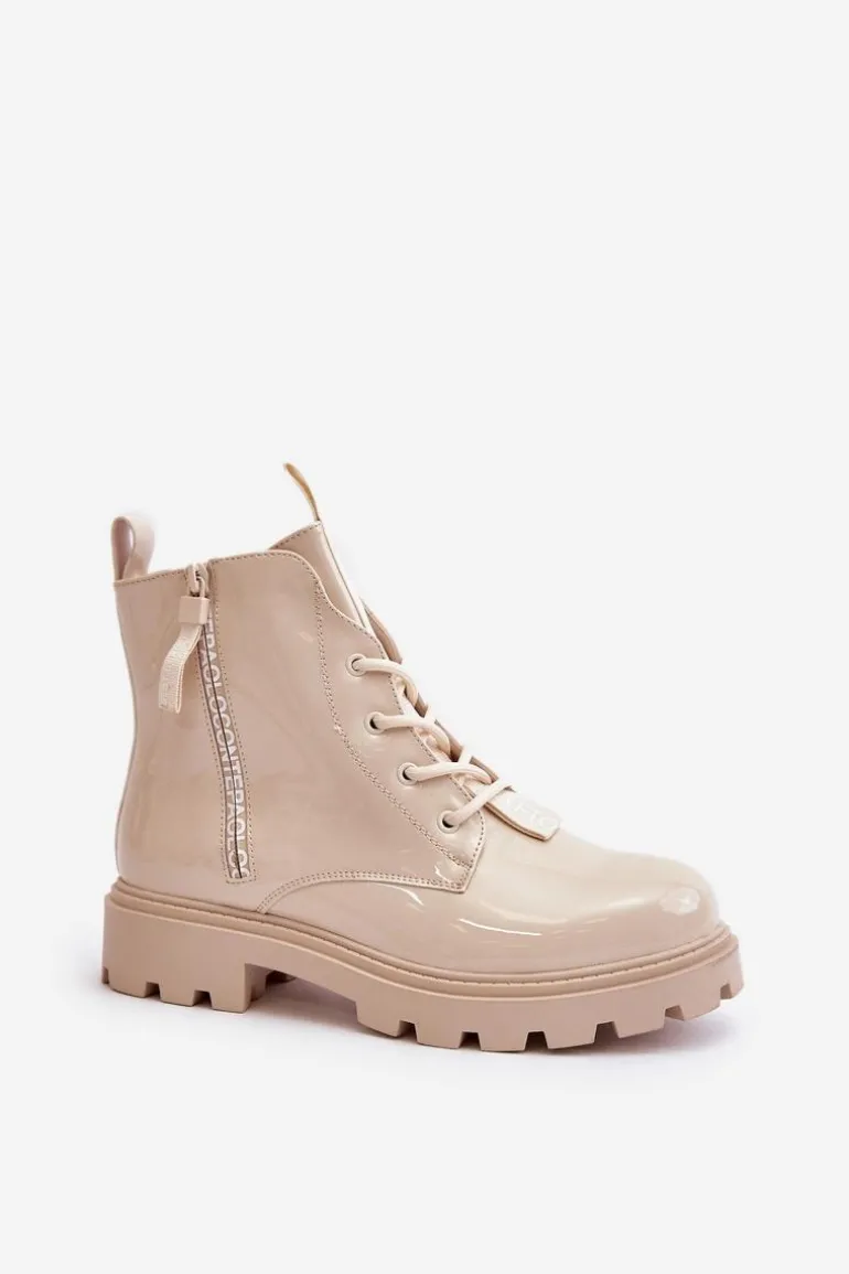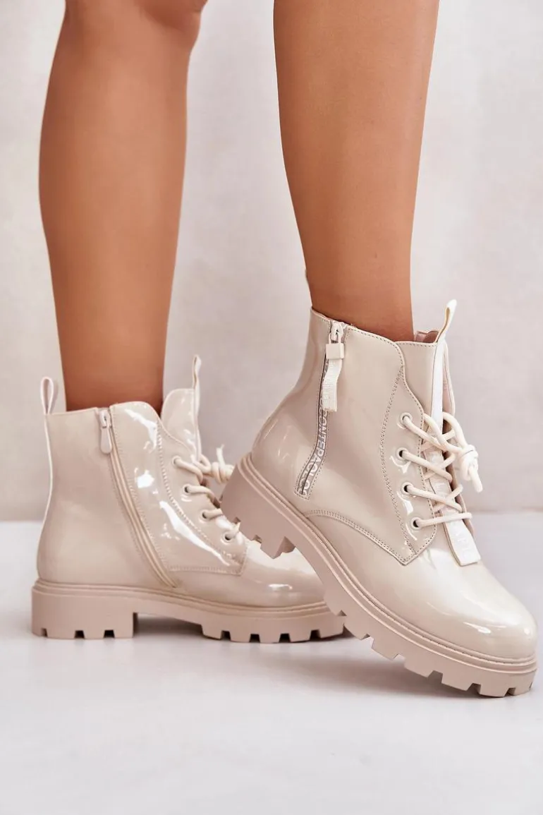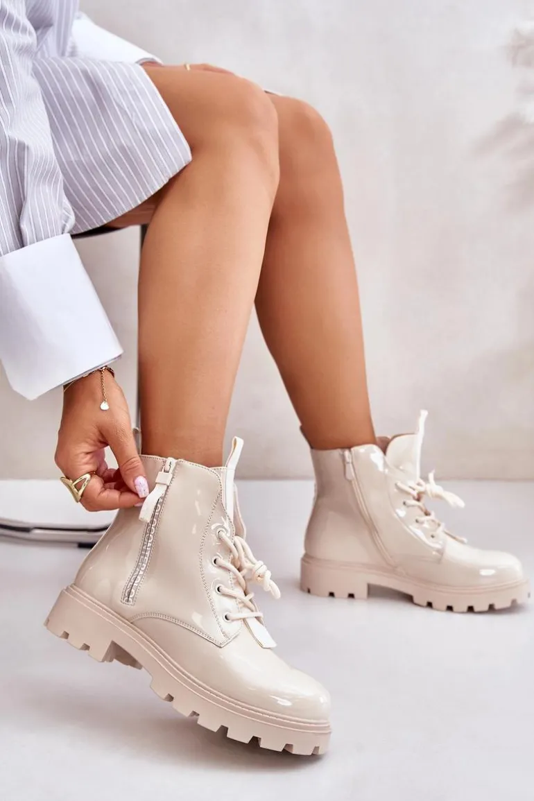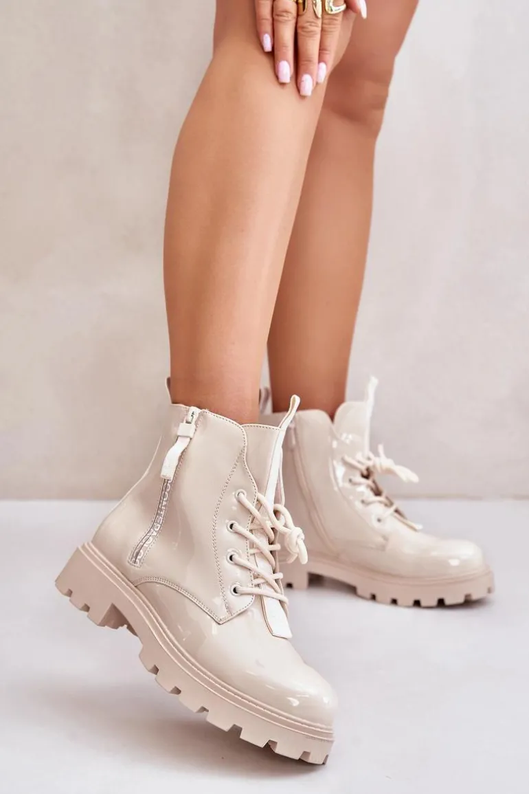 Lakierowane Botki Workery Damskie Ocieplane Z Napisami Beżowe Zinfreya
