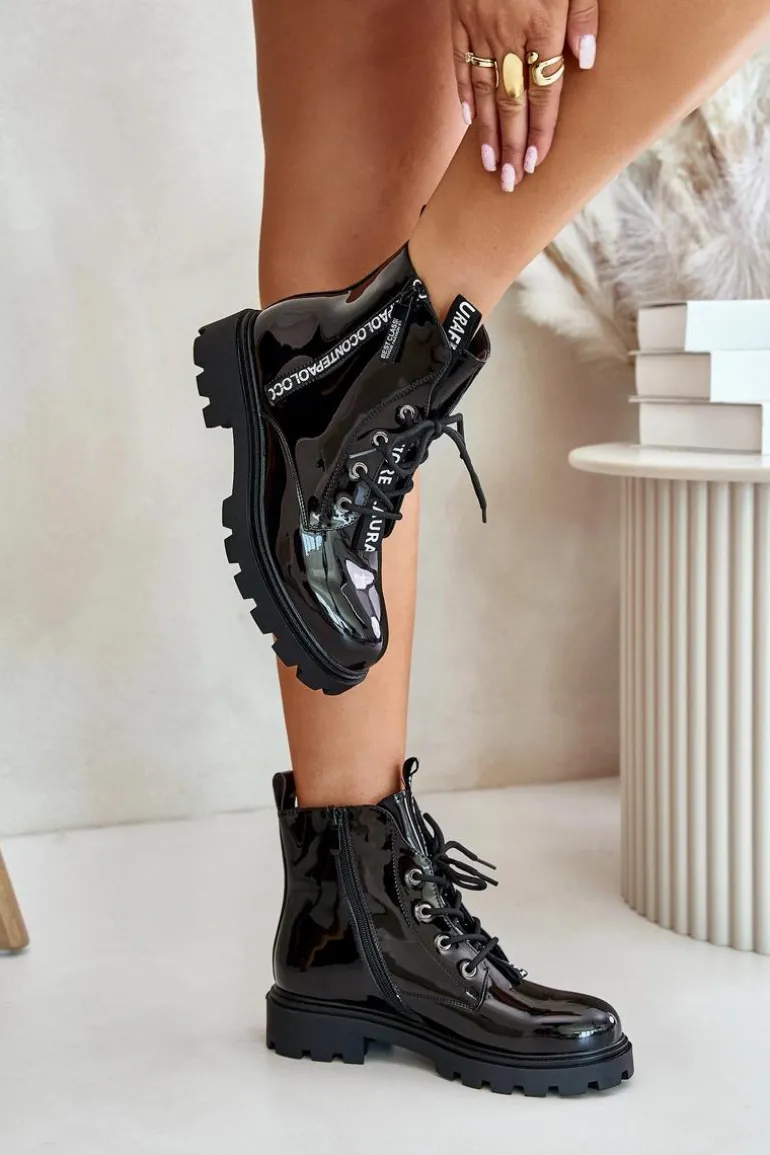 Stylowe botki damskie z ociepleniem, idealne na chłodne dni. Model zapinany na zamek oraz dodatkowo sznurowany, co zapewnia idealne dopasowanie. Cholewka ozdobiona modnymi napisami, dodającymi oryginalnego charakteru. Świetny wybór dla kobiet ceniących wygodę i modny wygląd. Przy wyborze rozmiaru prosimy sugerować się tabelą rozmiarów.
