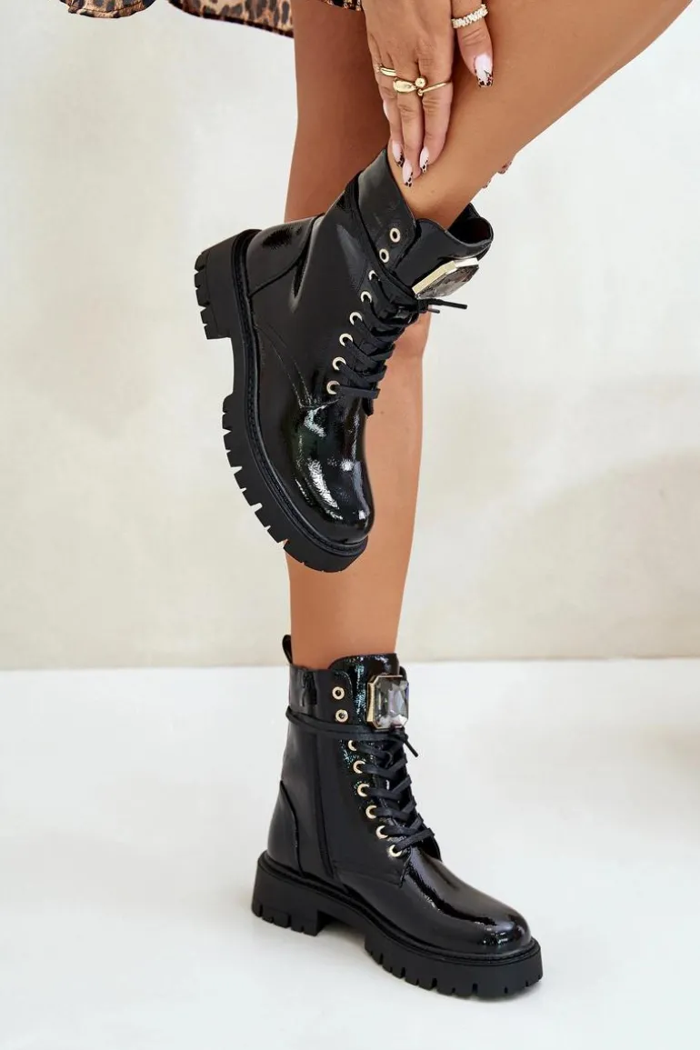 Te stylowe botki typu workery to idealne obuwie na chłodniejsze dni. Wykonane z eko skóry. Ocieplone wnętrze zapewnia komfort termiczny. Głównym atutem tego modelu jest biżuteryjna ozdoba na języku. Posiadają zamek błyskawiczny dla łatwego zakładania, jak i sznurowanie, które pozwala na idealne dopasowanie do stopy. Botki te doskonale sprawdzą się idealnie w codziennych stylizacjach, jak i podczas dłuższych spacerów na świeżym powietrzu. Przy wyborze rozmiaru prosimy sugerować się tabelą rozmiarów.