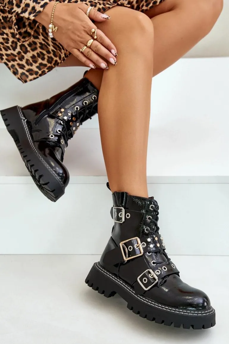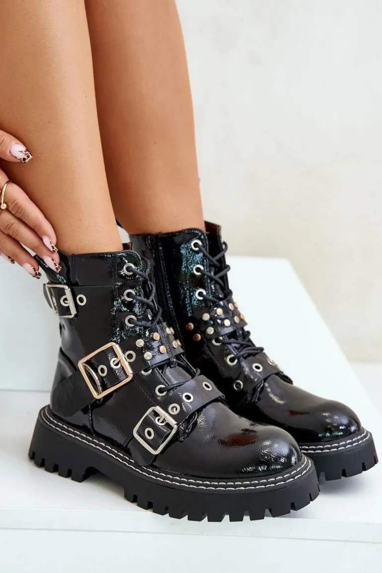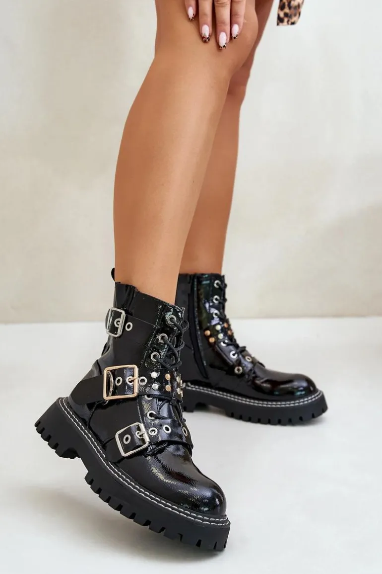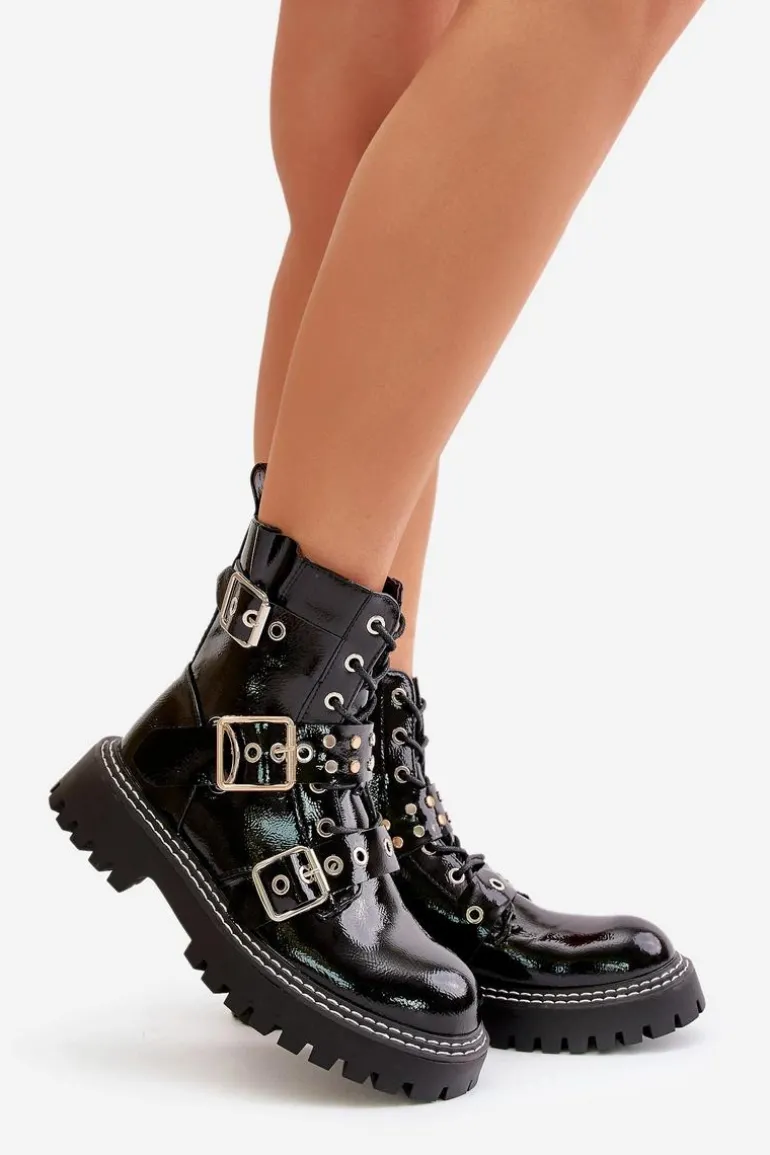 Botki damskie wykonane z eko skóry. Osadzone na płaskim obcasie. Zapinane na zamek. Noski zaokrąglone. Głównym atutem tego modelu są ozdobne paski z klamrami. Ten stylowy model wykorzystasz do wielu jesienno-zimowych stylizacji! Przy wyborze rozmiaru prosimy sugerować się tabelą rozmiarów.