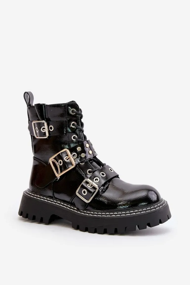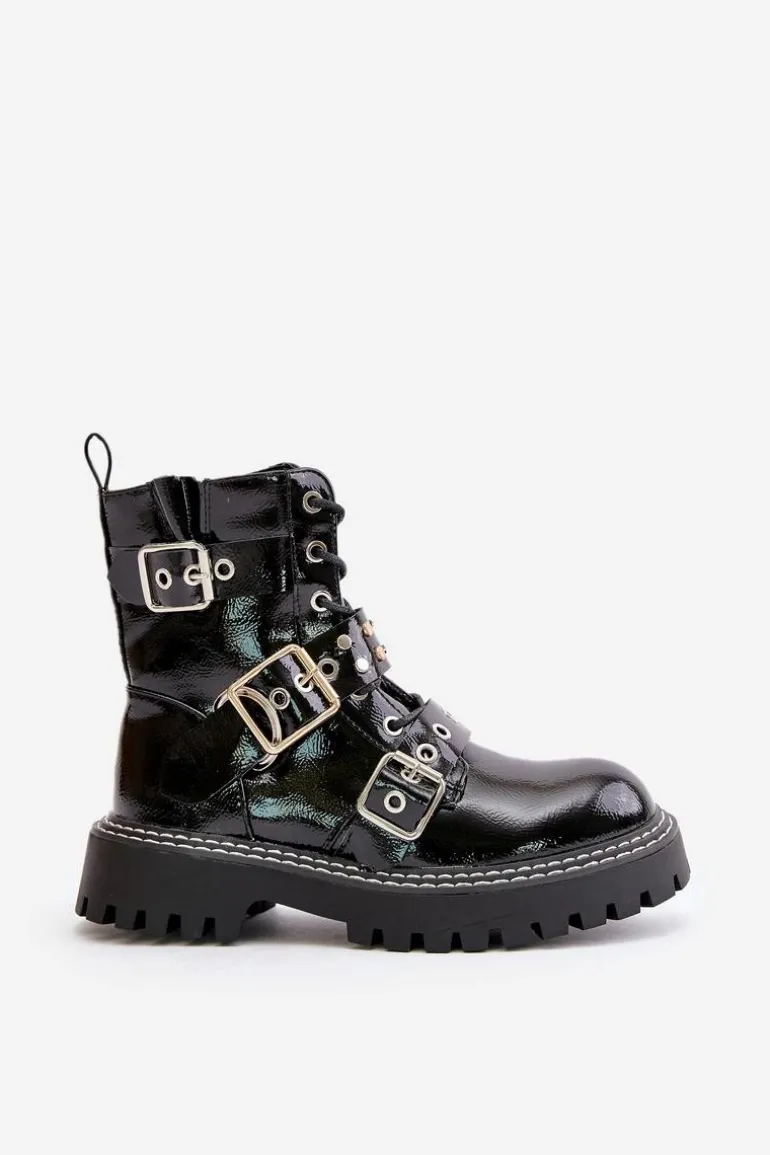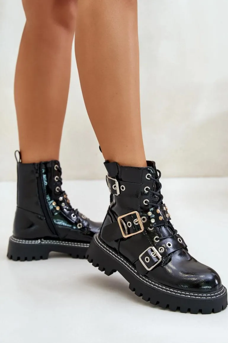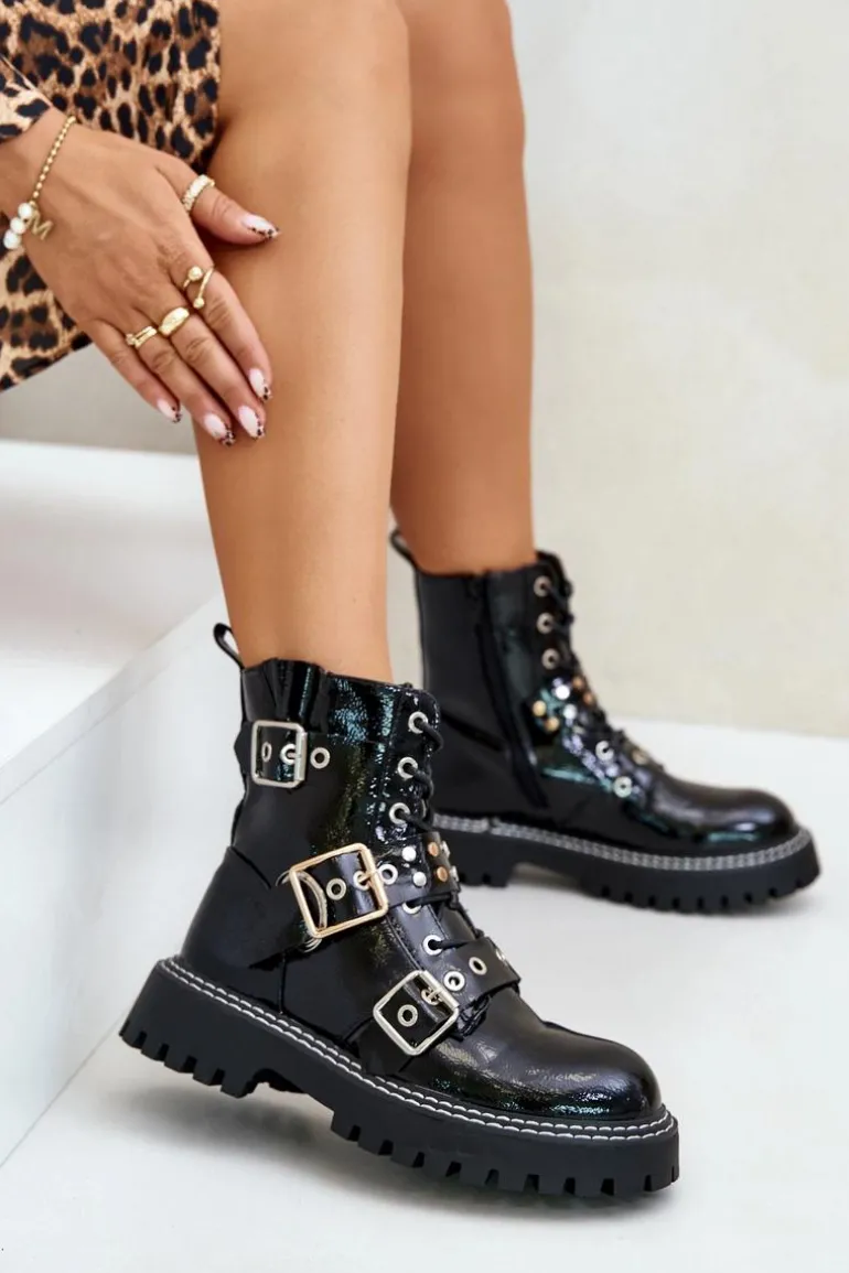 Botki damskie wykonane z eko skóry. Osadzone na płaskim obcasie. Zapinane na zamek. Noski zaokrąglone. Głównym atutem tego modelu są ozdobne paski z klamrami. Ten stylowy model wykorzystasz do wielu jesienno-zimowych stylizacji! Przy wyborze rozmiaru prosimy sugerować się tabelą rozmiarów.