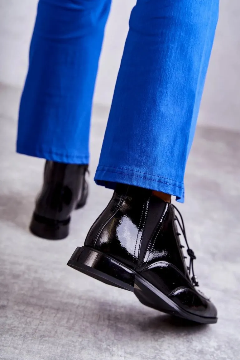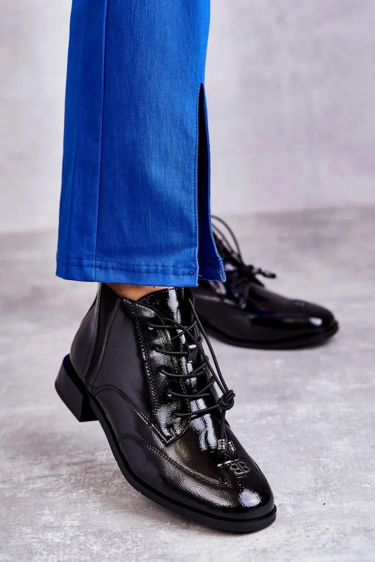 Te botki świetnie sprawdzą się podczas jesiennego sezonu! Wykonane z wysokiej jakości eko skóry z elastyczną wstawką z boku cholewki, dzięki której obuwie będzie lepiej dopasowane. Zapinane na suwak. Z przodu posiadają ściągacz, a przy nosku ozdobny element. Osadzone na płaskim obcasie. Dodatkowo zapiętek jest usztywniany. Środek został ocieplony miłym, w dotyku kocem obuwniczym. Przy wyborze rozmiaru prosimy sugerować się tabelą rozmiarów.