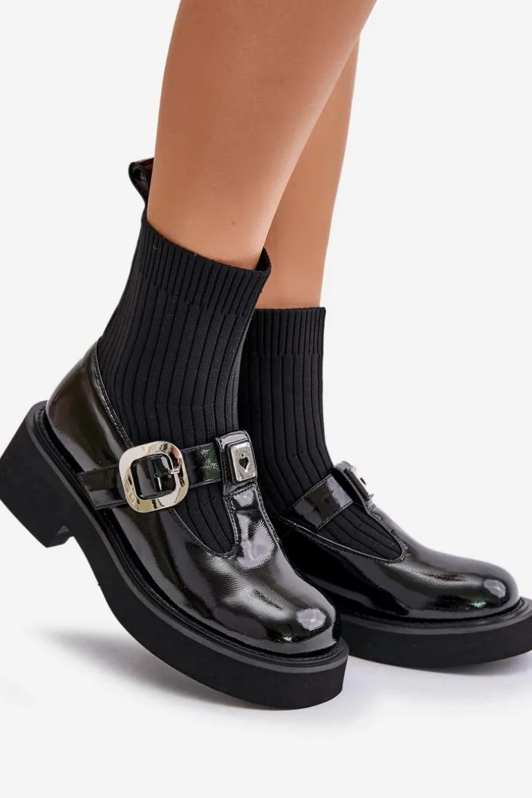 Lakierowane botki damskie osadzone na niskim, szerokim obcasie i platformie. Cholewka w formie skarpety, dodatkowo zdobiona stylowym paskiem z klamrą, nadaje im nowoczesny charakter. Środek ocieplony kocem obuwniczym wyłącznie na wysokości stopy. Idealne do miejskich stylizacji, łączą wygodę z modnym wyglądem. Przy wyborze rozmiaru prosimy sugerować się tabelą rozmiarów.