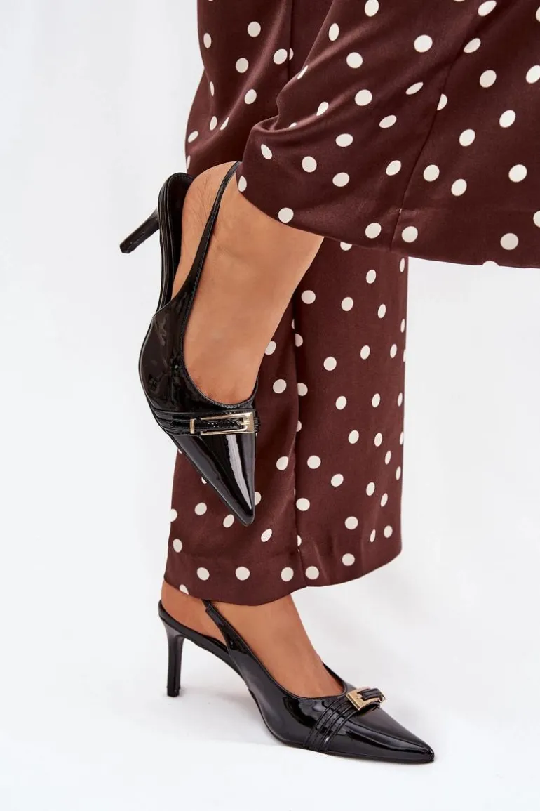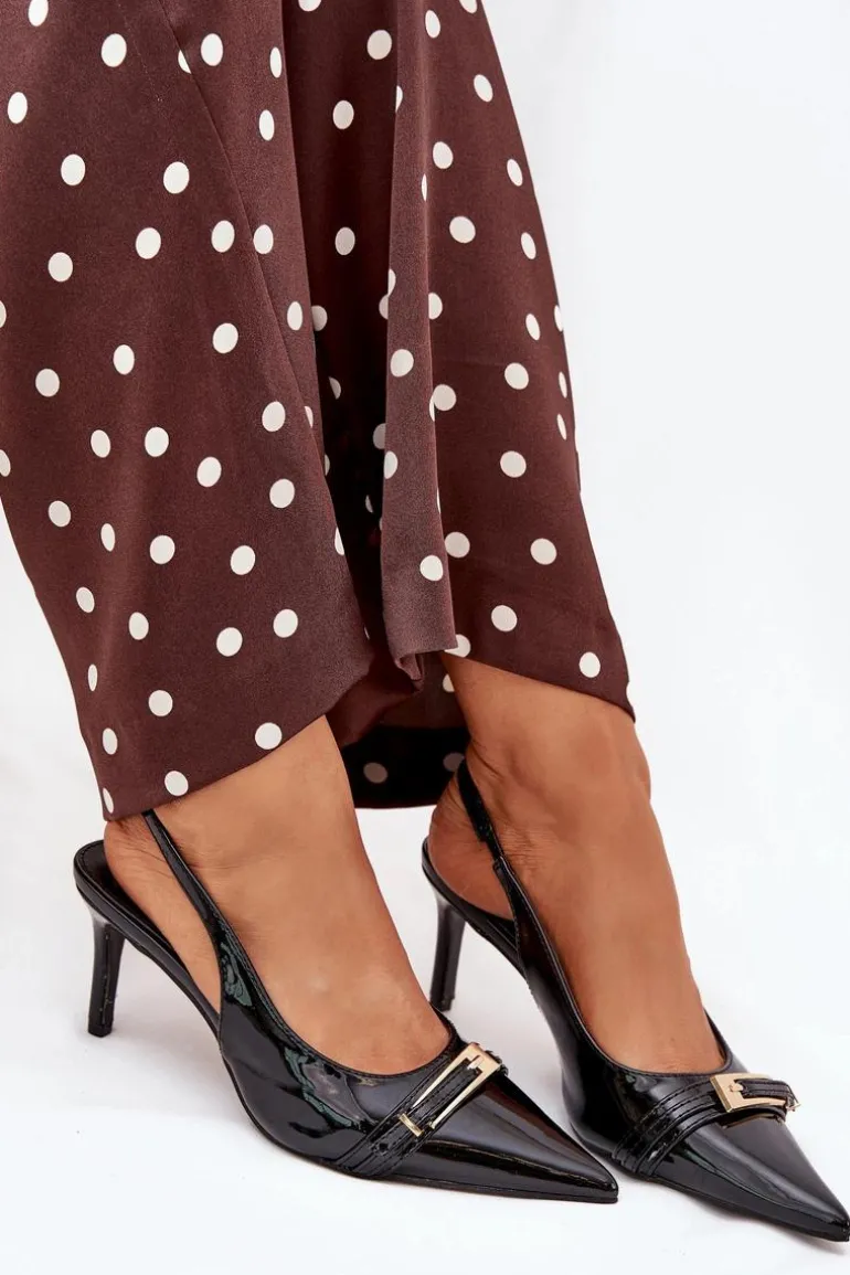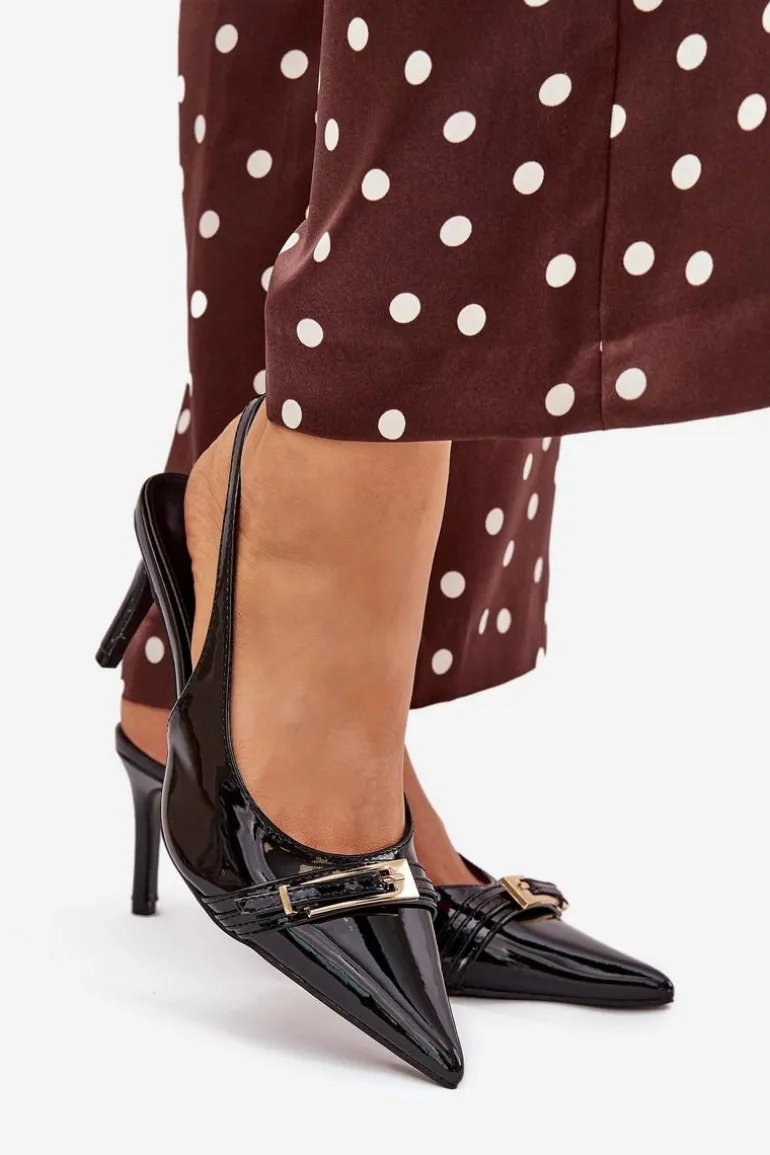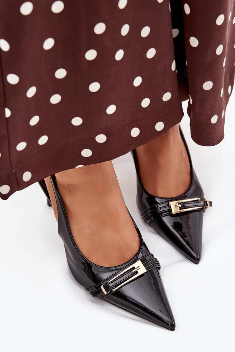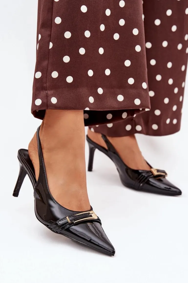 Stylowe i eleganckie czółenka z eko skóry, osadzone na obcasie w formie szpilki, to połączenie klasyki z nowoczesnym akcentem. Z przodu buta znajduje się paseczek ozdobiony złotą klamrą, który dodaje im wyjątkowego szyku. Szpiczaste noski optycznie wysmuklają nogi, nadając sylwetce elegancki wygląd. Idealne na wieczorne wyjścia, specjalne okazje lub eleganckie spotkania. Przy wyborze rozmiaru prosimy kierować się tabelą rozmiarów